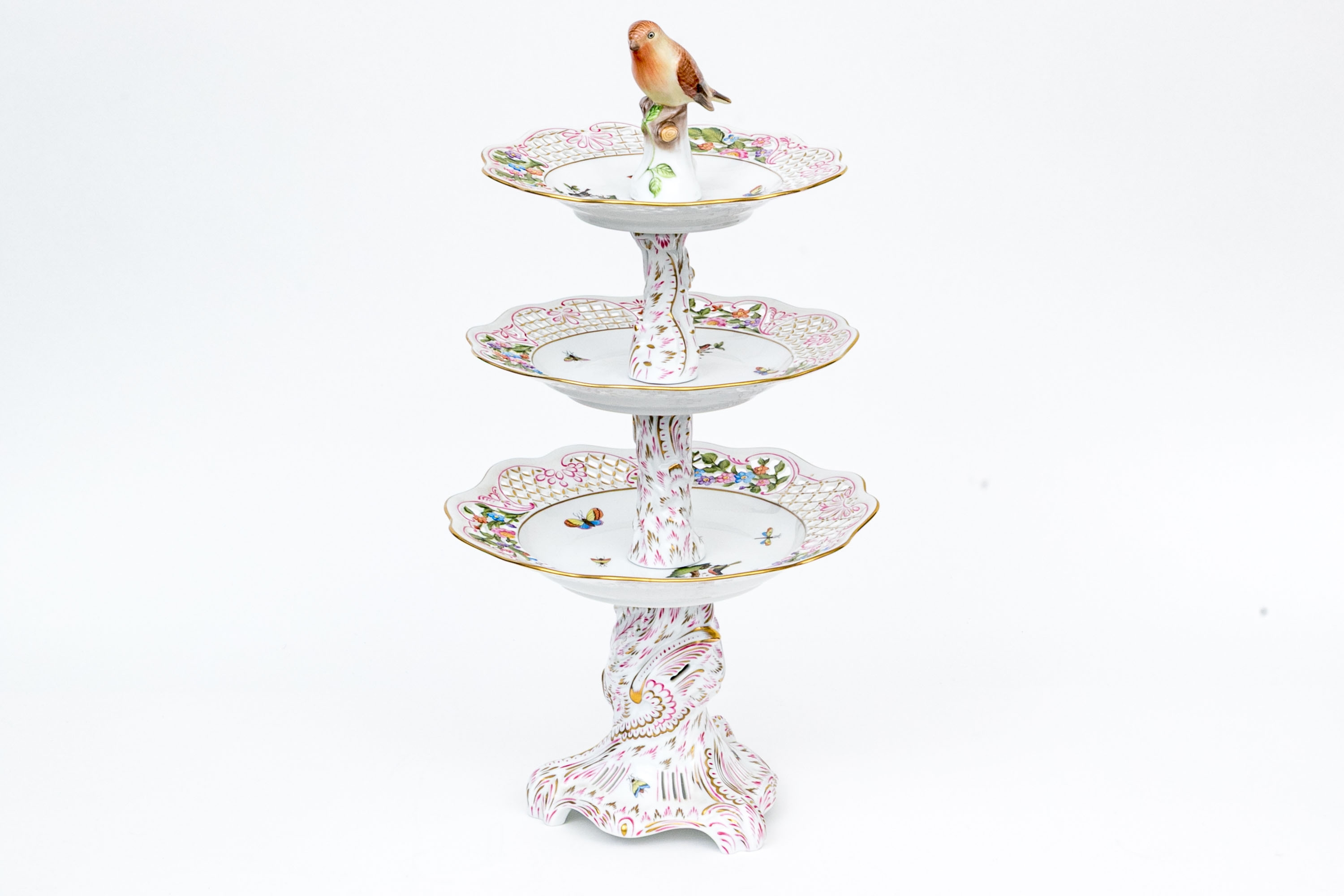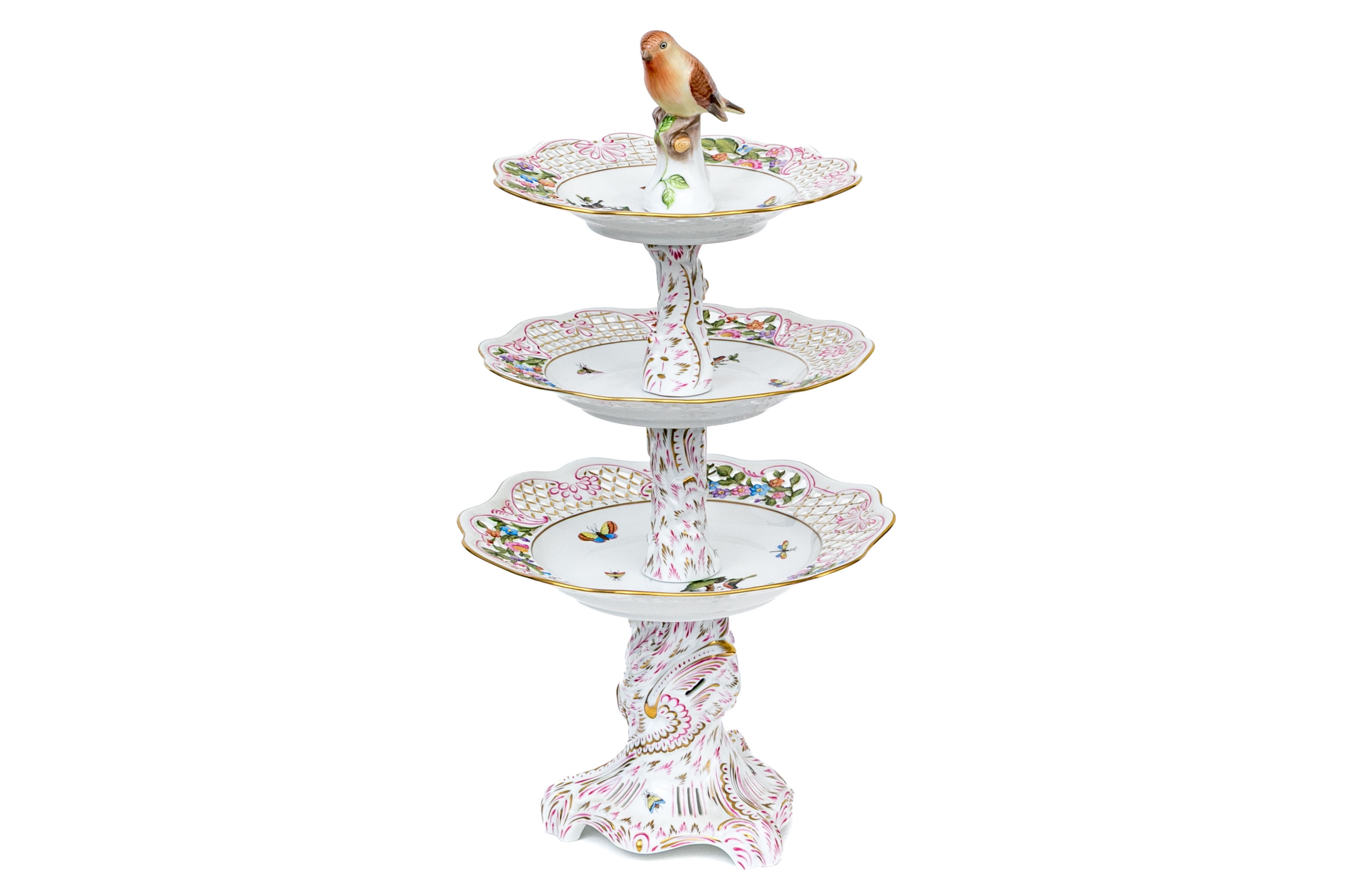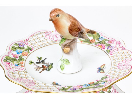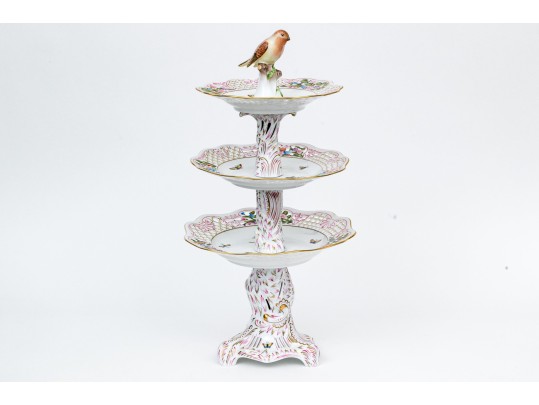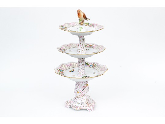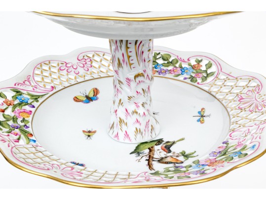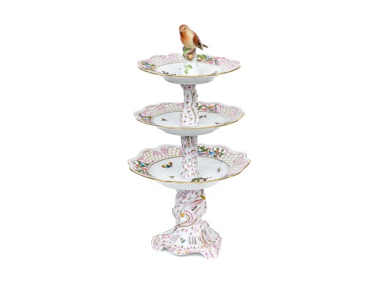 A magnificent and scarce Herend Hungary three-tier porcelain dessert stand, exquisitely hand-painted in the Rothschild Bird (RO) pattern, one of Herend’s most celebrated and historically significant designs. The piece features three scalloped trays in graduated sizes, each adorned with delicate lattice borders, lush floral garlands, and colorful butterflies, all centered with the Rothschild family’s iconic motif of songbirds (some with necklace) perched among branches. The tiers are supported by a beautifully twisted, rocaille-inspired stem, richly hand-decorated with gold and raspberry accents, and surmounted by a naturalistic bird finial modeled in the round — an especially rare and charming detail. Hand-painted throughout with remarkable precision and lifelike color, this server epitomizes Herend’s 19th-century craftsmanship and remains a pinnacle of the factory’s artistry today. The underside bears the Herend blue shield hallmark with crossed paintbrushes, the inscription HANDPAINTED, and model number 7575/LV CD 156, denoting both form and artist reference.