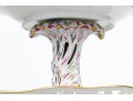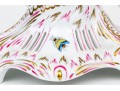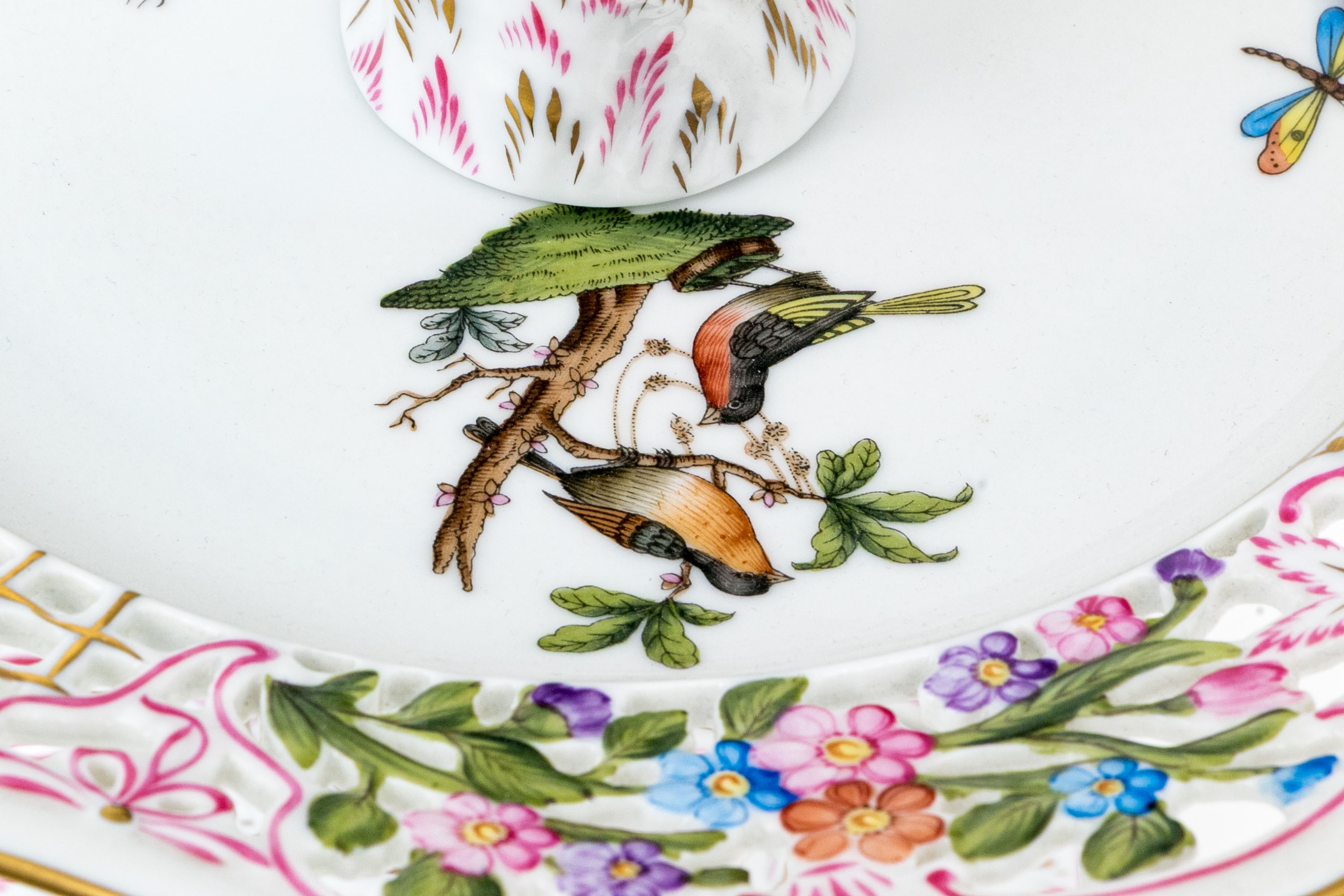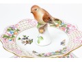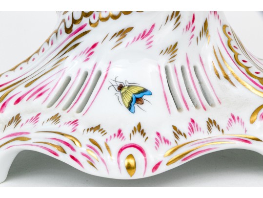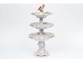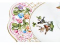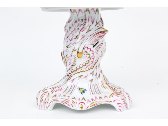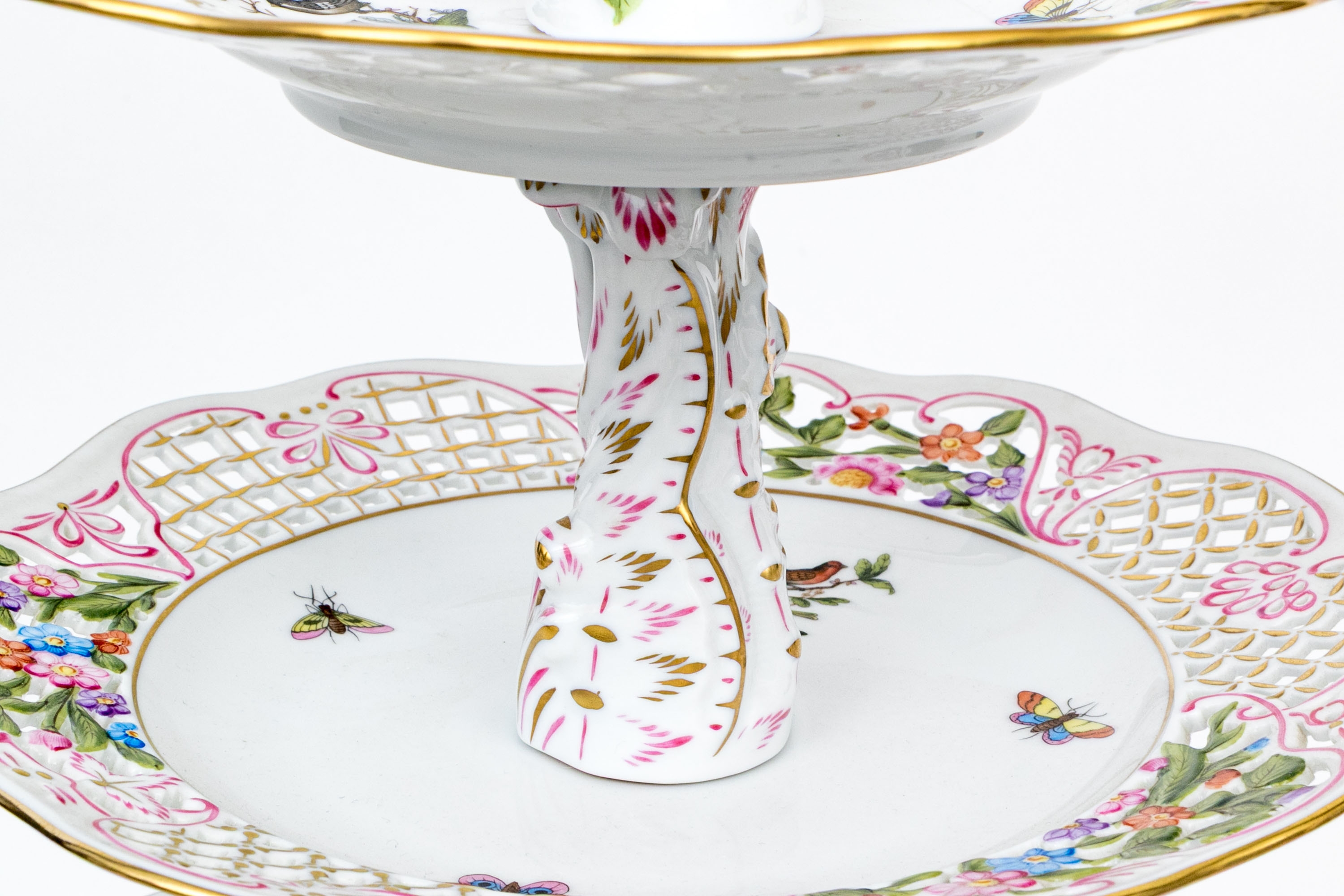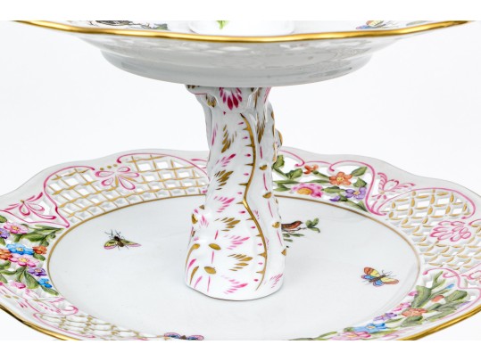 A magnificent and scarce Herend Hungary three-tier porcelain dessert stand, exquisitely hand-painted in the Rothschild Bird (RO) pattern, one of Herend’s most celebrated and historically significant designs. The piece features three scalloped trays in graduated sizes, each adorned with delicate lattice borders, lush floral garlands, and colorful butterflies, all centered with the Rothschild family’s iconic motif of songbirds (some with necklace) perched among branches. The tiers are supported by a beautifully twisted, rocaille-inspired stem, richly hand-decorated with gold and raspberry accents, and surmounted by a naturalistic bird finial modeled in the round — an especially rare and charming detail. Hand-painted throughout with remarkable precision and lifelike color, this server epitomizes Herend’s 19th-century craftsmanship and remains a pinnacle of the factory’s artistry today. The underside bears the Herend blue shield hallmark with crossed paintbrushes, the inscription HANDPAINTED, and model number 7575/LV CD 156, denoting both form and artist reference.