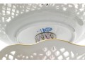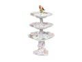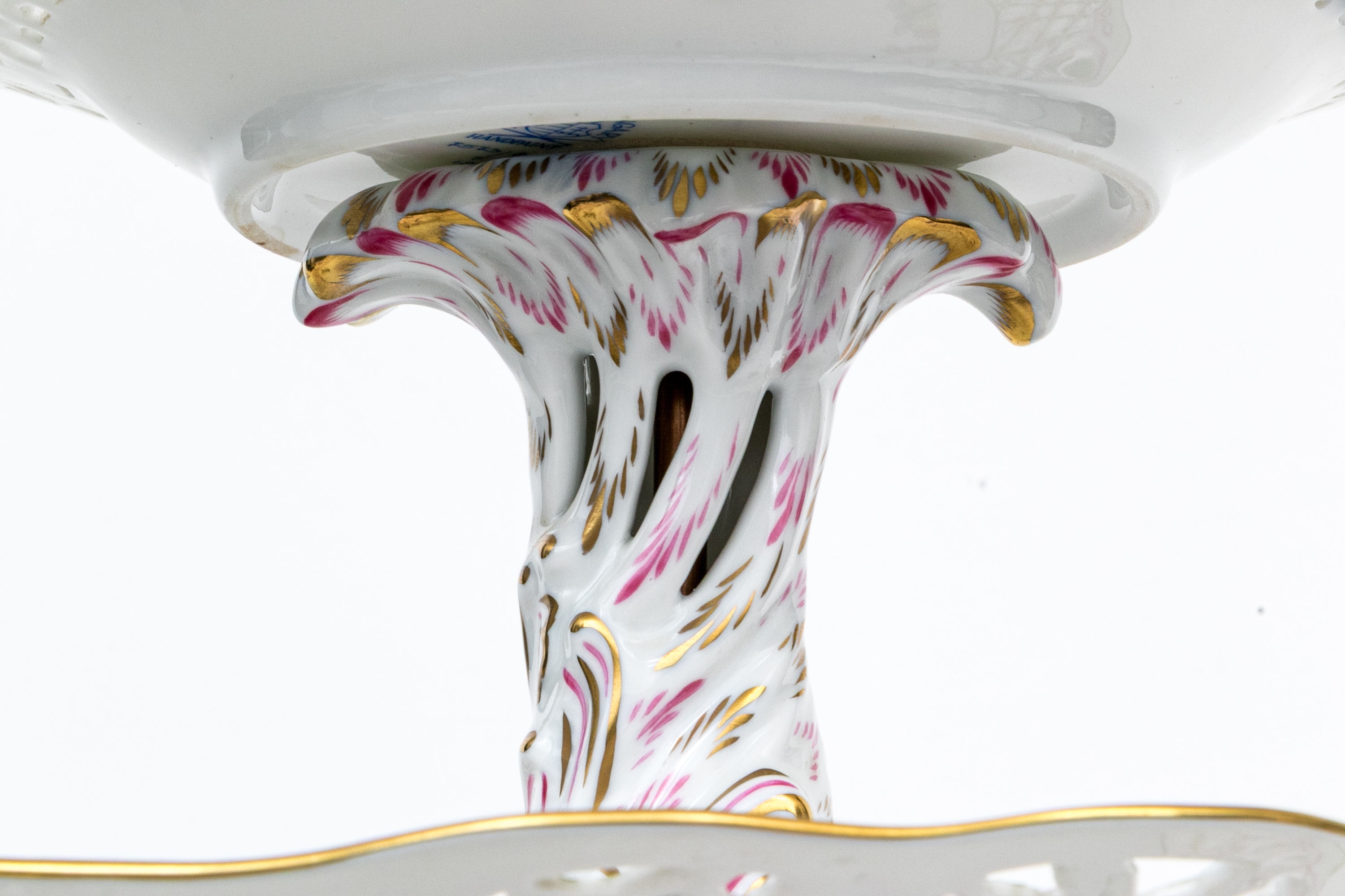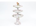 Condition: Excellent condition overall. All three trays, stem, and finial are intact with no chips, cracks, or repairs. The gilding remains bright and complete, and painted decoration is vibrant and crisp. The assembly screw and fittings are tight and secure, with minimal wear to the base consistent with careful display. The undersides of all tiers display clean and legible blue factory marks. Light shelf wear is visible only on the bottom rim, typical of shelf display and gentle use.