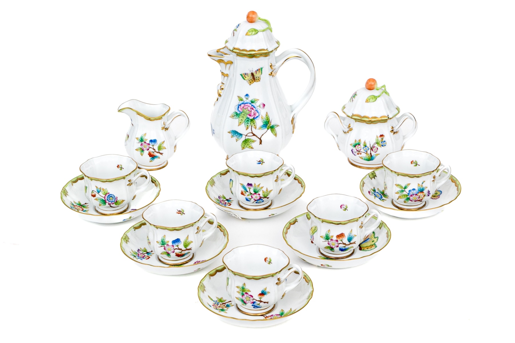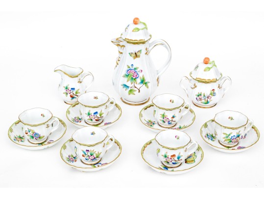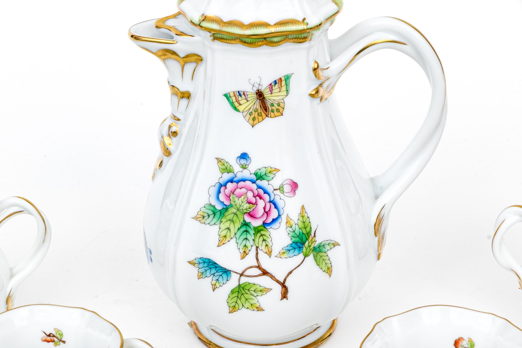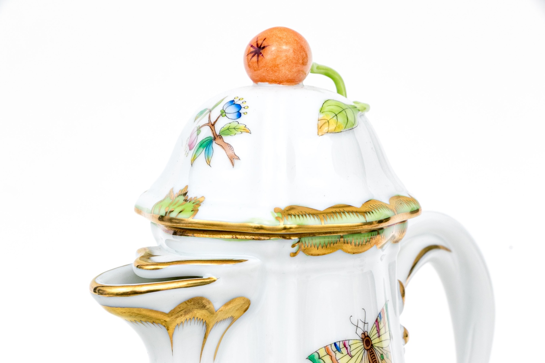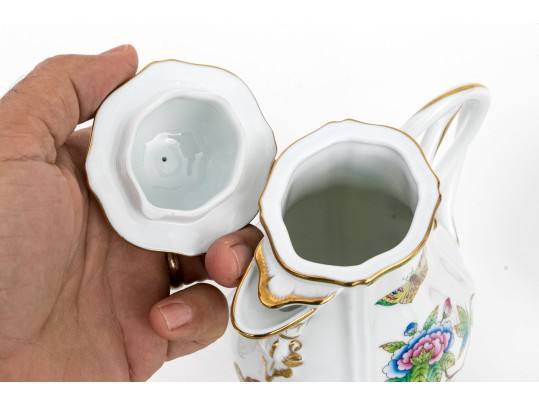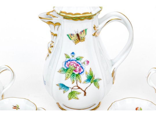 Herend Hungary hand-painted porcelain coffee service for six in the Queen Victoria (VBO) pattern, featuring bright floral sprays, butterflies, and gilt detailing. The set includes a coffee pot with lid, creamer, covered sugar bowl, and six cups with matching saucers The porcelain surfaces are richly decorated with multicolored peony blossoms, butterflies, and stylized leaves, accented with hand-applied 24K gilt trim along the rims, handles, and finials. The distinctive molded, scalloped edges and delicate ribbing highlight Herend’s attention to form as well as decoration.