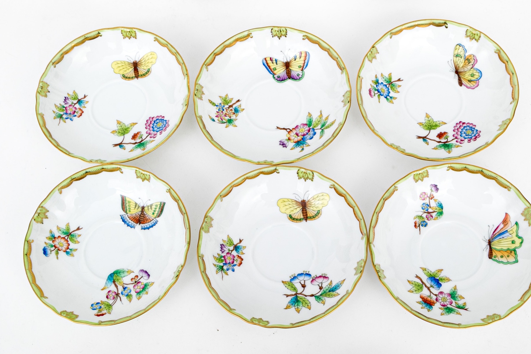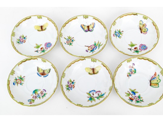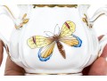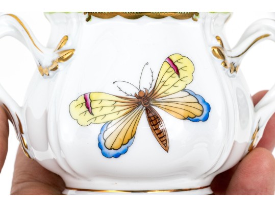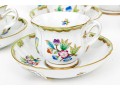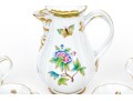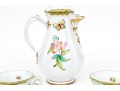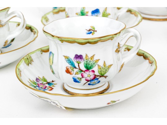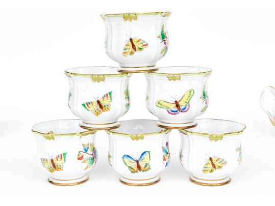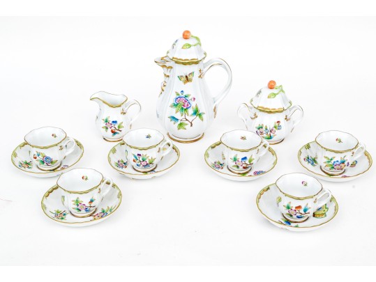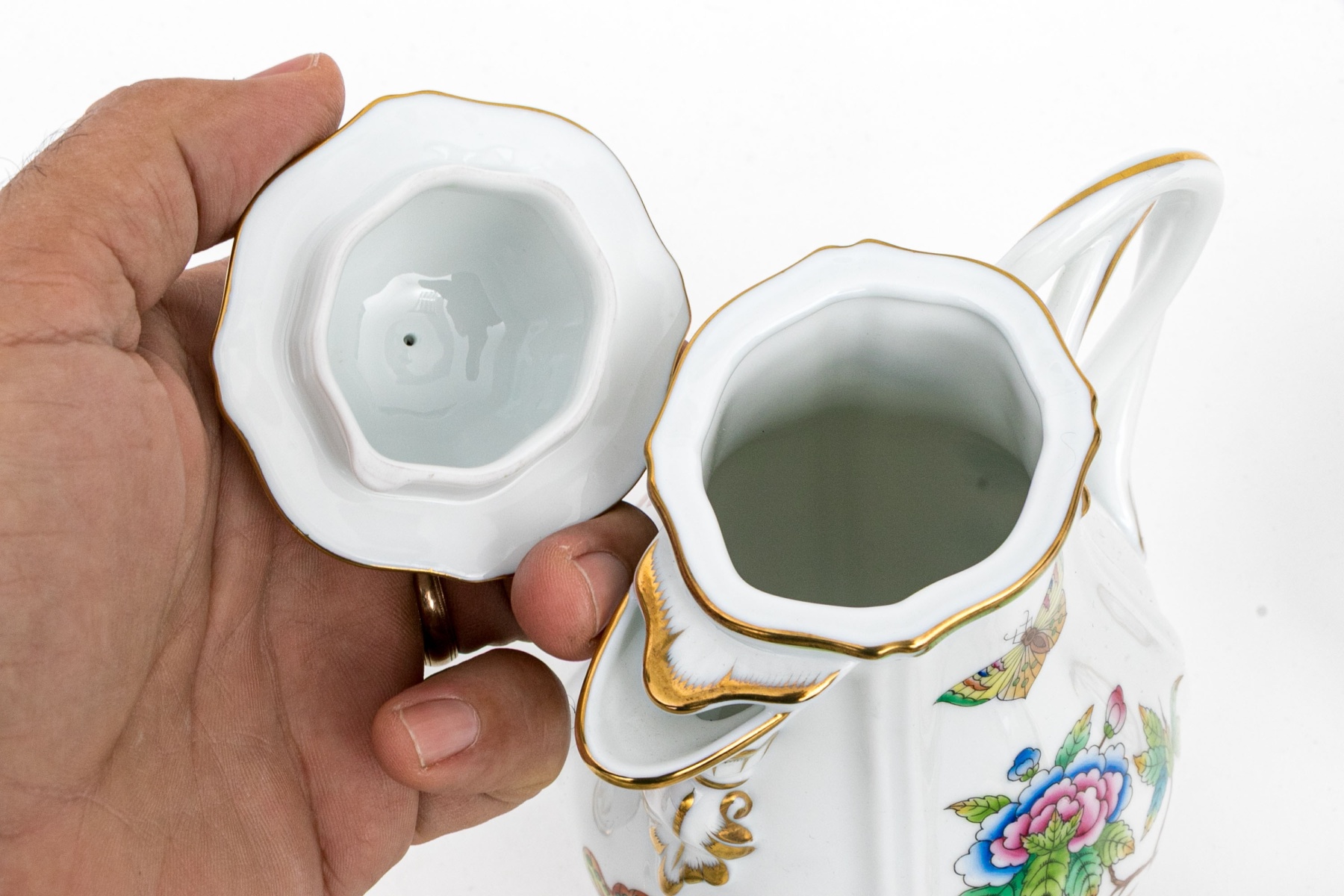 Herend Hungary hand-painted porcelain coffee service for six in the Queen Victoria (VBO) pattern, featuring bright floral sprays, butterflies, and gilt detailing. The set includes a coffee pot with lid, creamer, covered sugar bowl, and six cups with matching saucers The porcelain surfaces are richly decorated with multicolored peony blossoms, butterflies, and stylized leaves, accented with hand-applied 24K gilt trim along the rims, handles, and finials. The distinctive molded, scalloped edges and delicate ribbing highlight Herend’s attention to form as well as decoration.