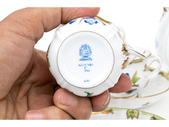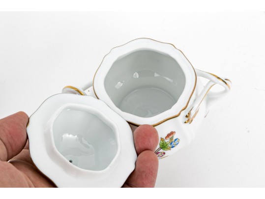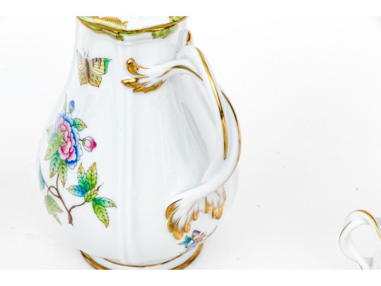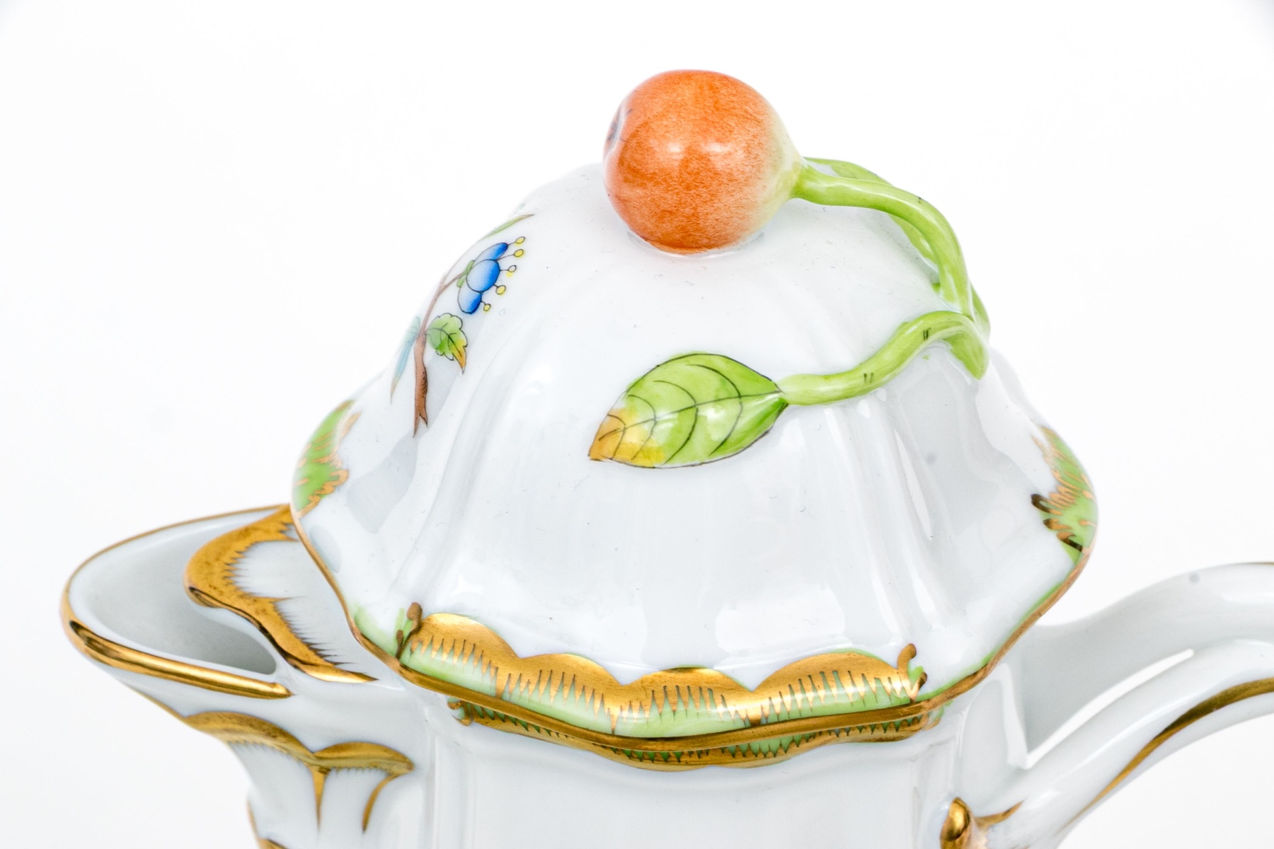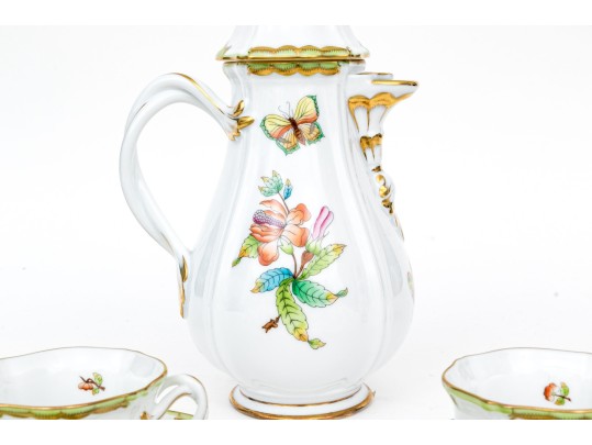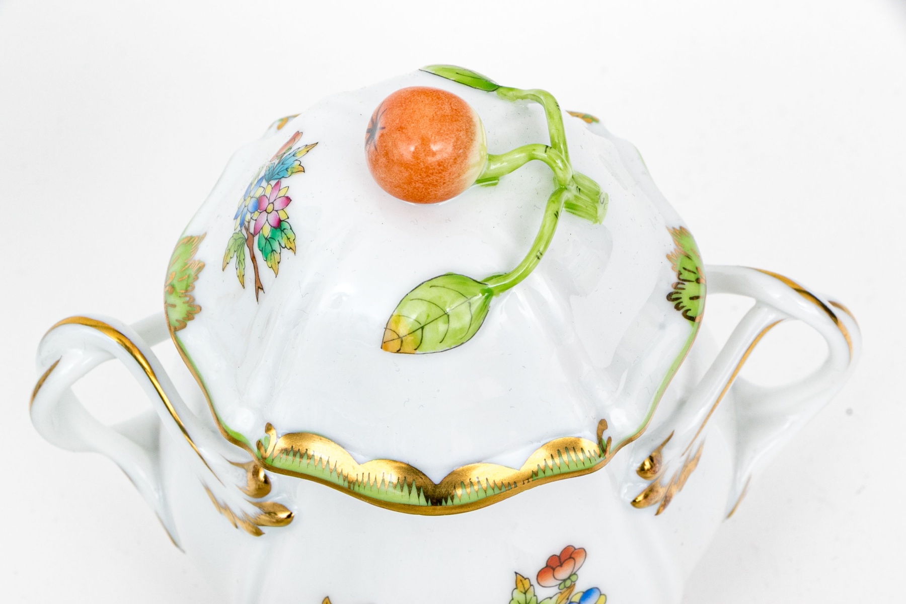 The coffee pot and sugar bowl lids feature the signature orange fruit finial with leaf detail, a hallmark of the Queen Victoria design. Each piece bears the Herend blue shield mark, inscribed HEREND HUNGARY HANDPAINTED and numbered 4227/VBO, 4225/VBO