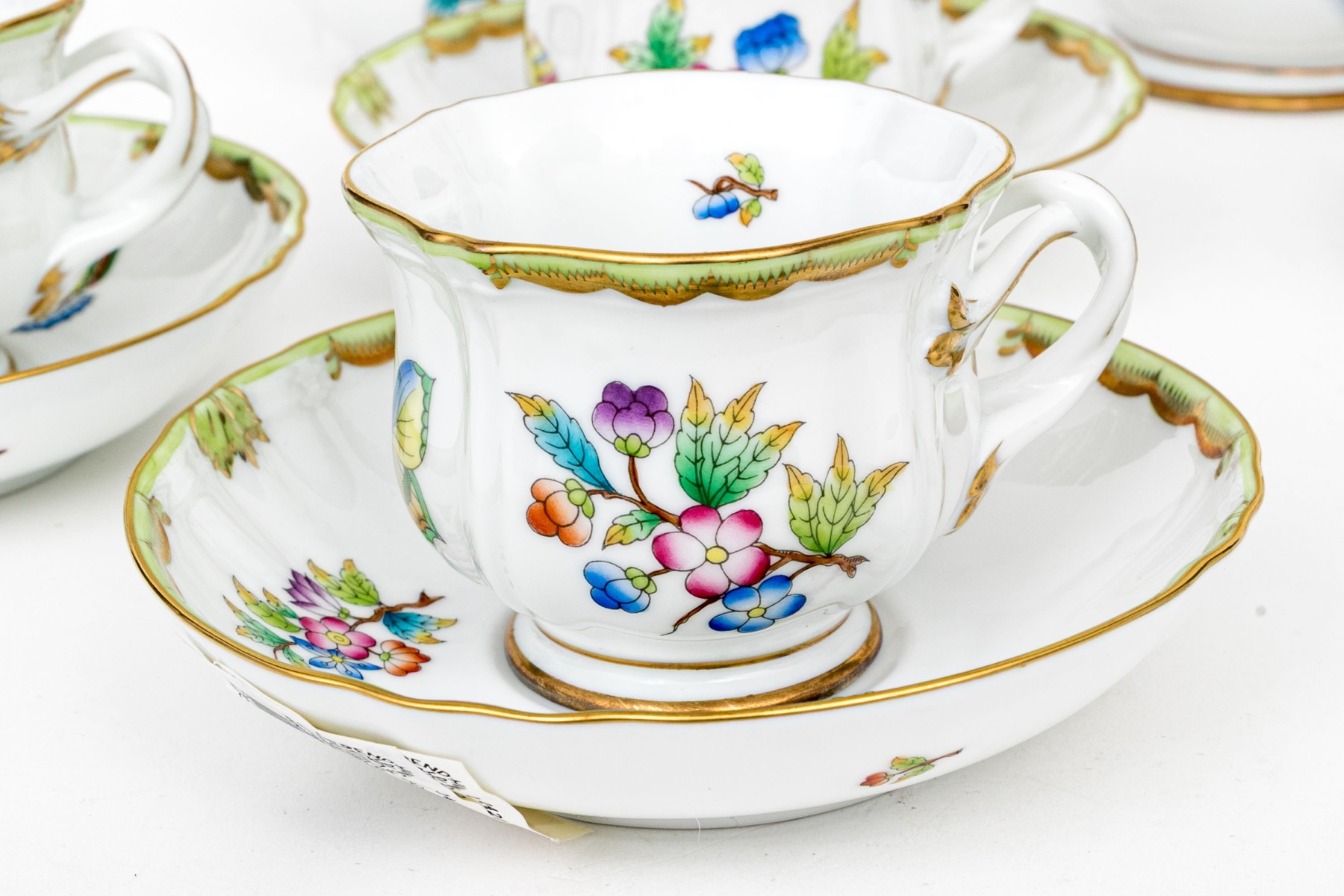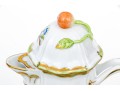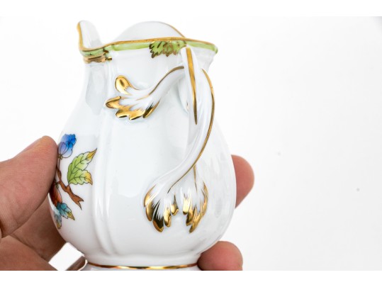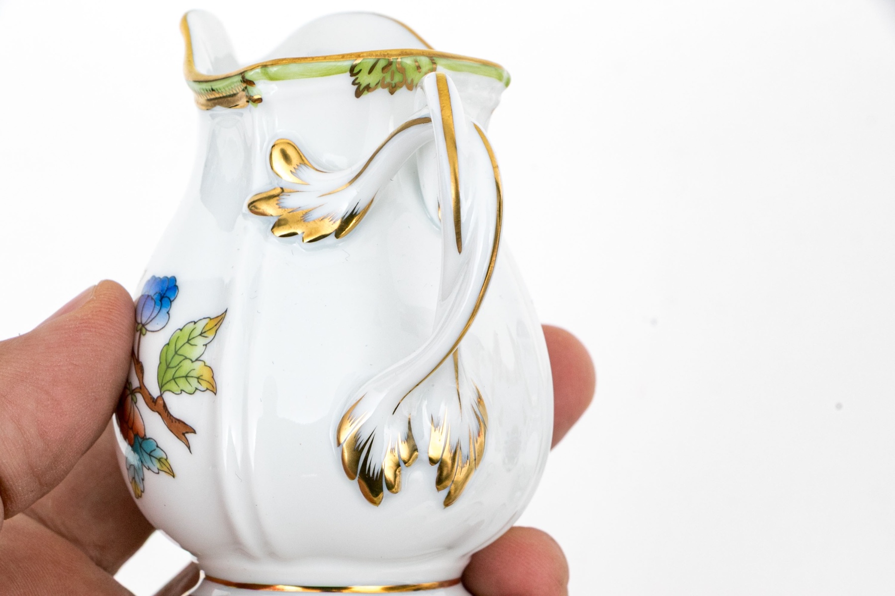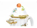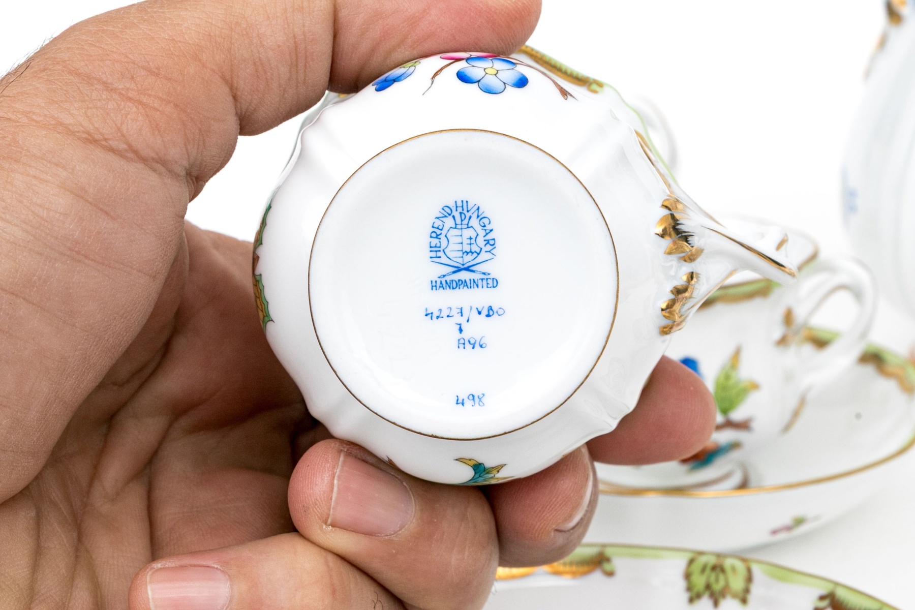 The coffee pot and sugar bowl lids feature the signature orange fruit finial with leaf detail, a hallmark of the Queen Victoria design. Each piece bears the Herend blue shield mark, inscribed HEREND HUNGARY HANDPAINTED and numbered 4227/VBO, 4225/VBO