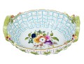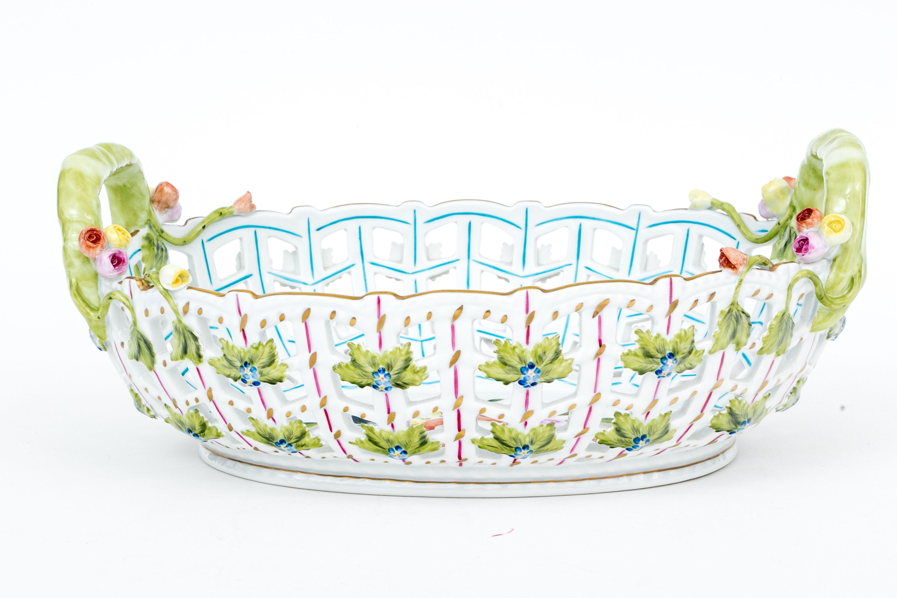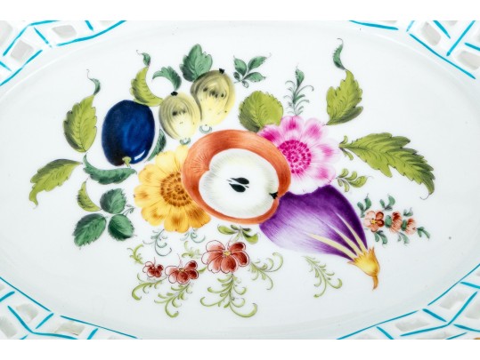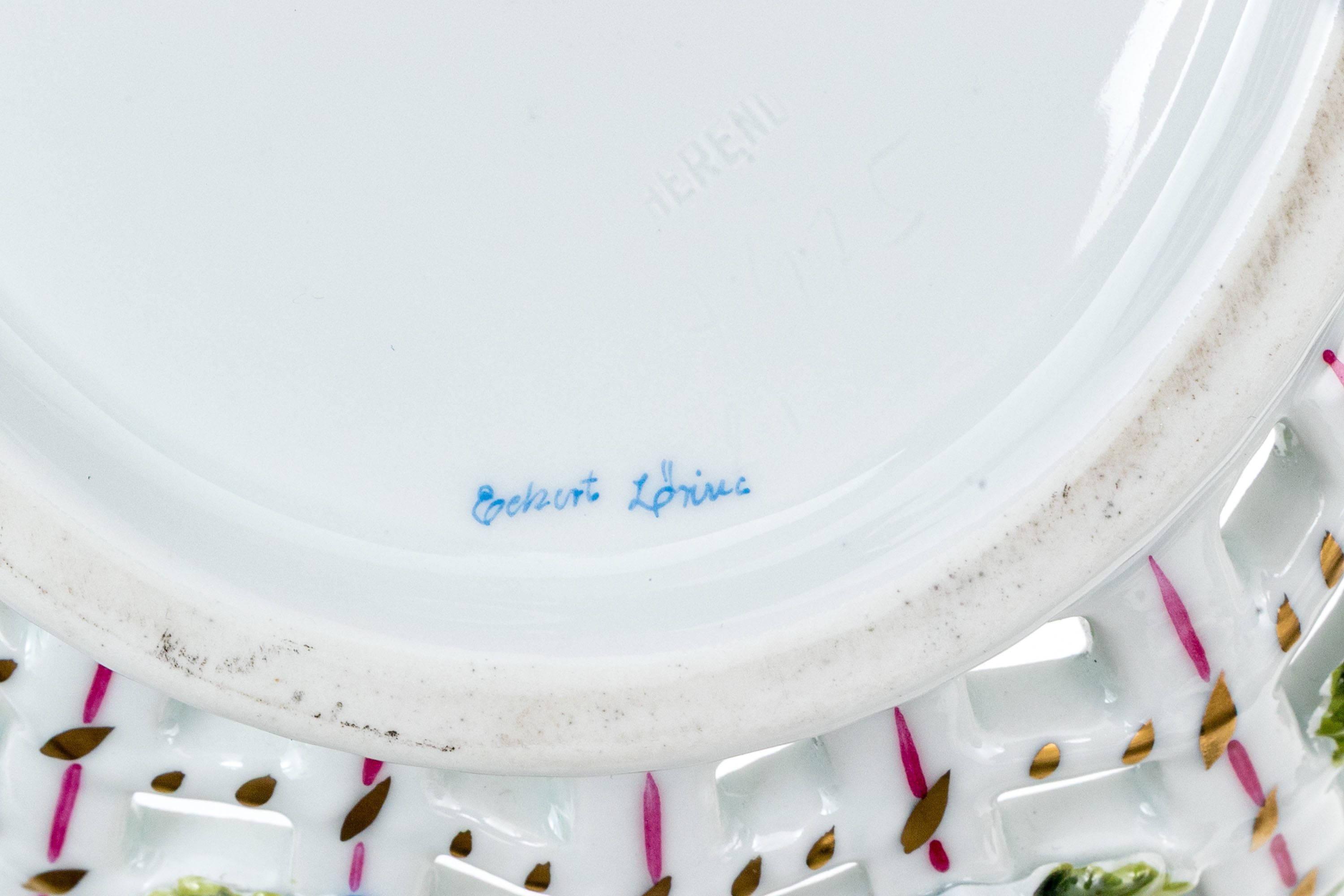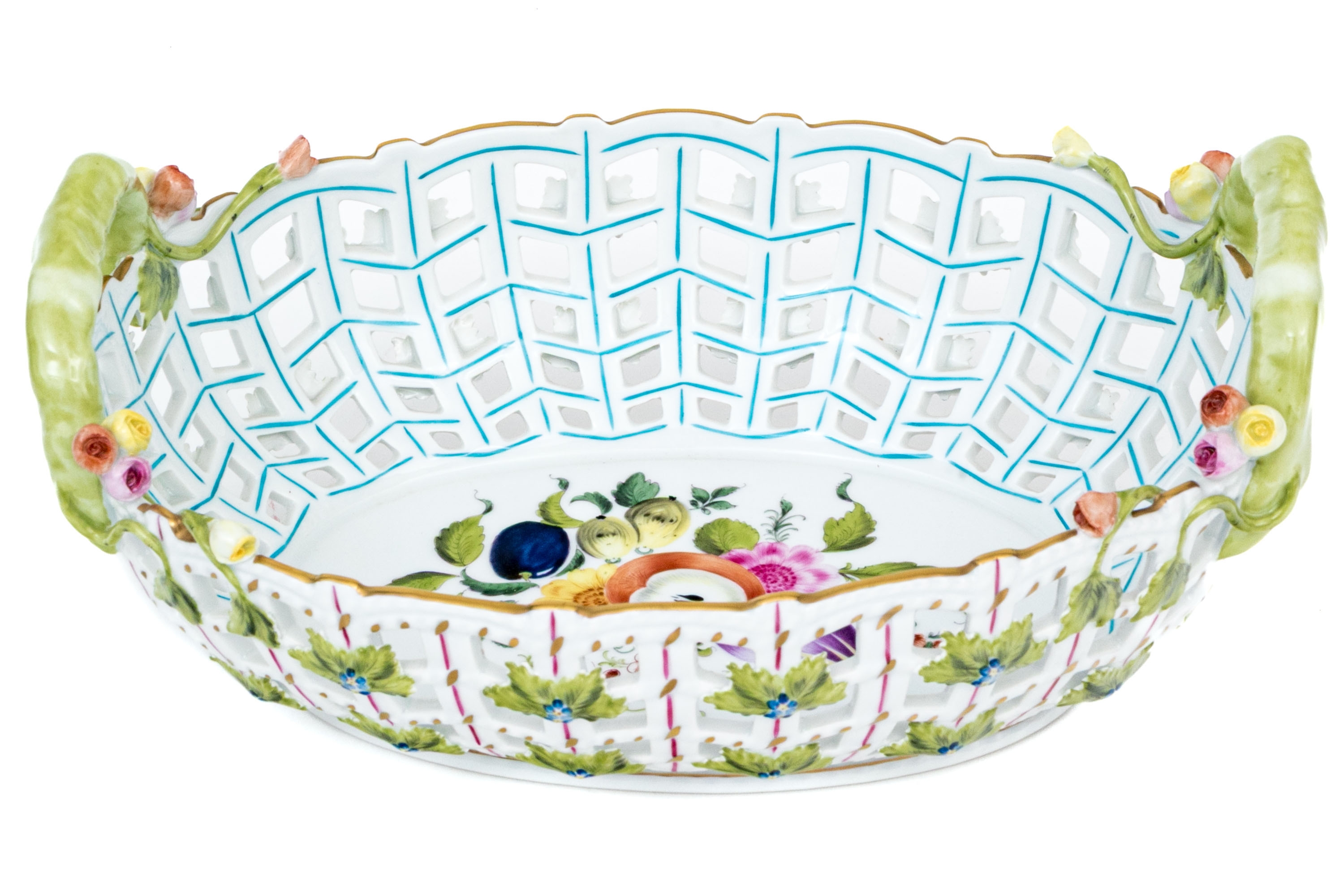 Herend Hungary hand-painted porcelain reticulated basket, crafted and decorated in the BFR pattern, also known as “Fruit and Flowers". The basket features a finely pierced reticulated lattice design highlighted with aqua blue geometric edging and 24k gold trim. The openwork body is adorned with applied green grape leaves and clusters, each hand-painted and modeled in relief. The vine-formed handles are accented with delicate applied porcelain roses in yellow, pink, and coral hues. At the center, a vibrant still-life composition depicts fruit and blossoms, including a plum, apple, and assorted flowers in rich tones of yellow, violet, and magenta, all surrounded by lush green foliage. The underside bears the Herend Hungary blue shield hallmark with crossed paintbrushes and HANDPAINTED mark, along with the pattern and form number 7475/BFR, painter’s signature “Eckert Lőrinc”, and factory painter’s marks.