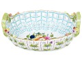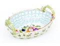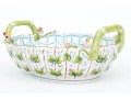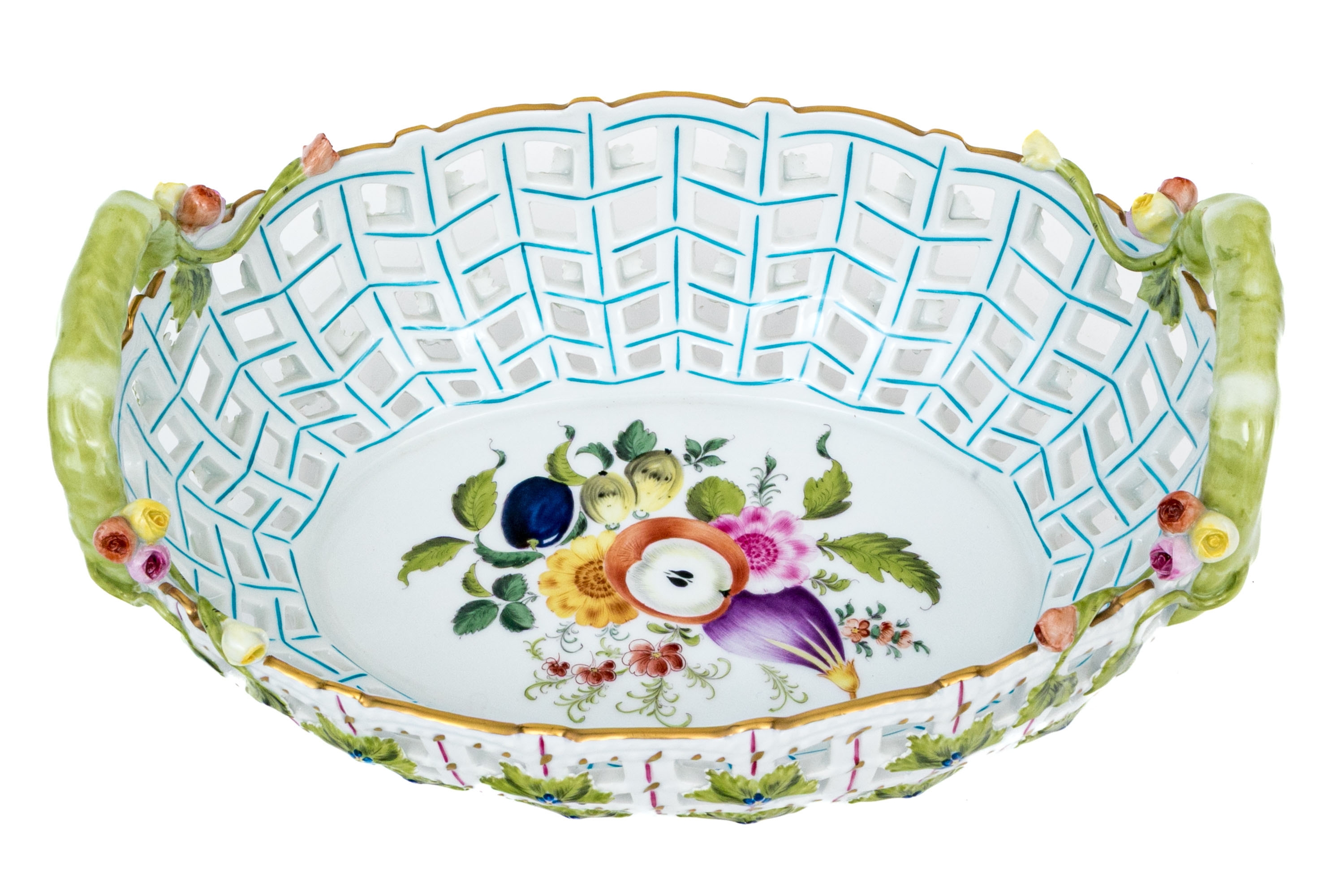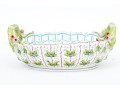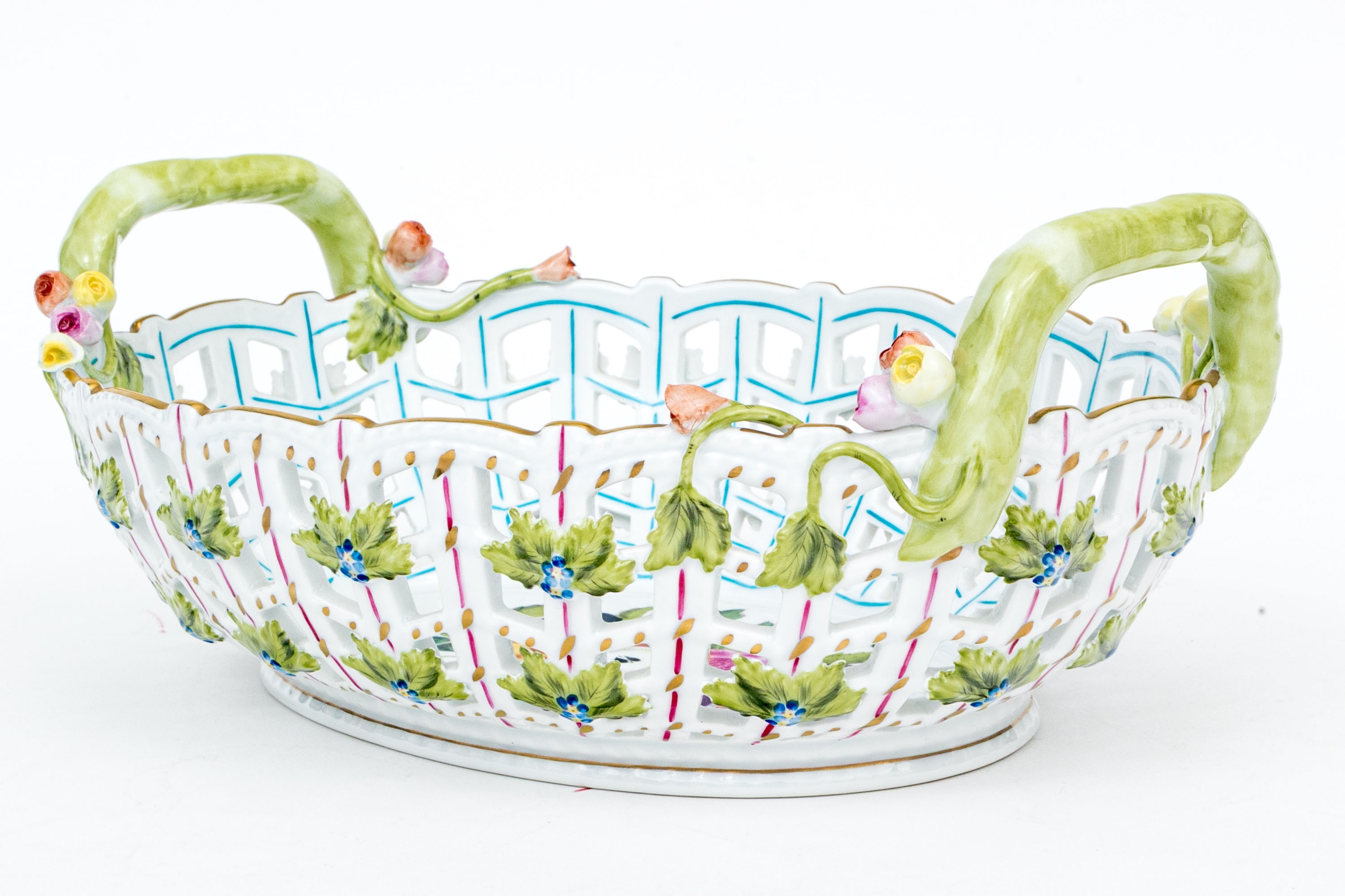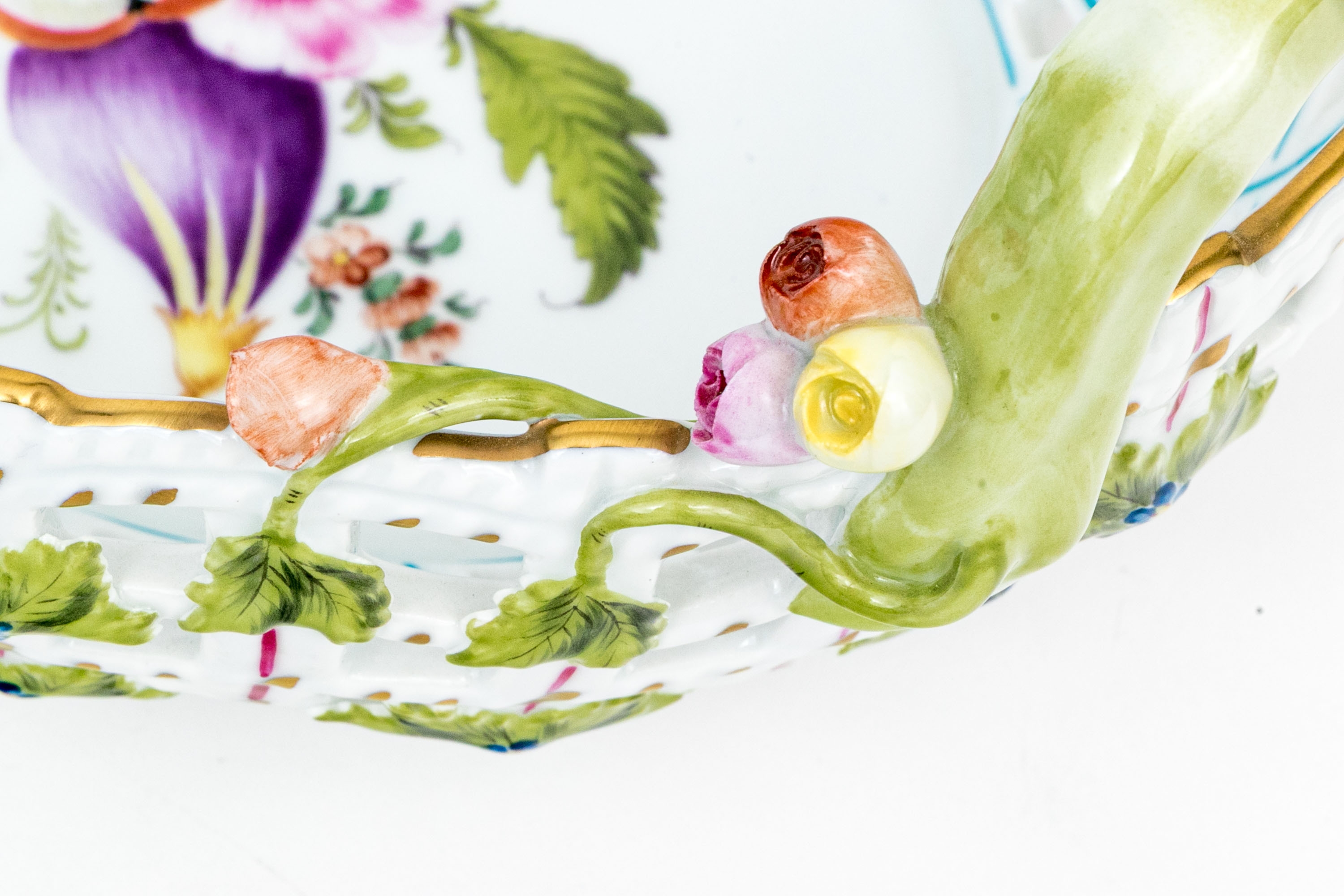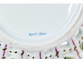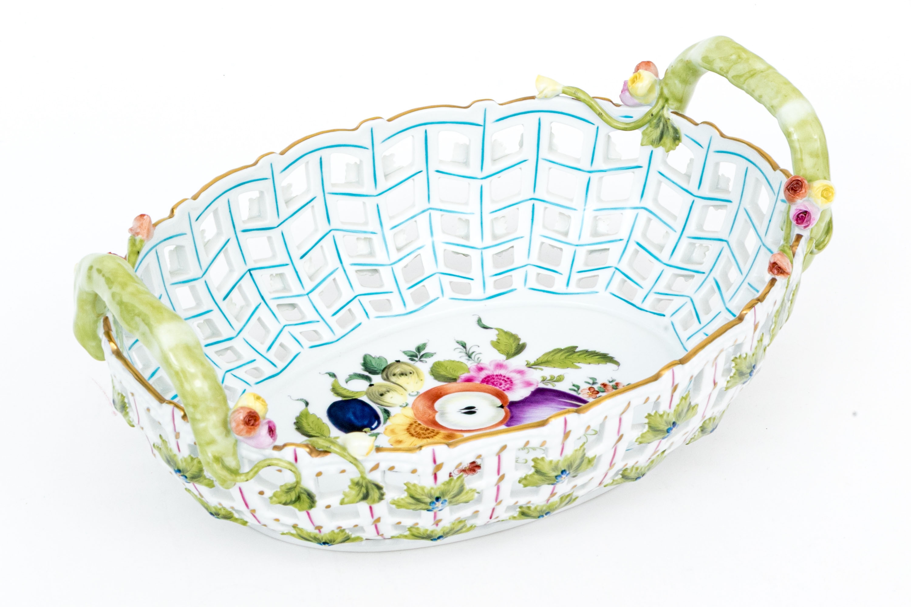 Herend Hungary hand-painted porcelain reticulated basket, crafted and decorated in the BFR pattern, also known as “Fruit and Flowers". The basket features a finely pierced reticulated lattice design highlighted with aqua blue geometric edging and 24k gold trim. The openwork body is adorned with applied green grape leaves and clusters, each hand-painted and modeled in relief. The vine-formed handles are accented with delicate applied porcelain roses in yellow, pink, and coral hues. At the center, a vibrant still-life composition depicts fruit and blossoms, including a plum, apple, and assorted flowers in rich tones of yellow, violet, and magenta, all surrounded by lush green foliage. The underside bears the Herend Hungary blue shield hallmark with crossed paintbrushes and HANDPAINTED mark, along with the pattern and form number 7475/BFR, painter’s signature “Eckert Lőrinc”, and factory painter’s marks.