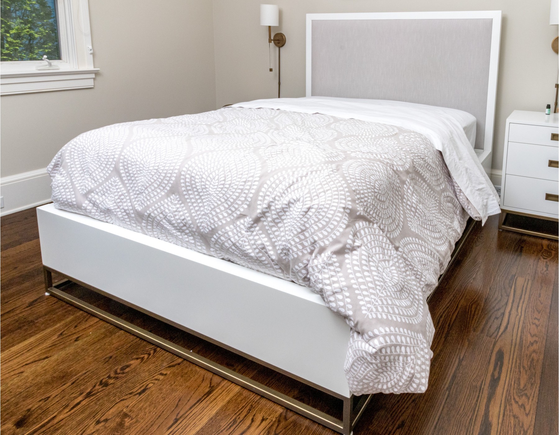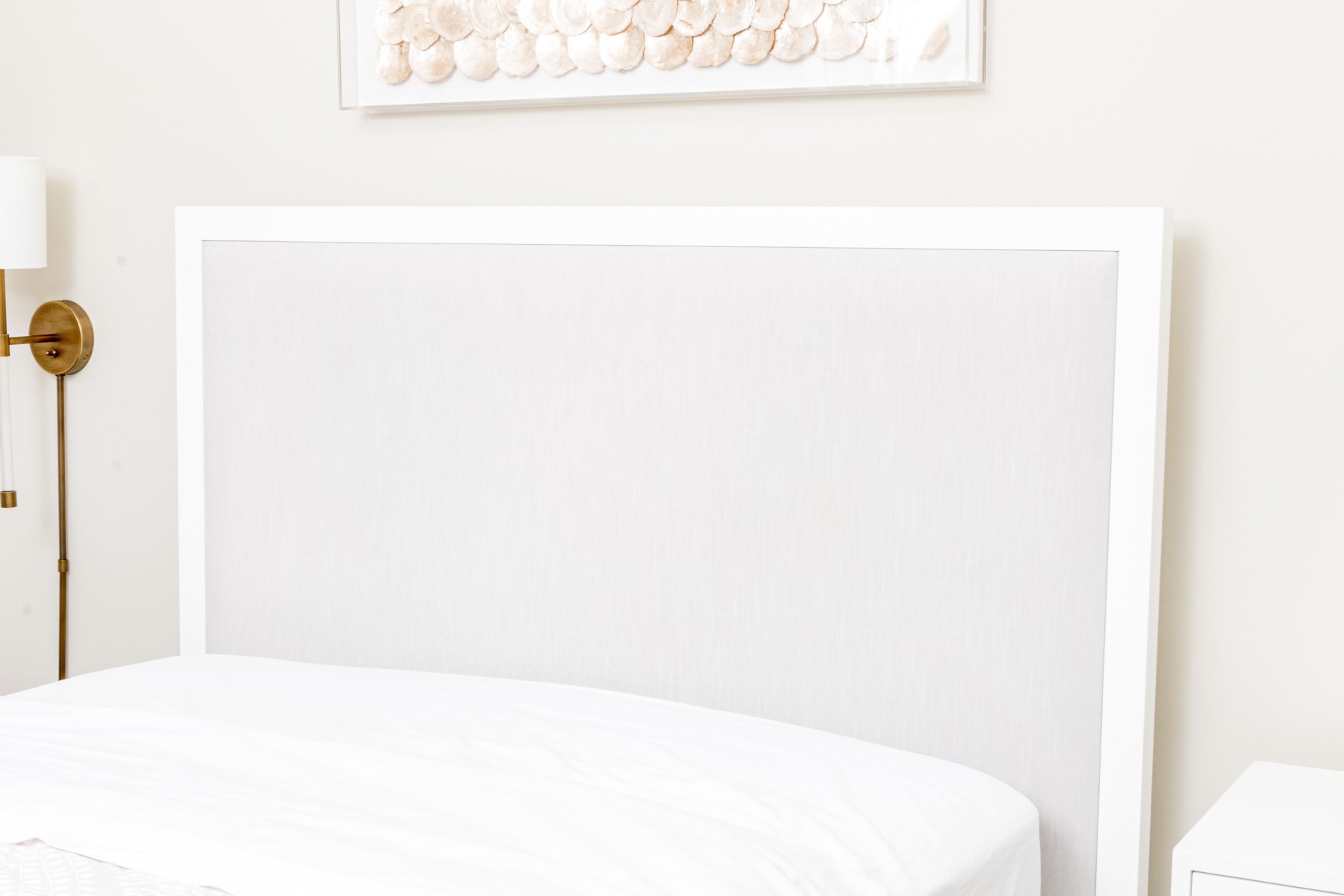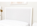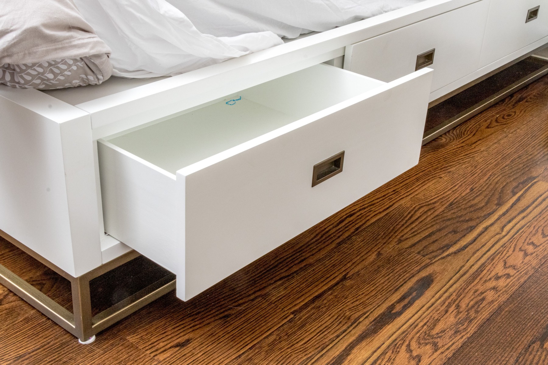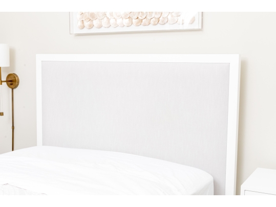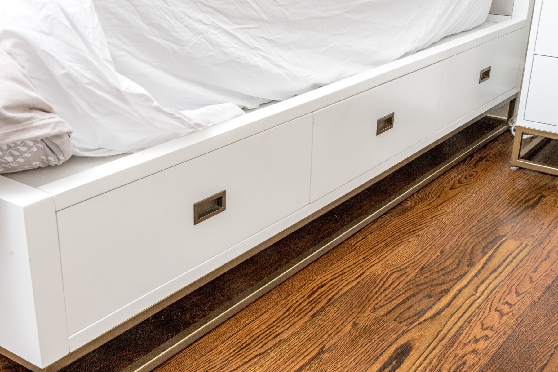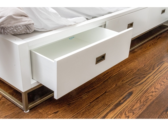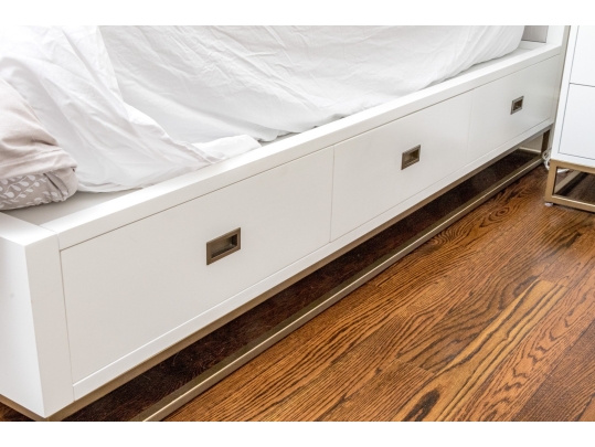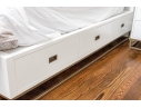 Upholstered headboard with white finished frame and brass finished base, with drawers on either end.