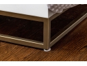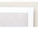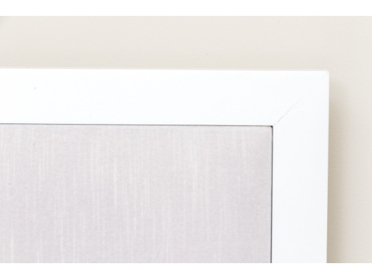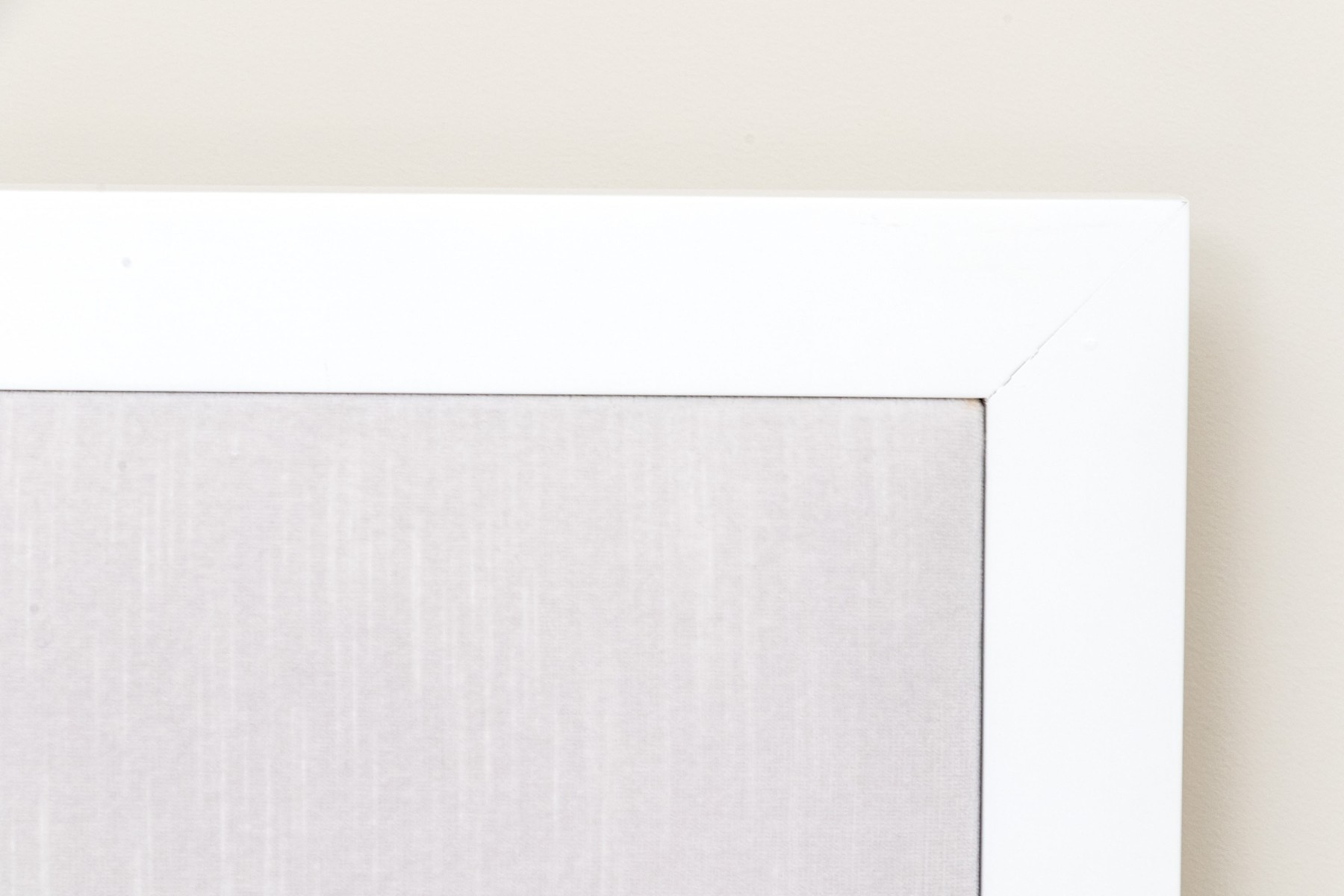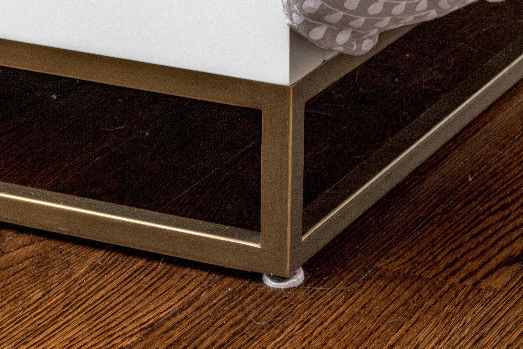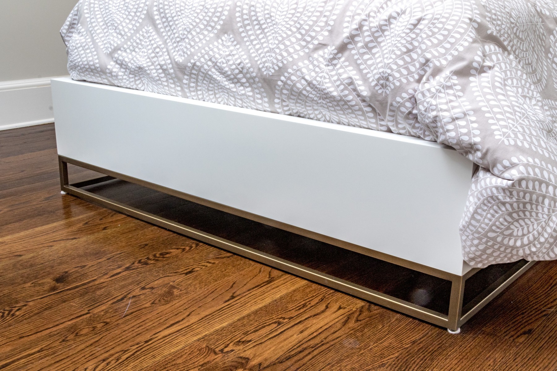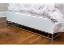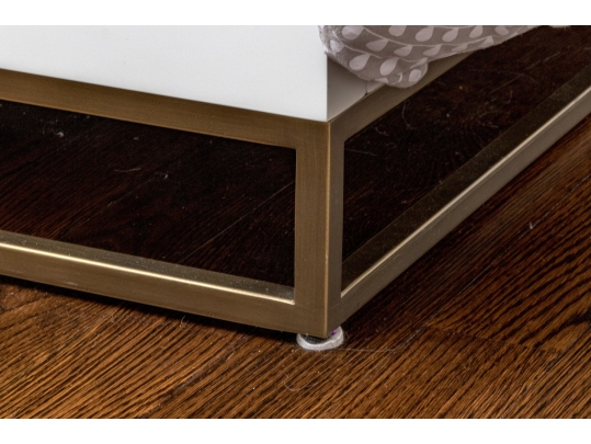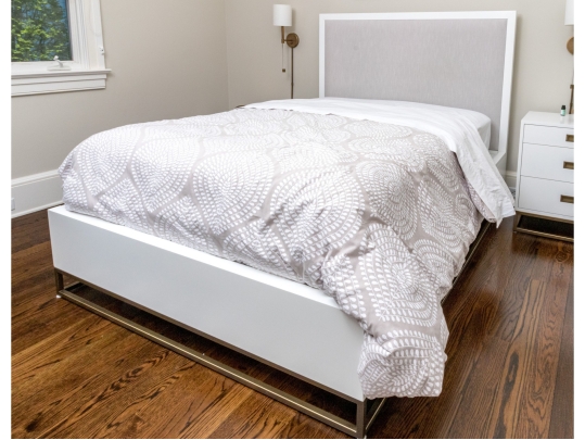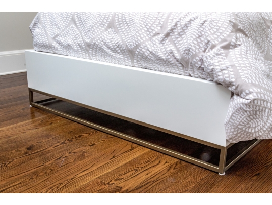 Upholstered headboard with white finished frame and brass finished base, with drawers on either end.