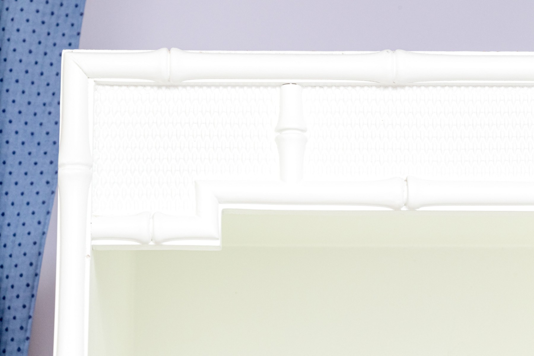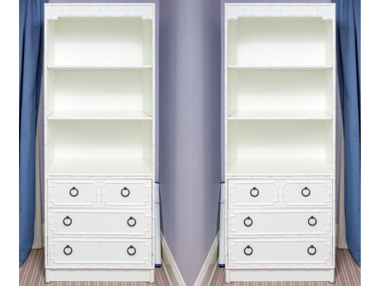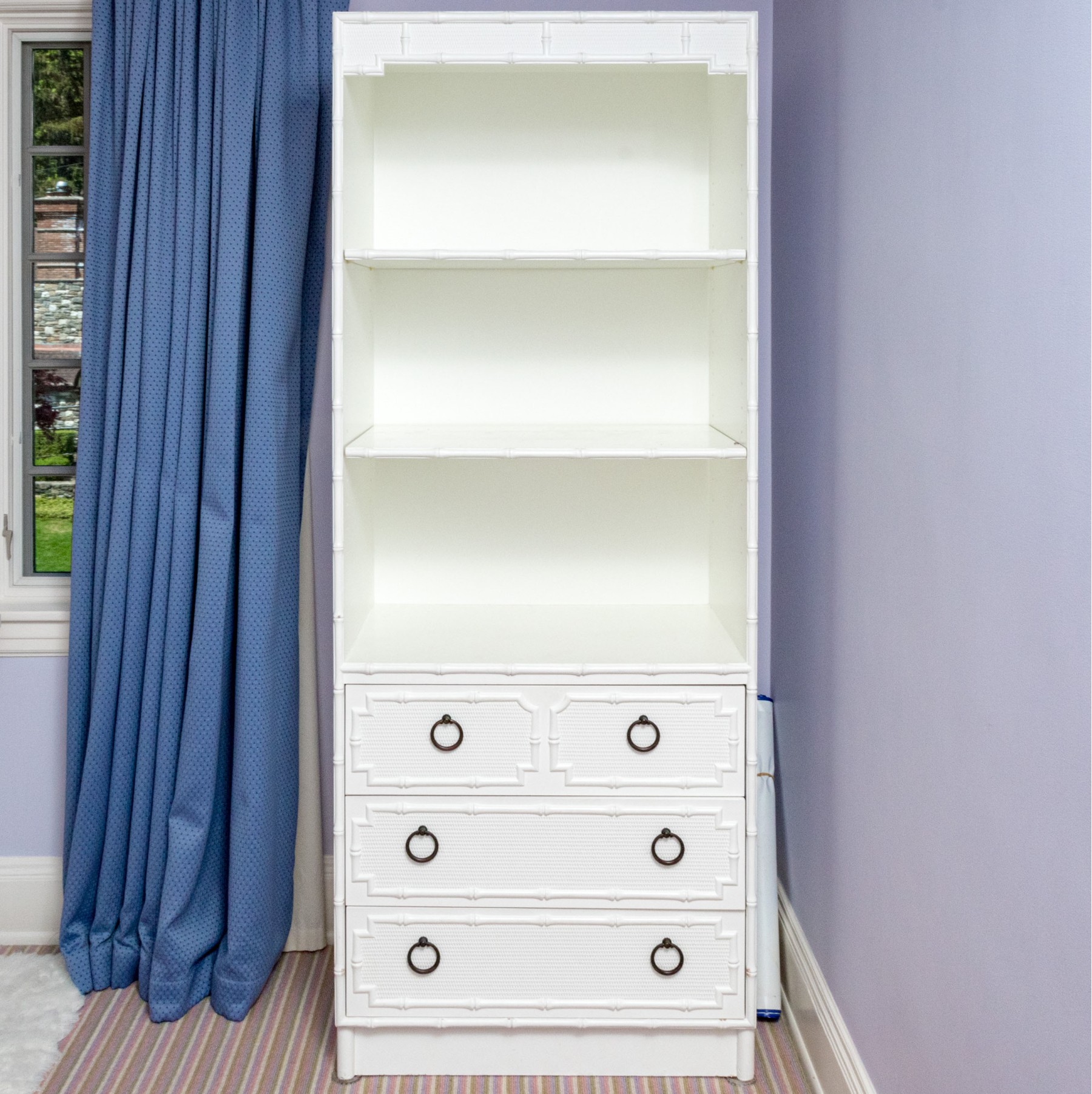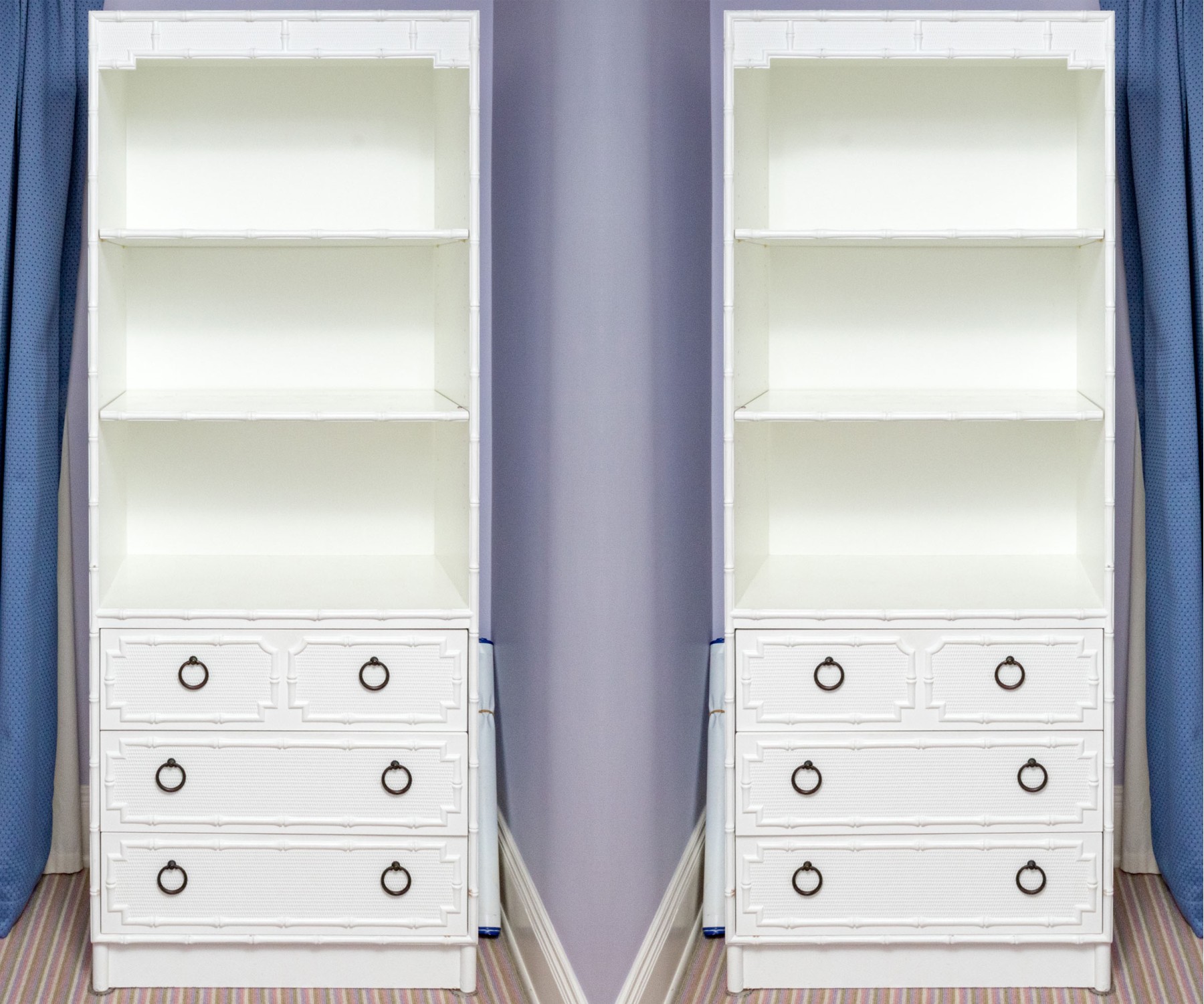 These nice and clean shelves have a faux bamboo design and textural component. Having three tiers and three pull drawers with brass pull handles. Purchased at a vintage furniture sale for $800 each.