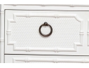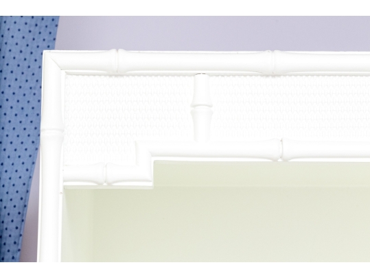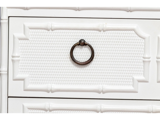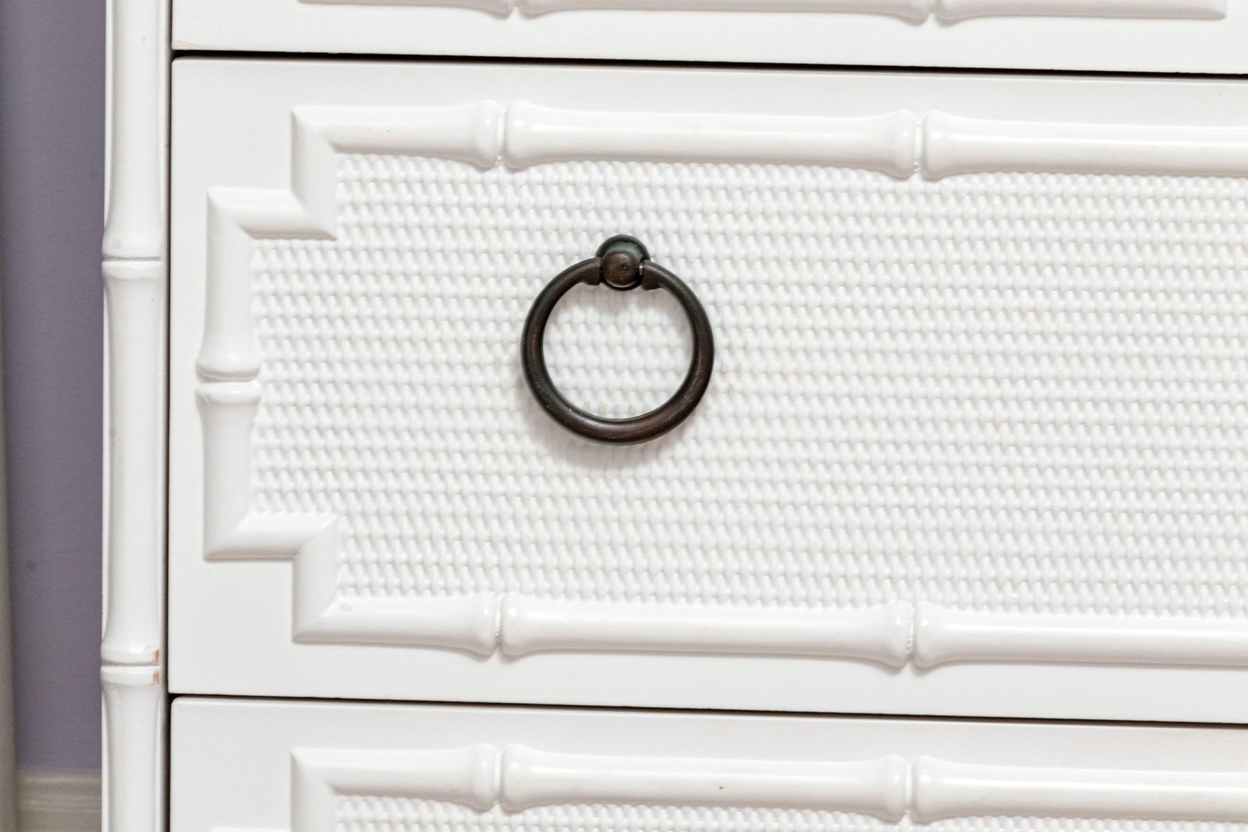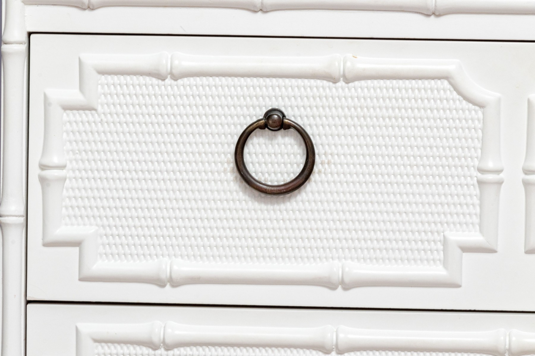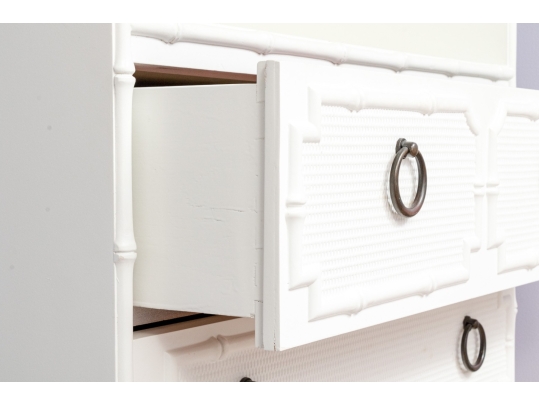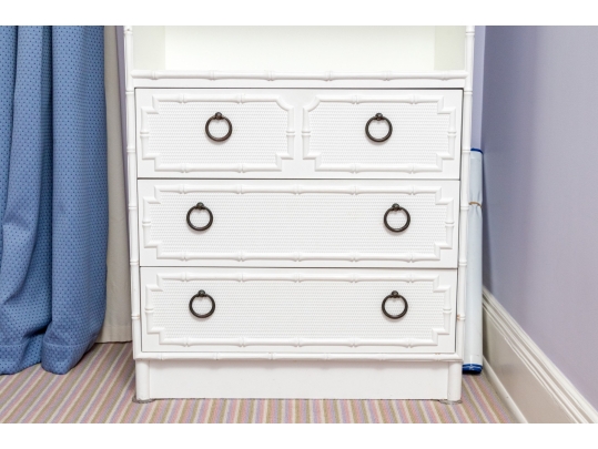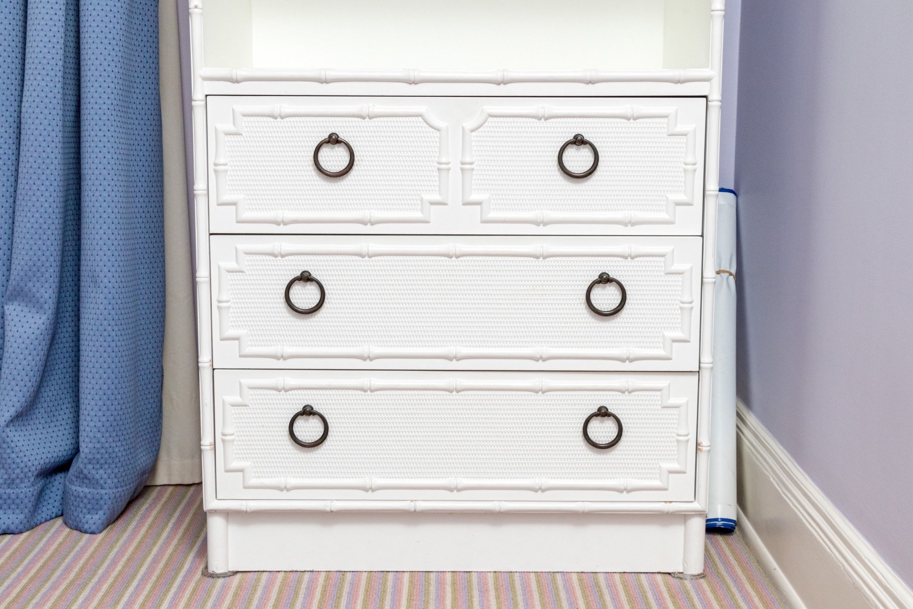 These nice and clean shelves have a faux bamboo design and textural component. Having three tiers and three pull drawers with brass pull handles. Purchased at a vintage furniture sale for $800 each.