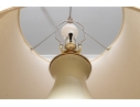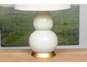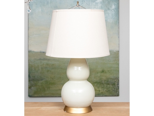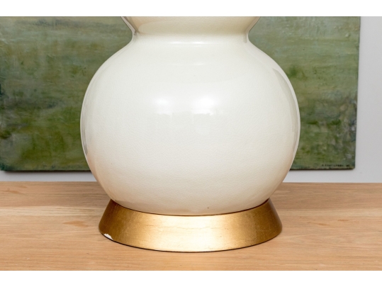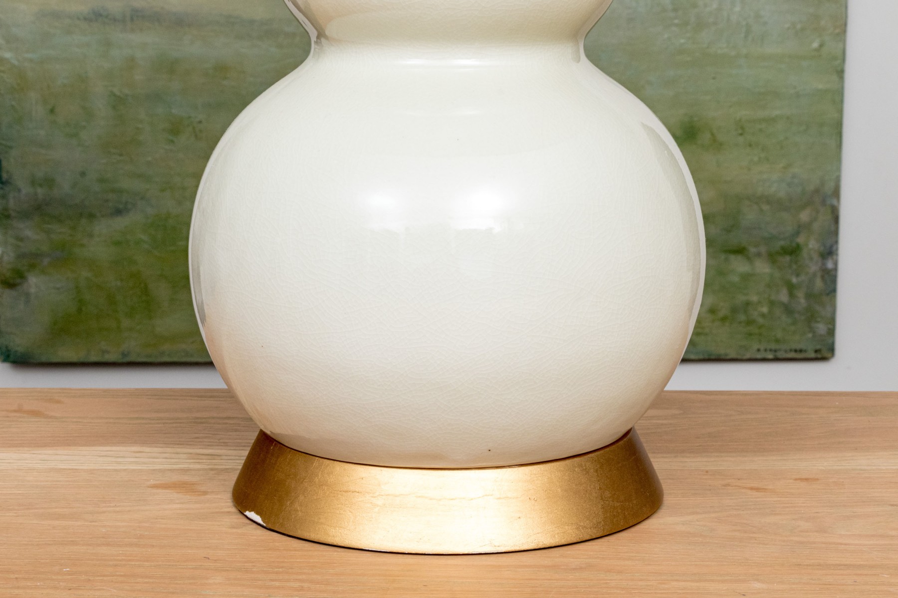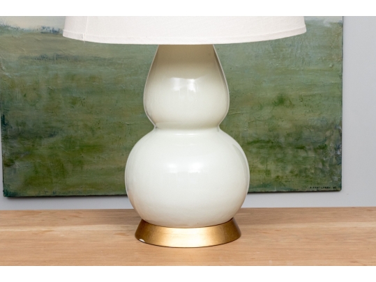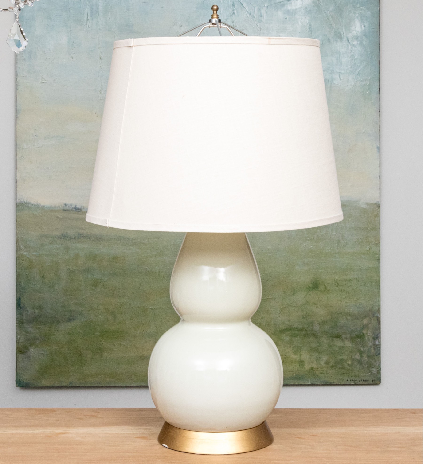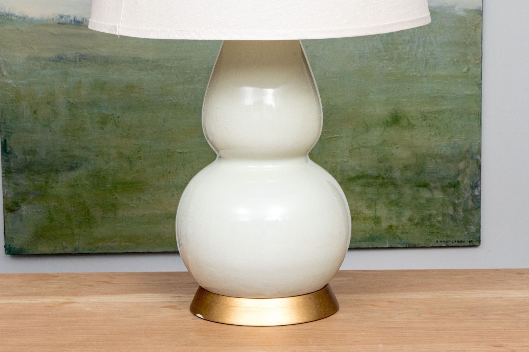 Resting on its gilt finished base the double gourd form lamp with a large linen shade.