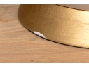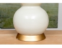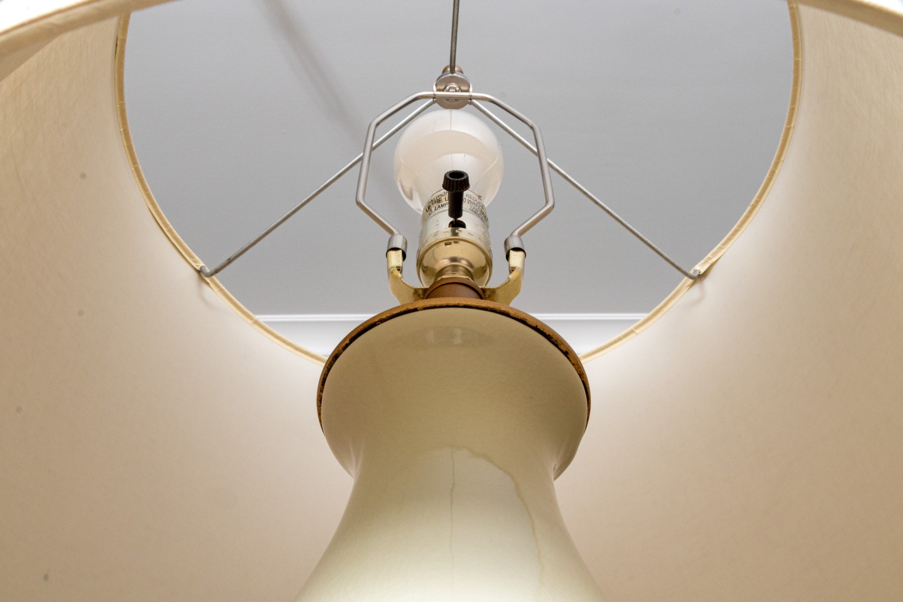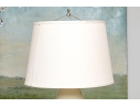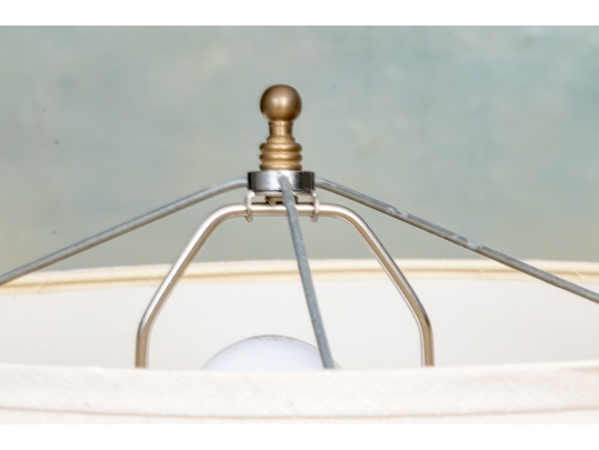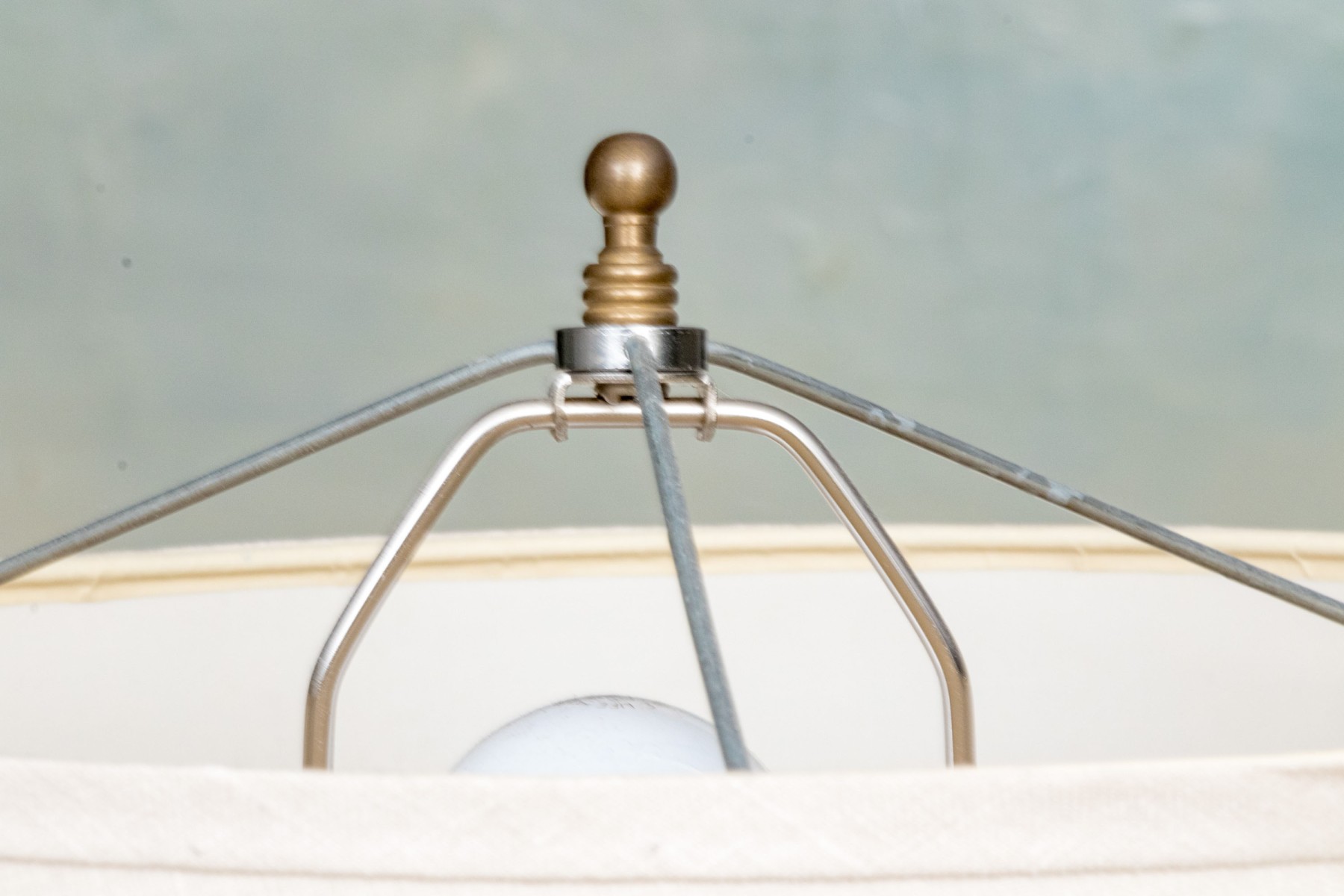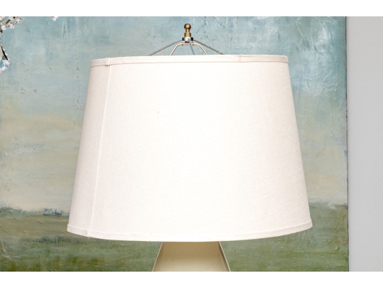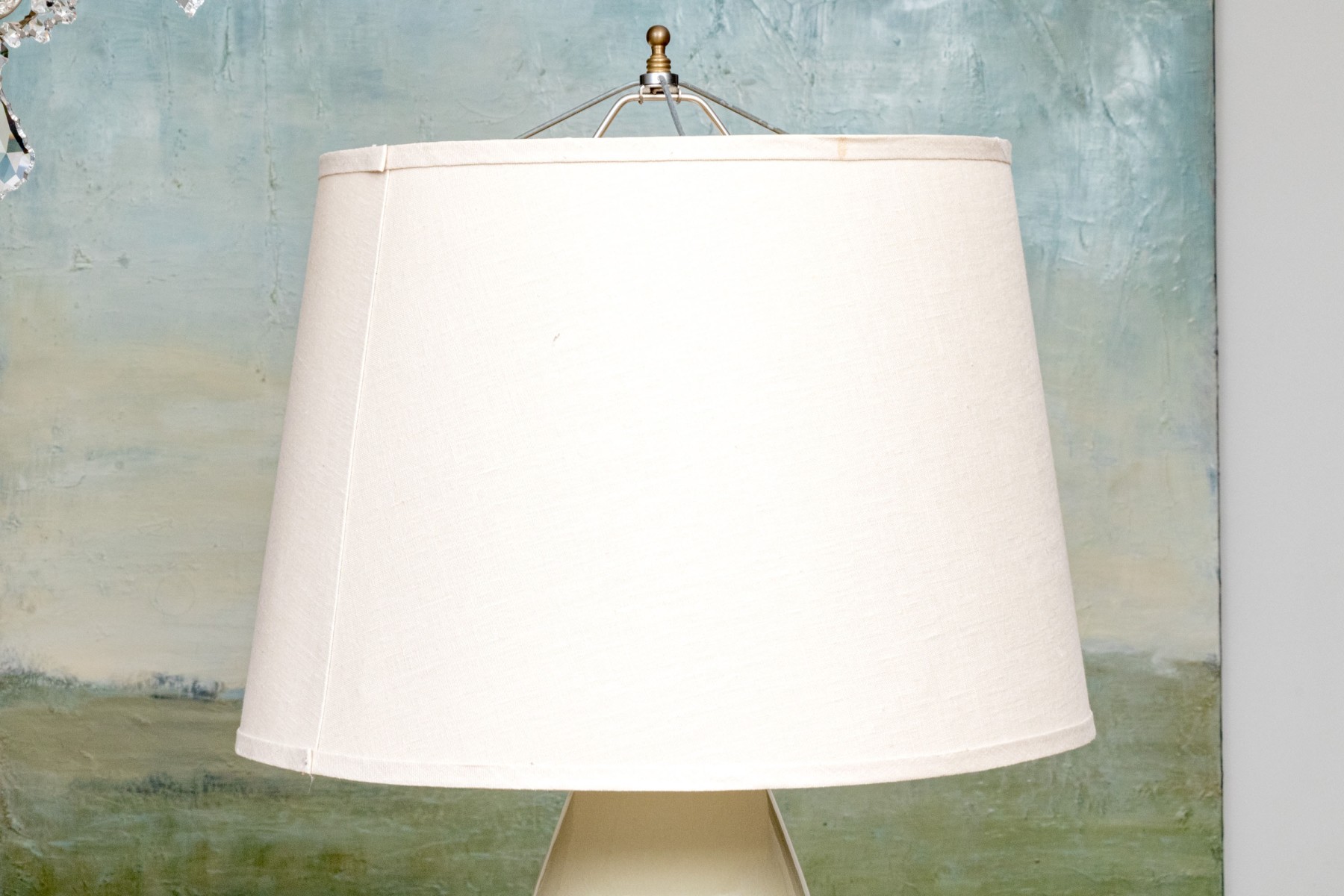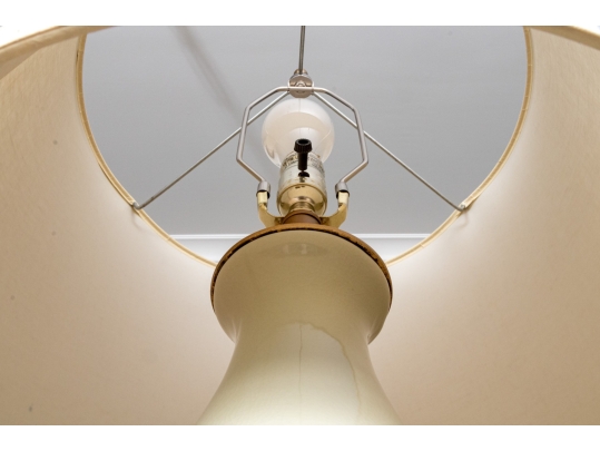Resting on its gilt finished base the double gourd form lamp with a large linen shade.