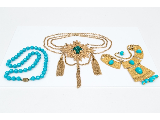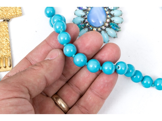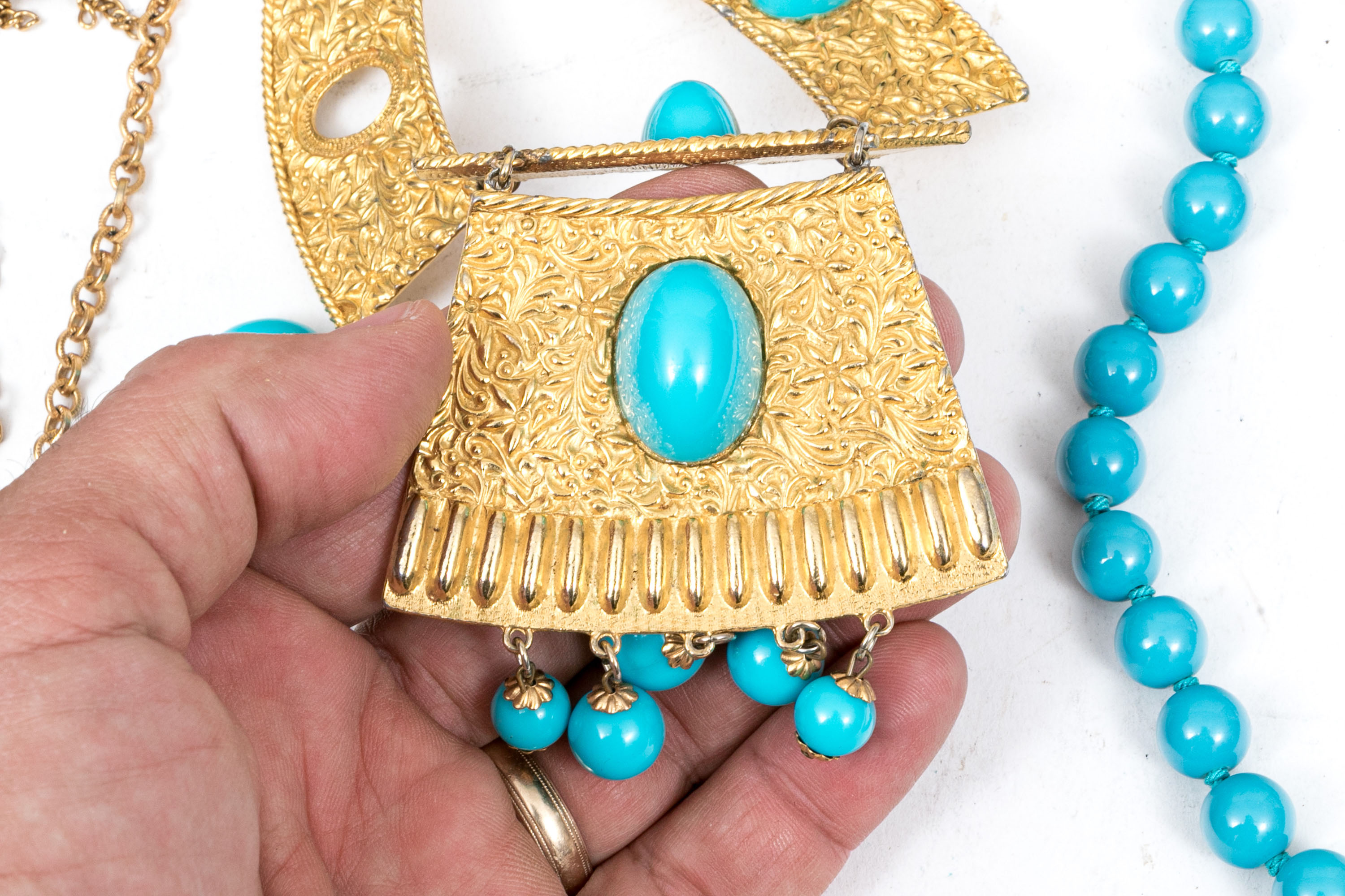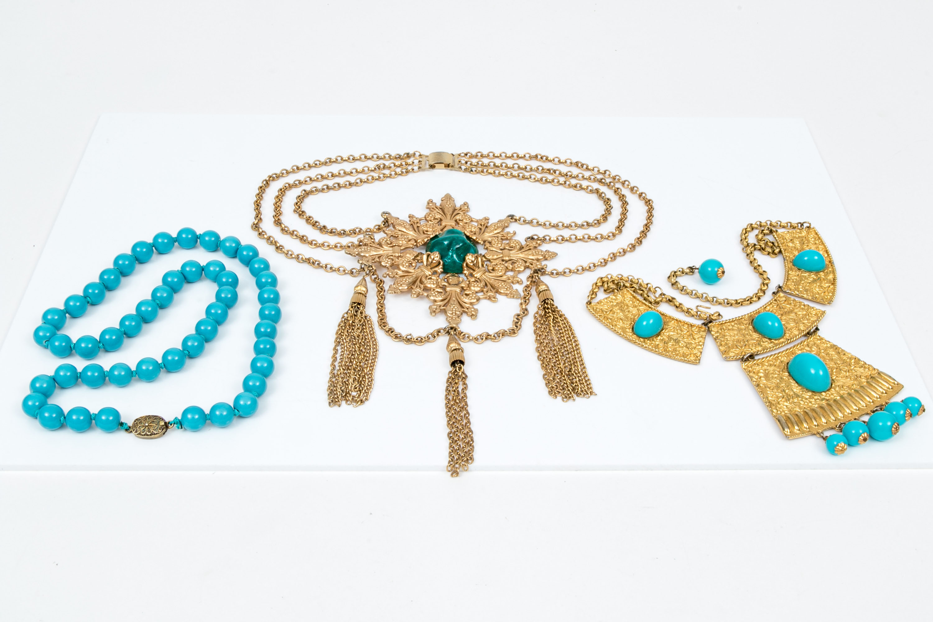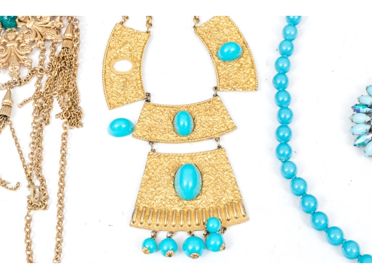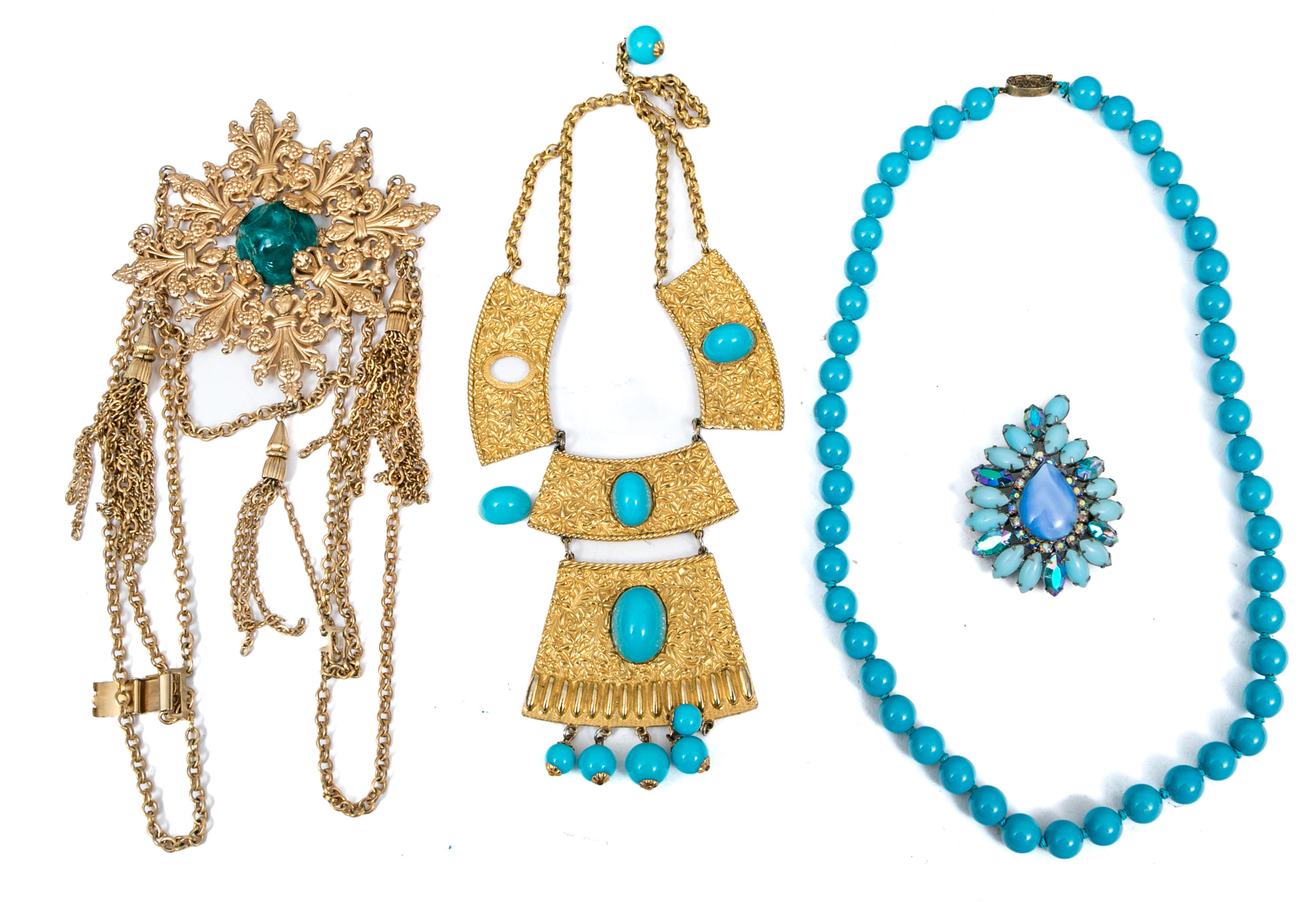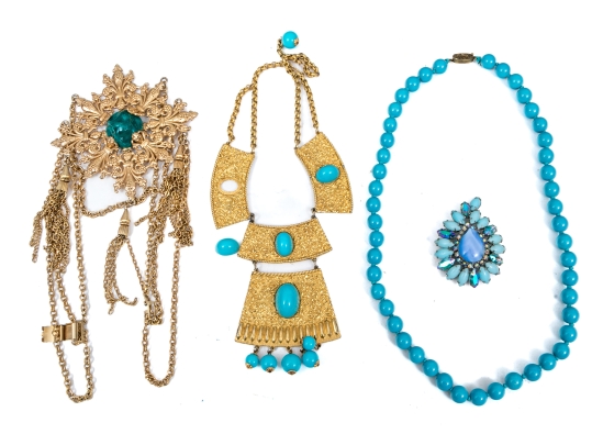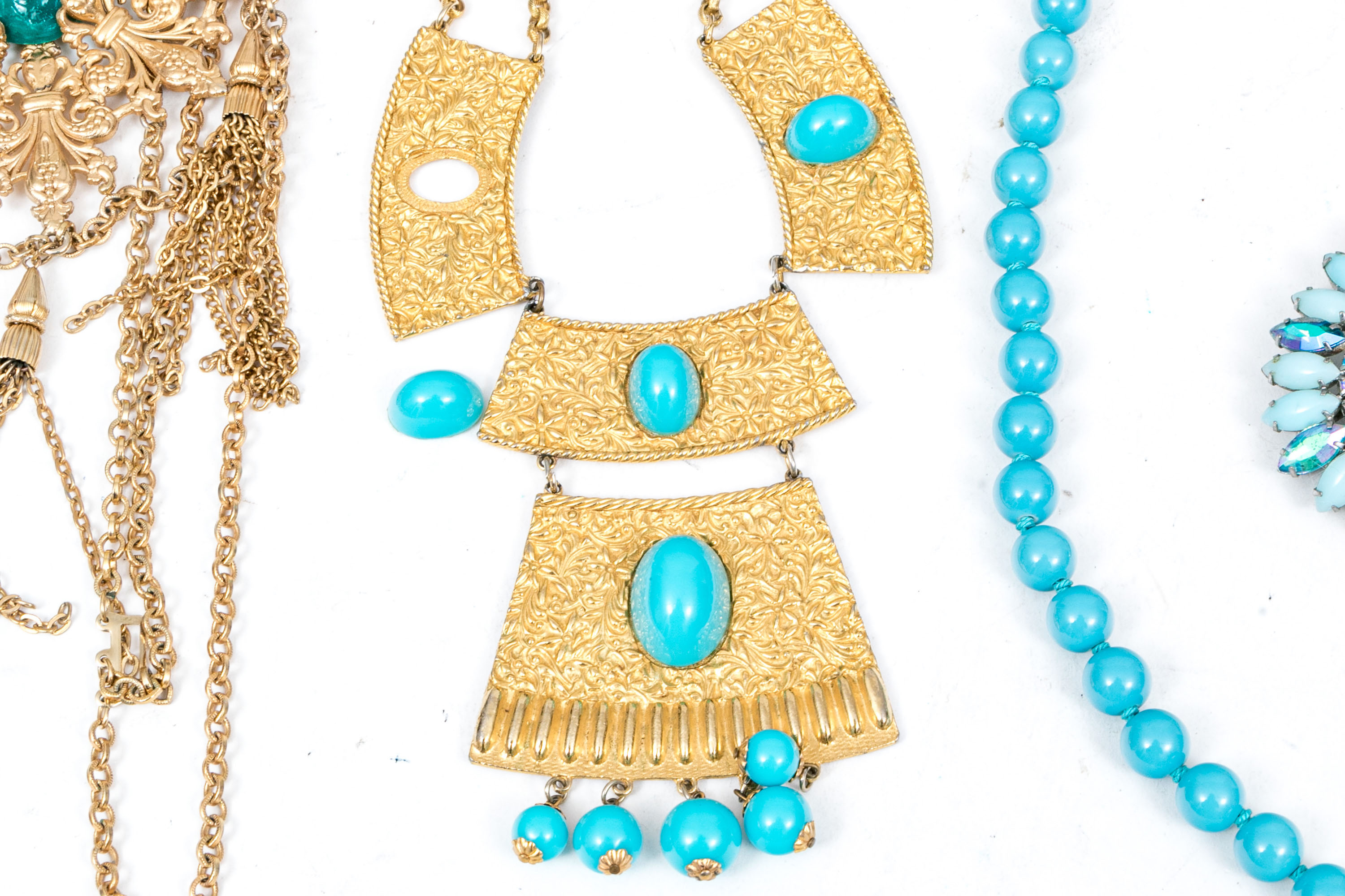 Lot of blue and green toned costume jewelry, including a staggering Napier necklace