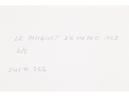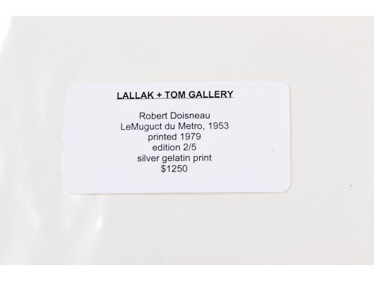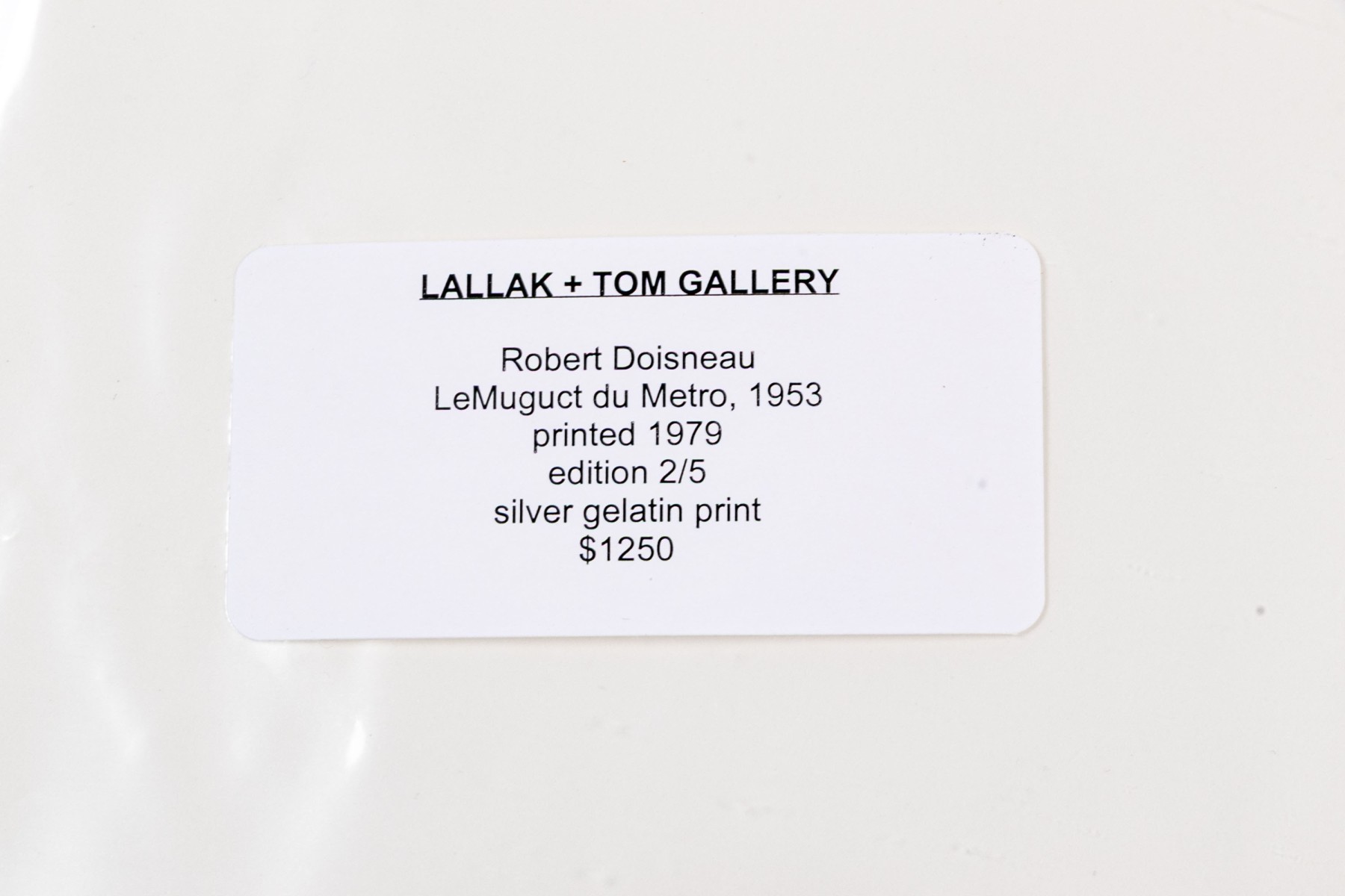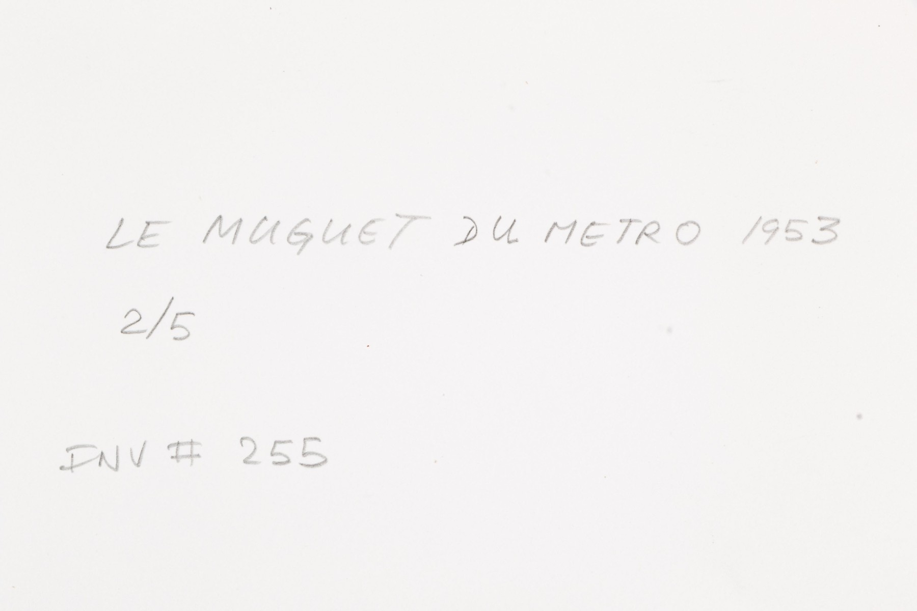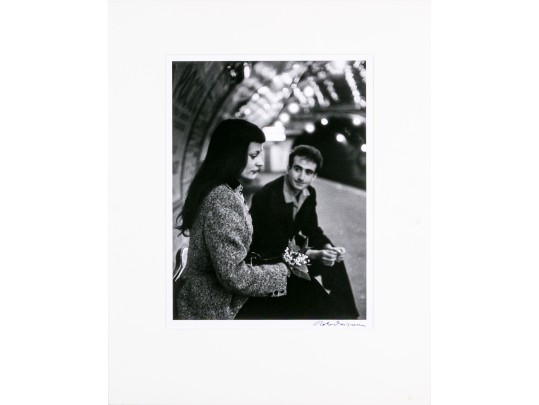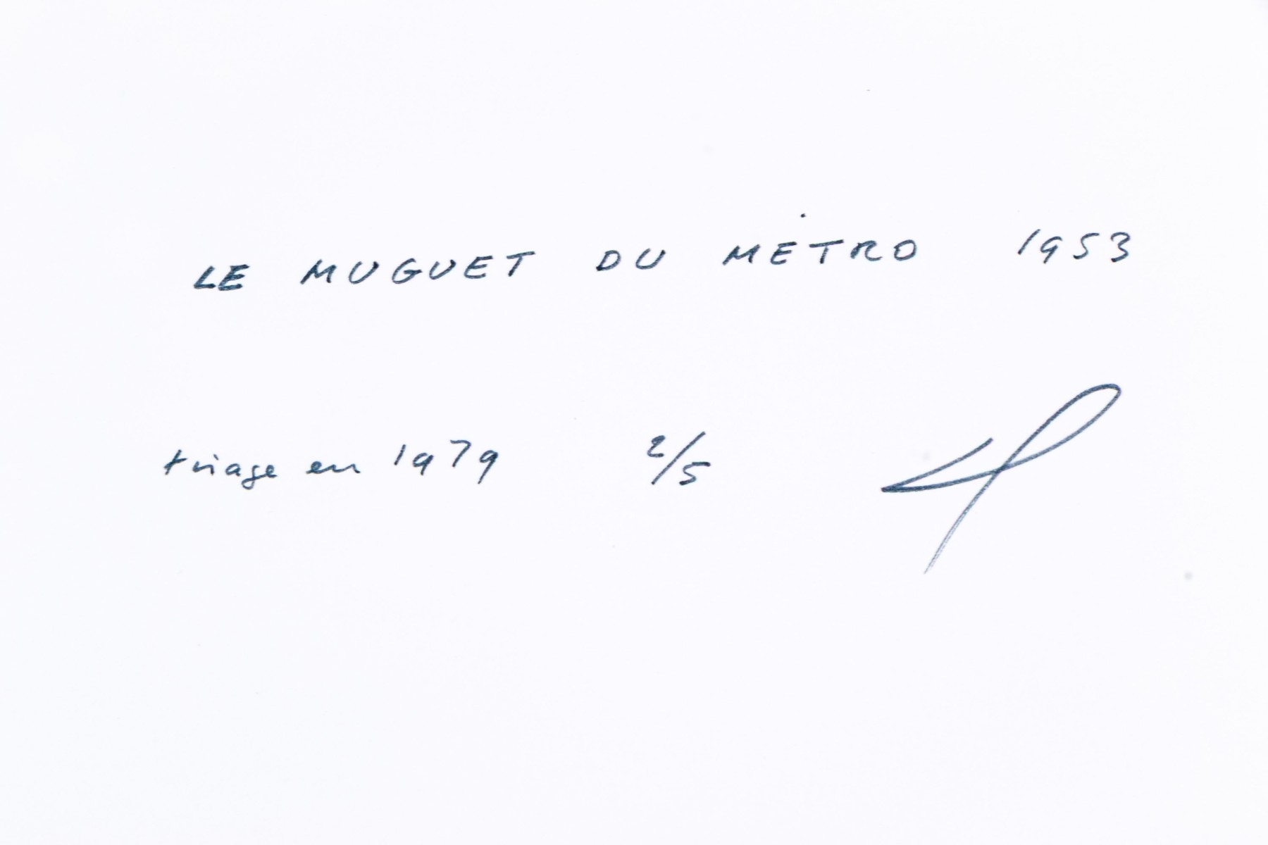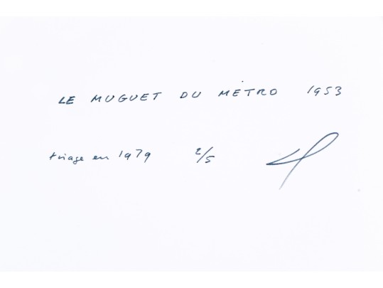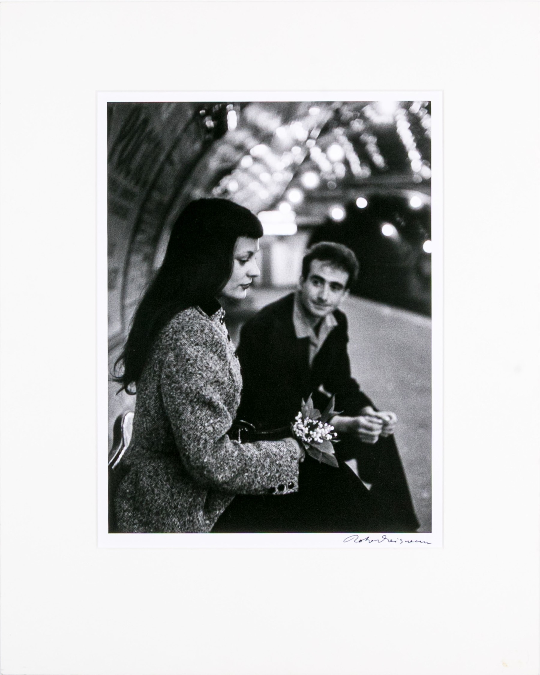 Robert Doisneau (French, 1912-1994) “Le Muguet Du Metro, 1953" gelatin silver print depicting a woman with long, dark hair wearing a gray coat seated in profile while holding flowers, accompanied by a man in black in the mid-ground leading to a view of a metro with bokeh lights overhead. Signed lower right. With written labels on the verso including the print date of 1979 an the edition of 2/5, and bearing a label from Lallak + Tom Gallery denoting the original gallery price of $1,250. Unframed.