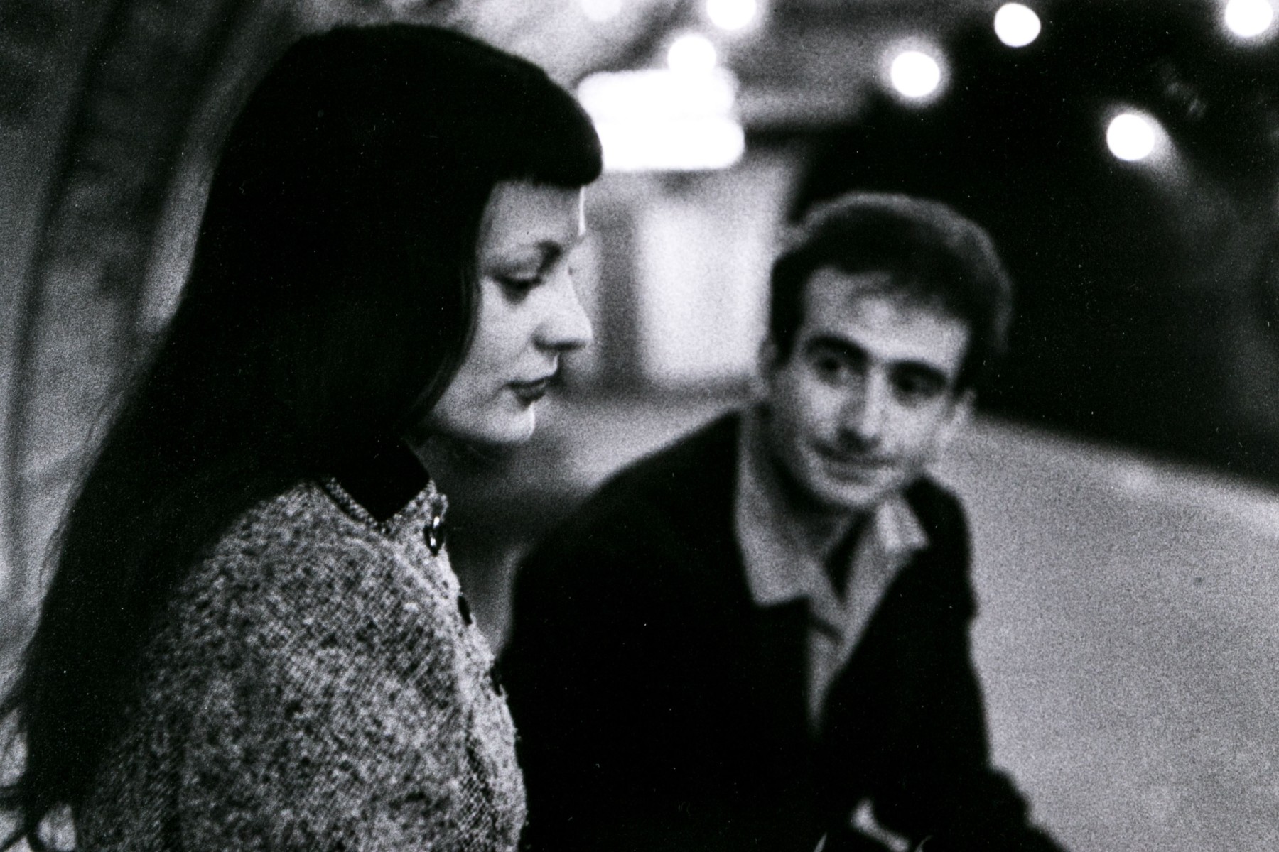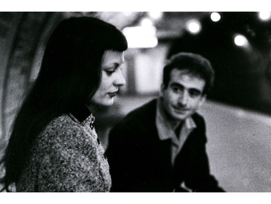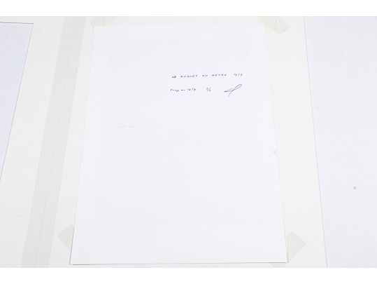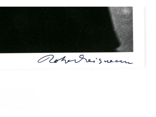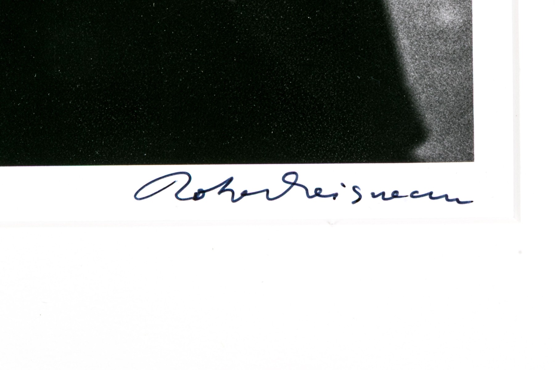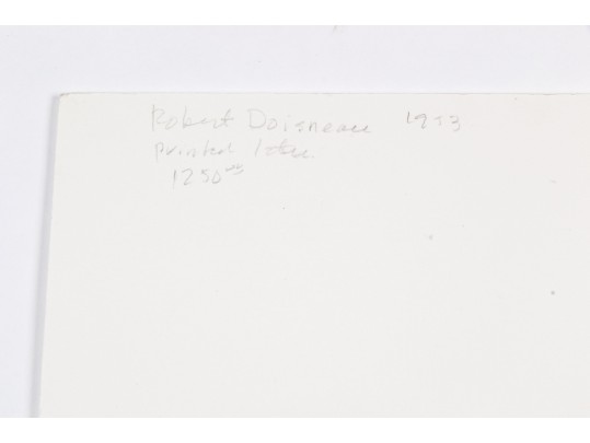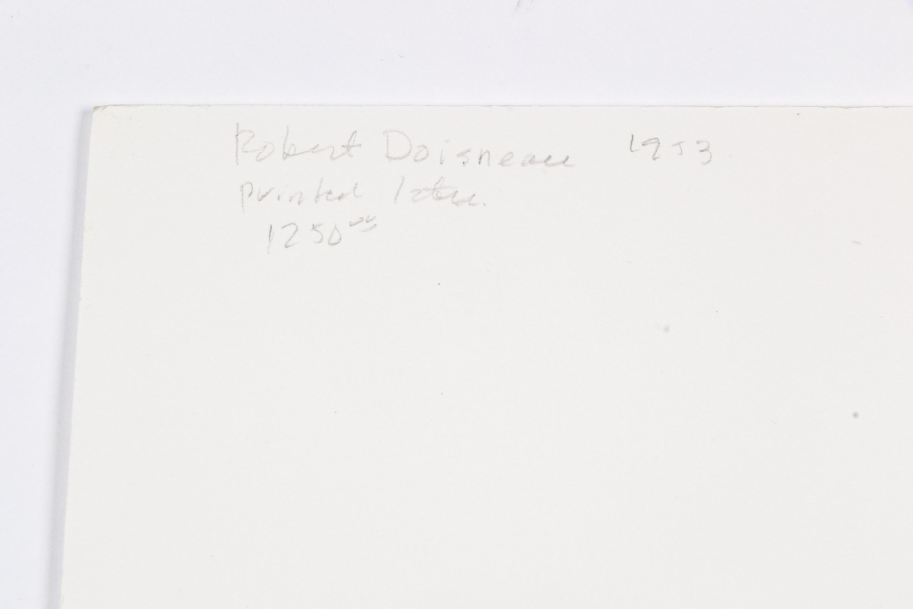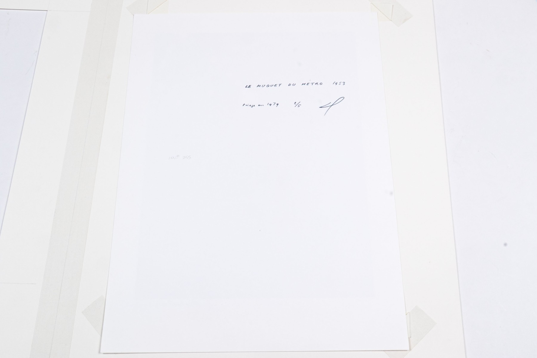 Robert Doisneau (French, 1912-1994) “Le Muguet Du Metro, 1953" gelatin silver print depicting a woman with long, dark hair wearing a gray coat seated in profile while holding flowers, accompanied by a man in black in the mid-ground leading to a view of a metro with bokeh lights overhead. Signed lower right. With written labels on the verso including the print date of 1979 an the edition of 2/5, and bearing a label from Lallak + Tom Gallery denoting the original gallery price of $1,250. Unframed.