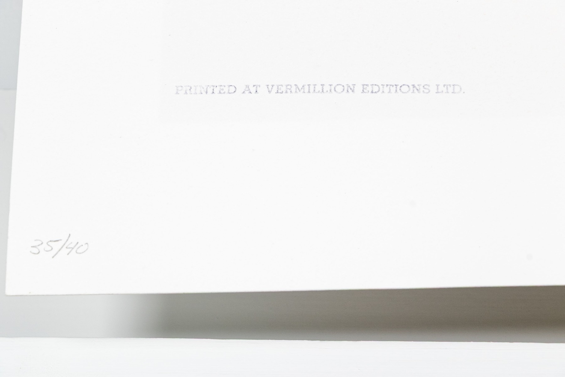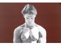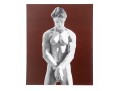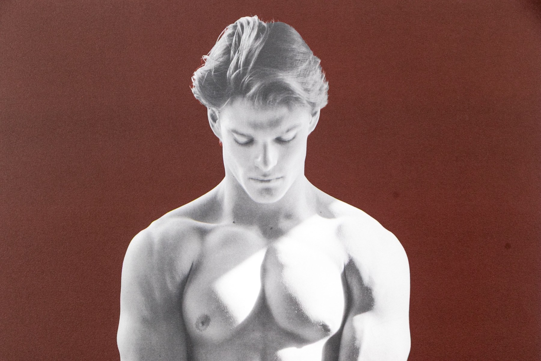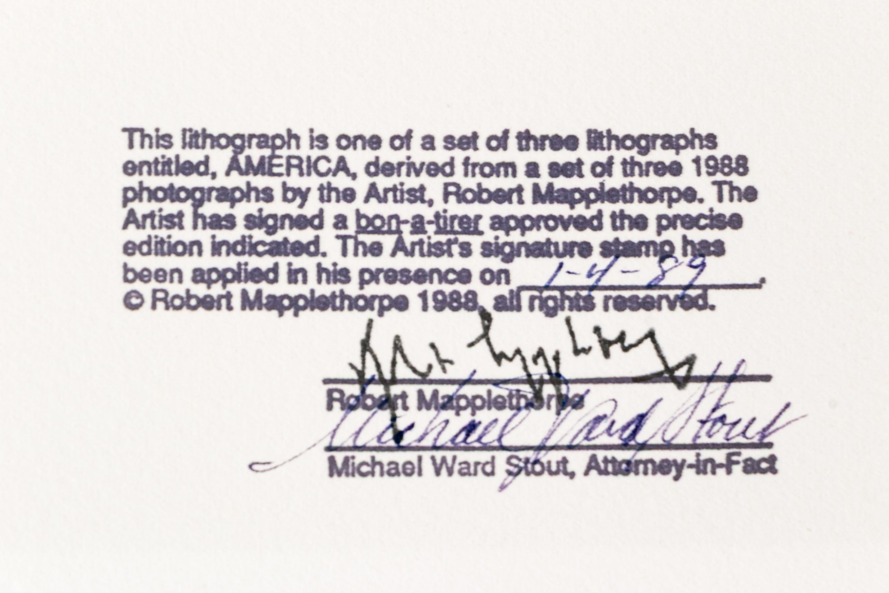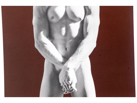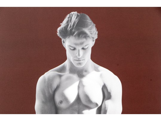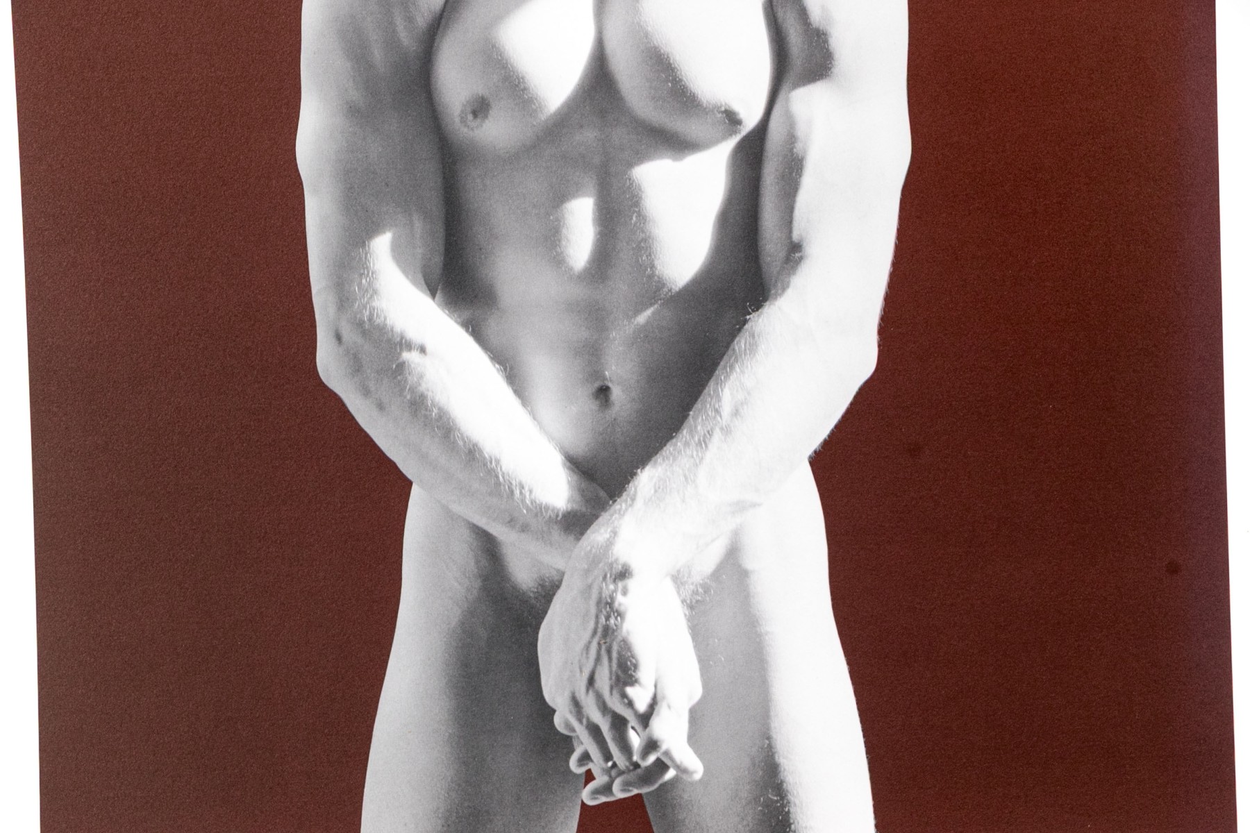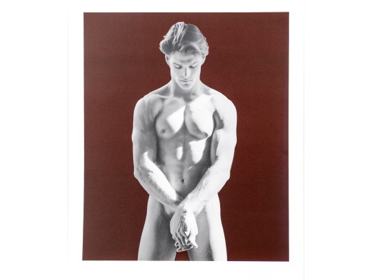Robert Mapplethorpe (American, 1946-1989) photographic print as seen in the "America, 1988" triptych series depicting a male nude posed with hands clasped and head bowed against a red ground. Labeled on the verso. Unframed.