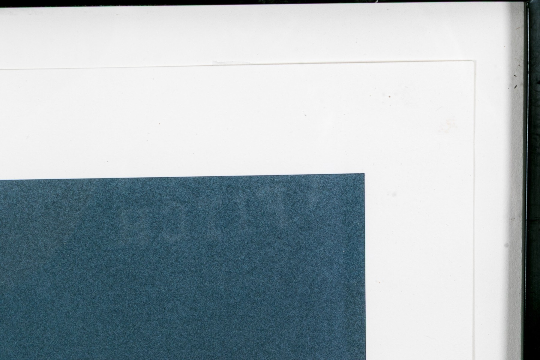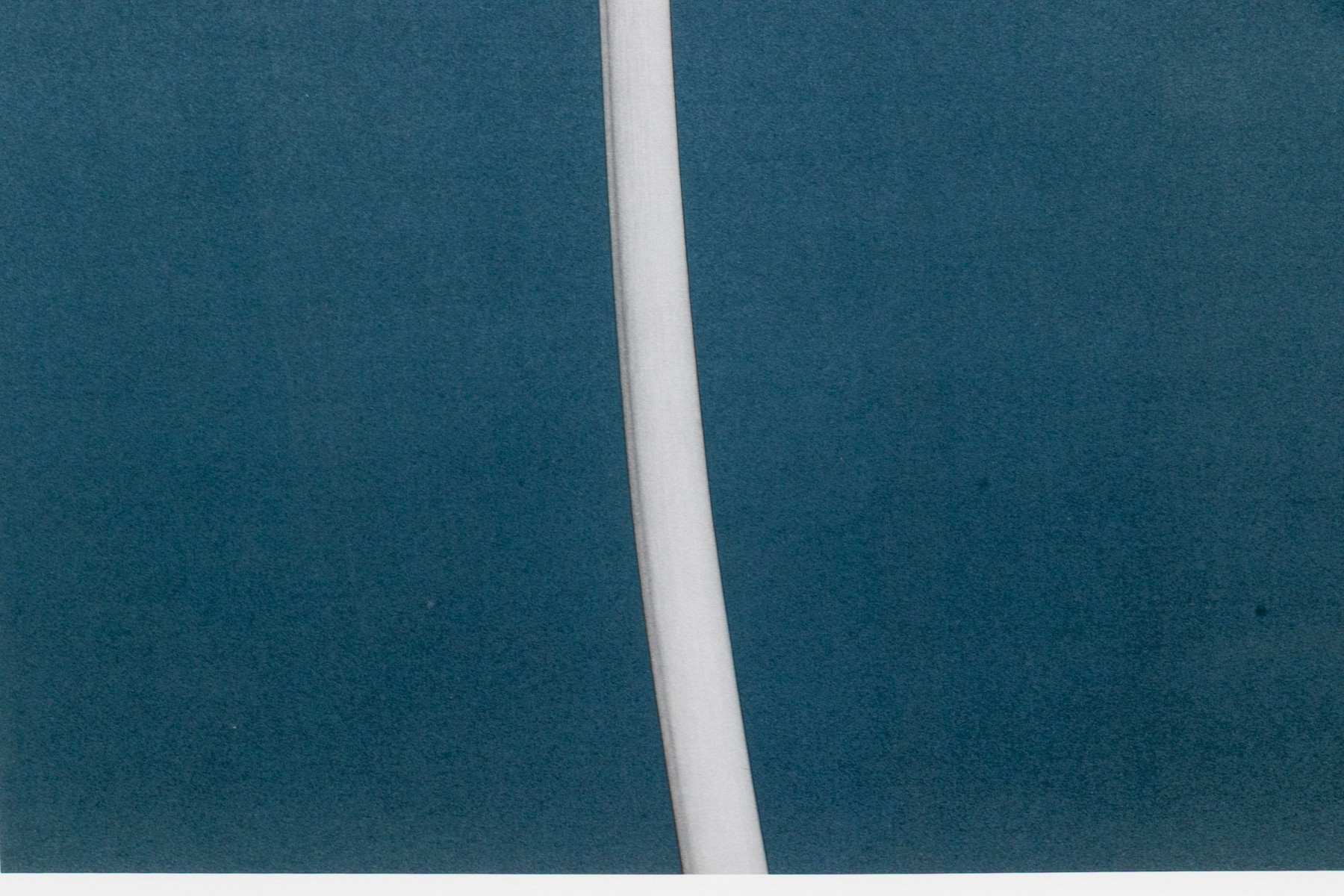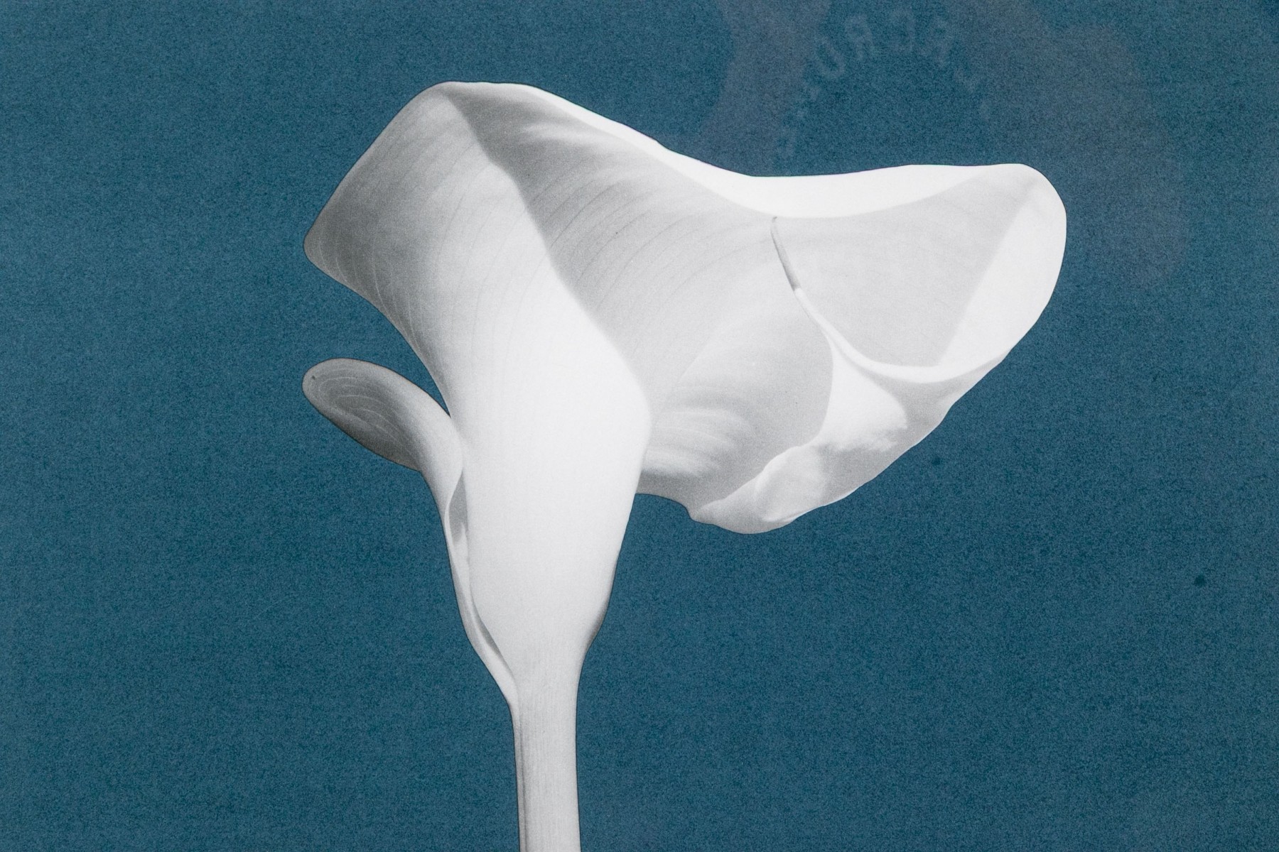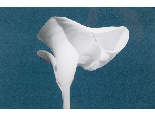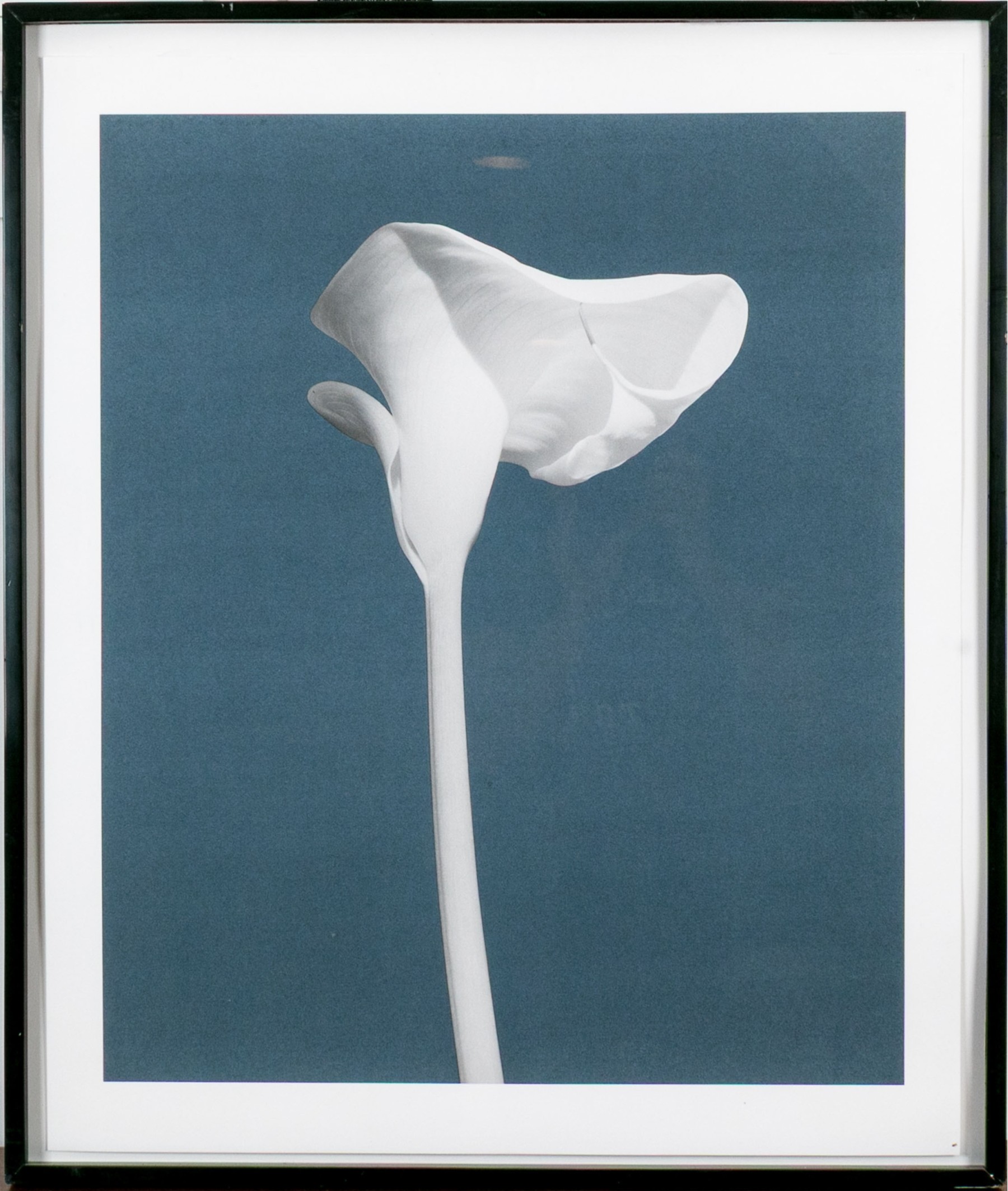 Robert Mapplethorpe (American, 1946-1989) photographic print as seen in the "America, 1988" triptych series depicting a white calla lily on a tall, white stem viewed from a slightly upward angle against a cerulean blue ground.