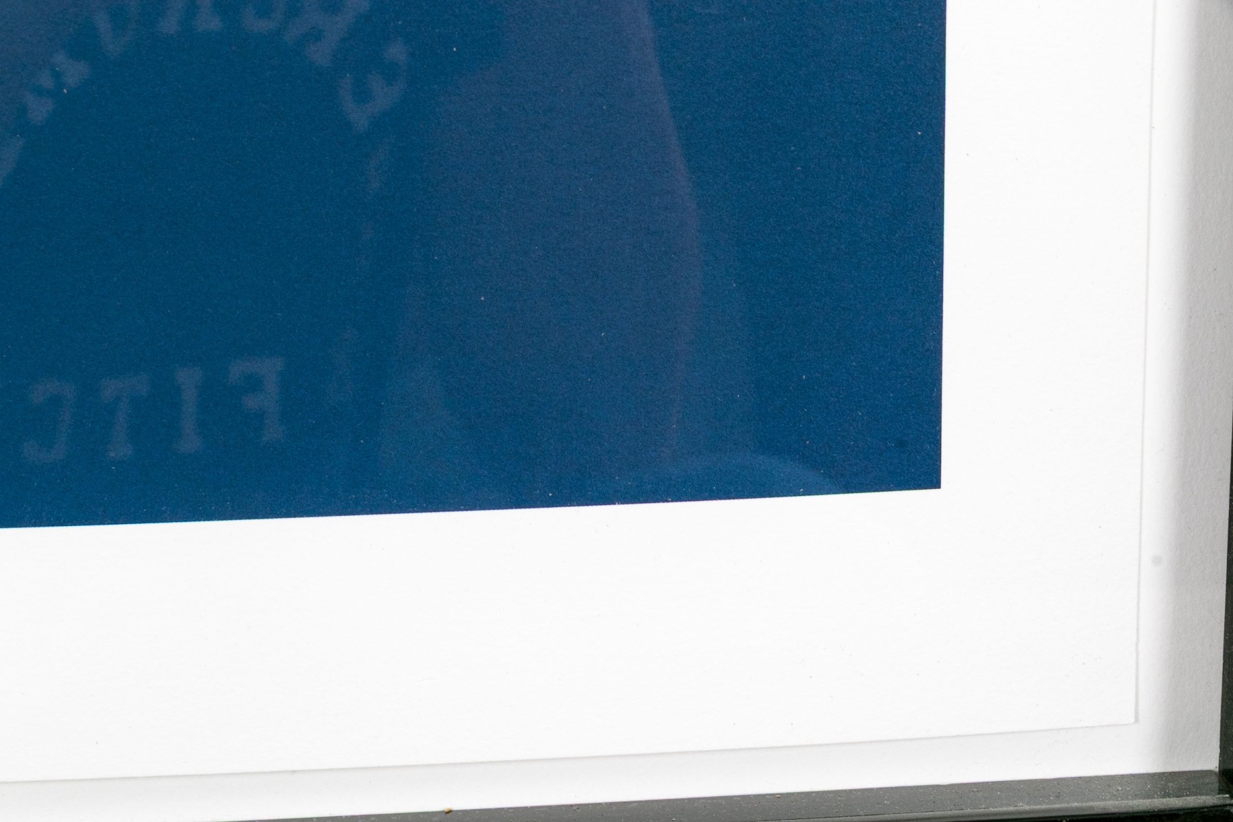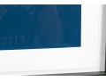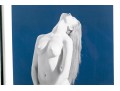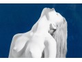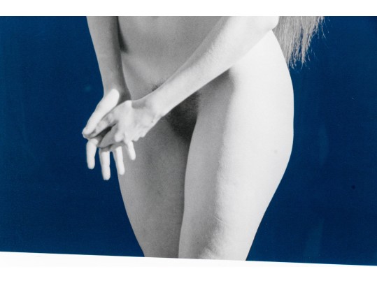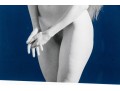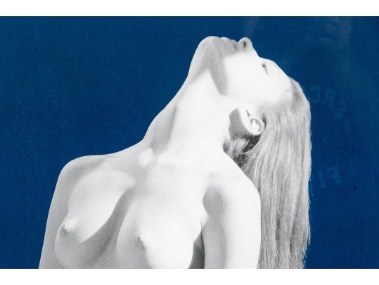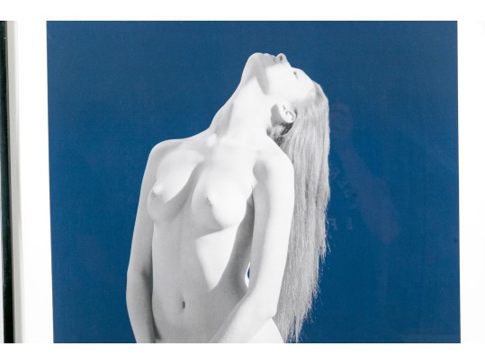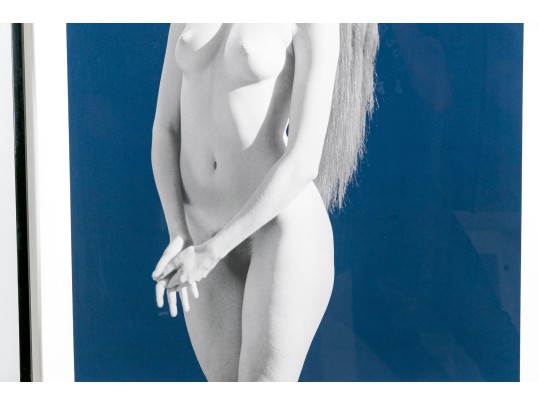 Robert Mapplethorpe (American, 1946-1989) photographic print as seen in the "America, 1988" triptych series depicting a female nude posed with hands clasped and head tilted back with long blonde hair against a blue ground.