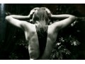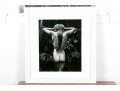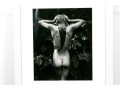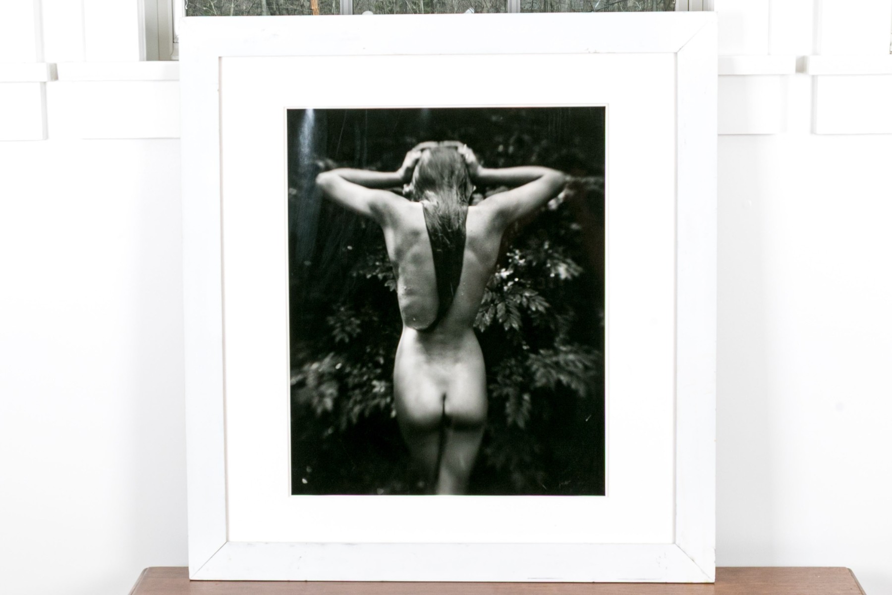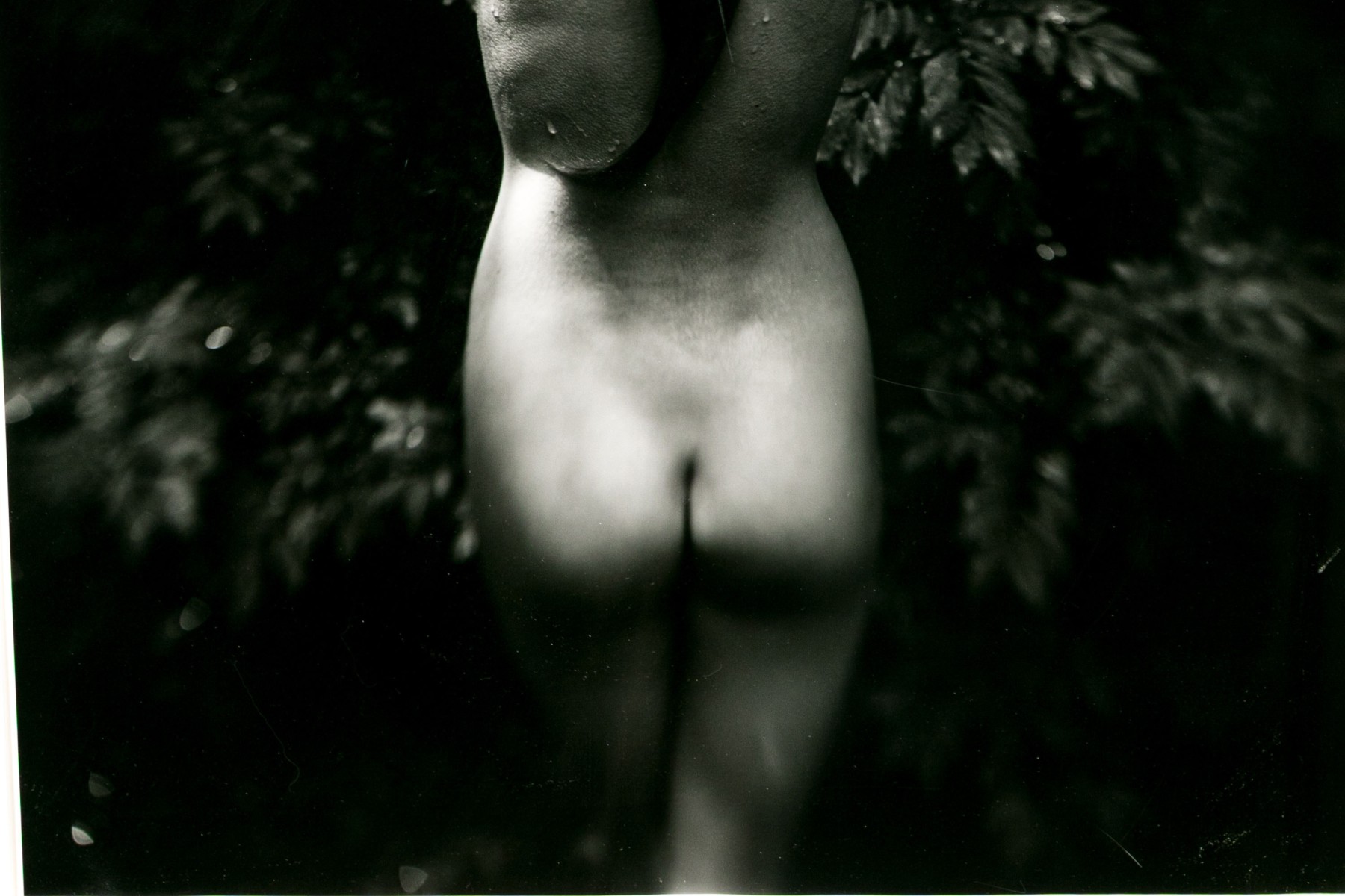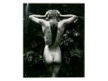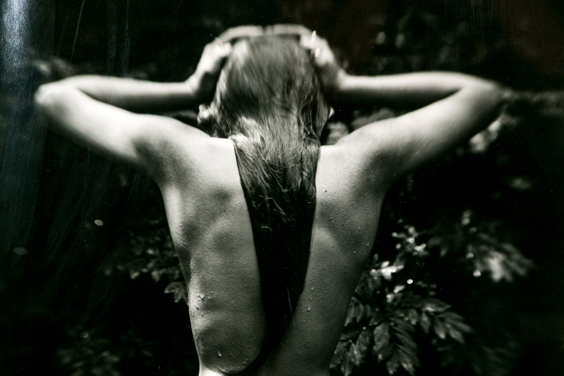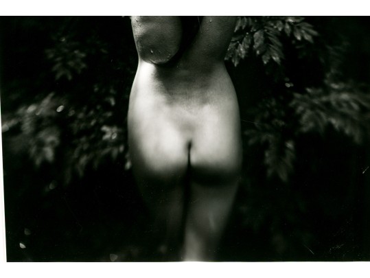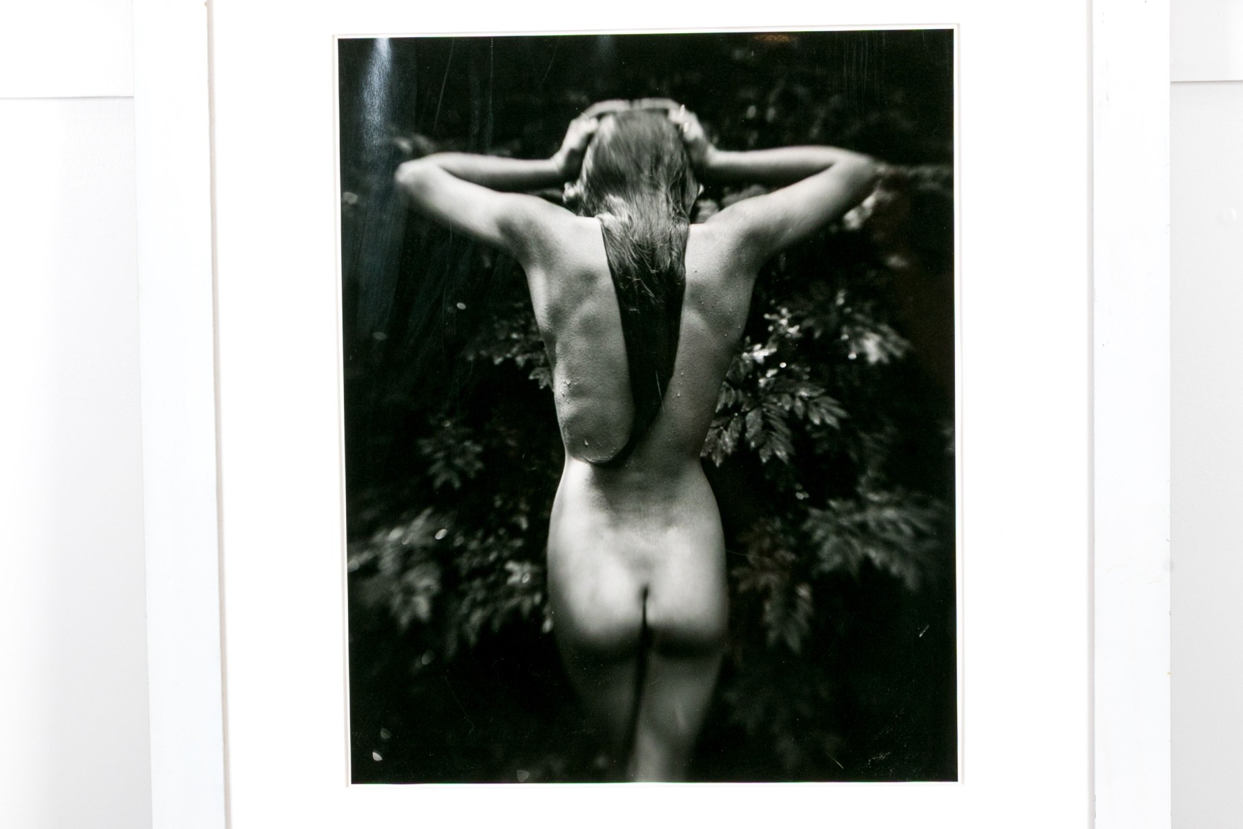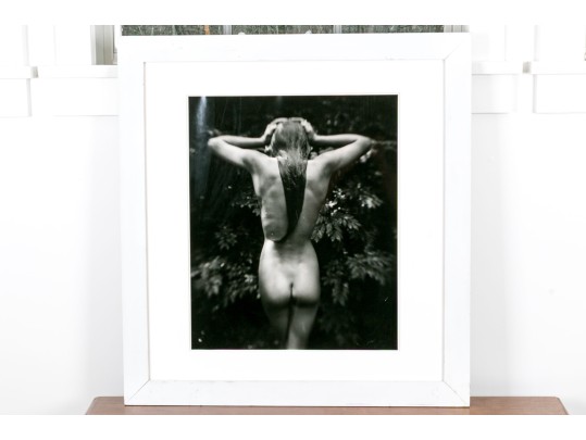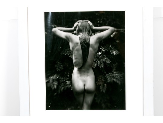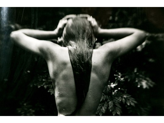 Sally Mann (American, b. 1951) "Punctus" Gelatin silver print depicting a female nude posed standing away from the viewer with hands raised to slick back wet hair against a lush foliate background. Mann's keen eye for composition captures a delicate balance of light and shadow with the way the figure's raised arms lead the eye through the composition, leading down the dramatic, sleek curve of long hair swooping to the left at the ends.
