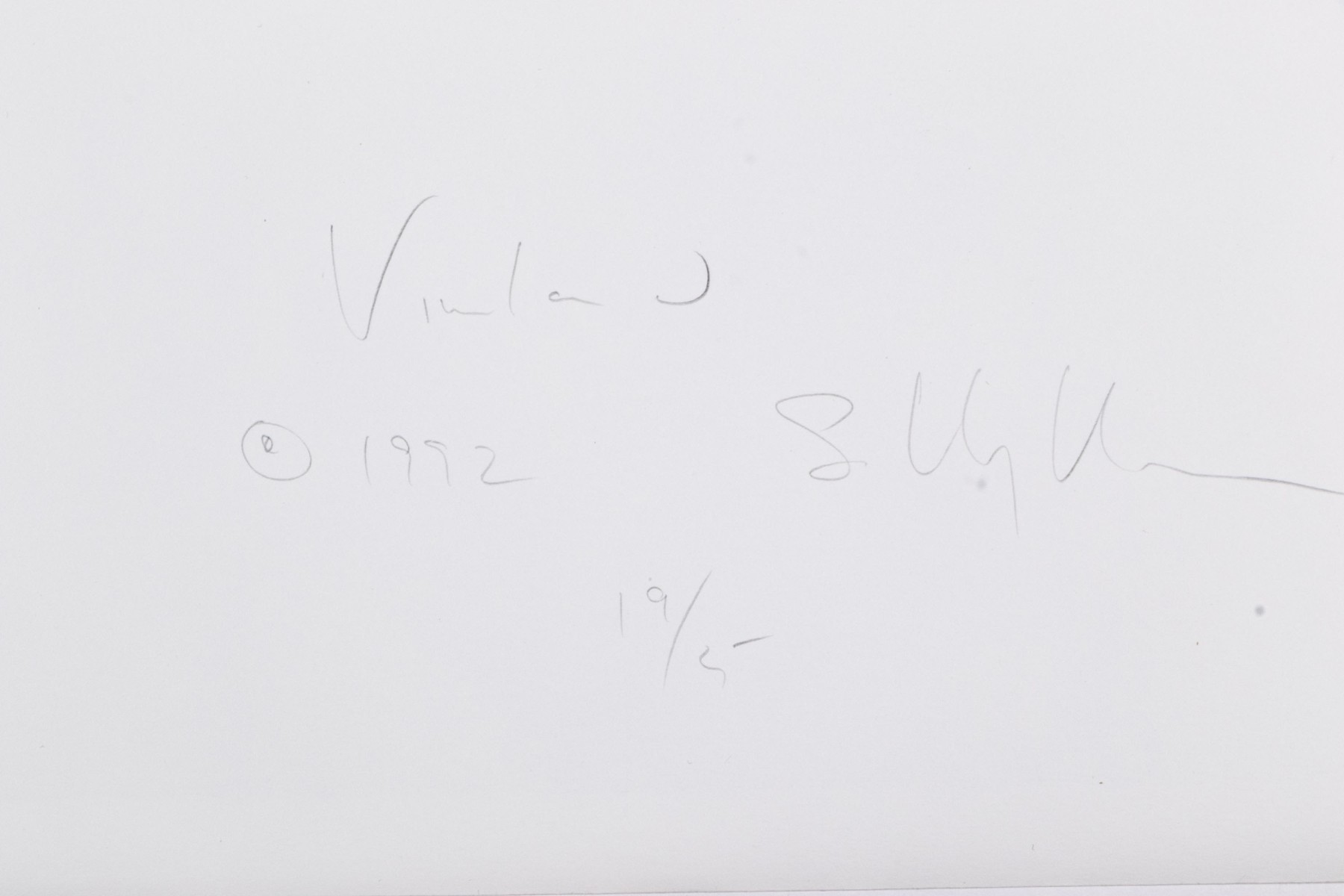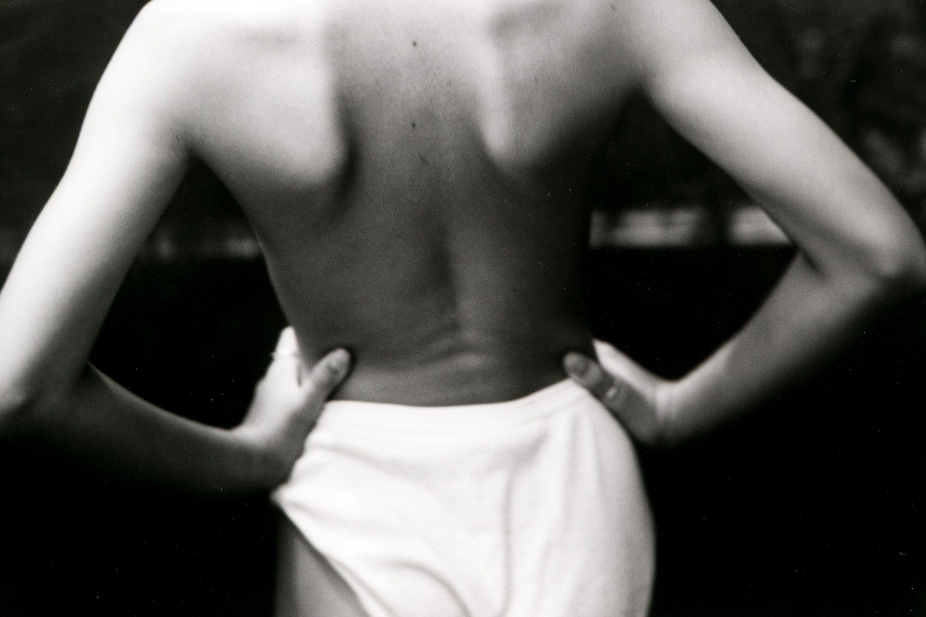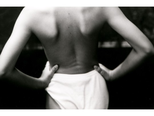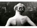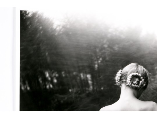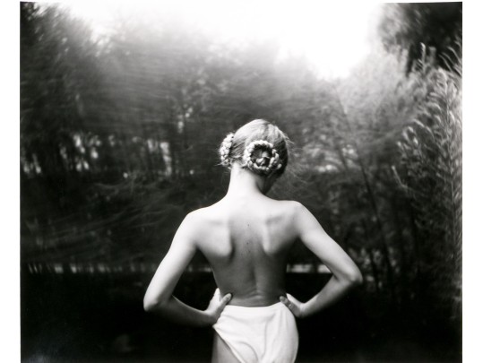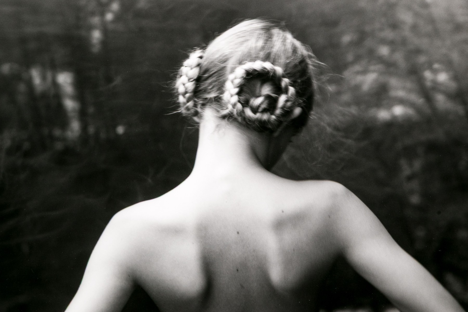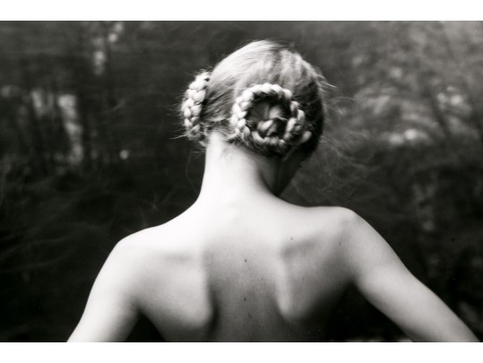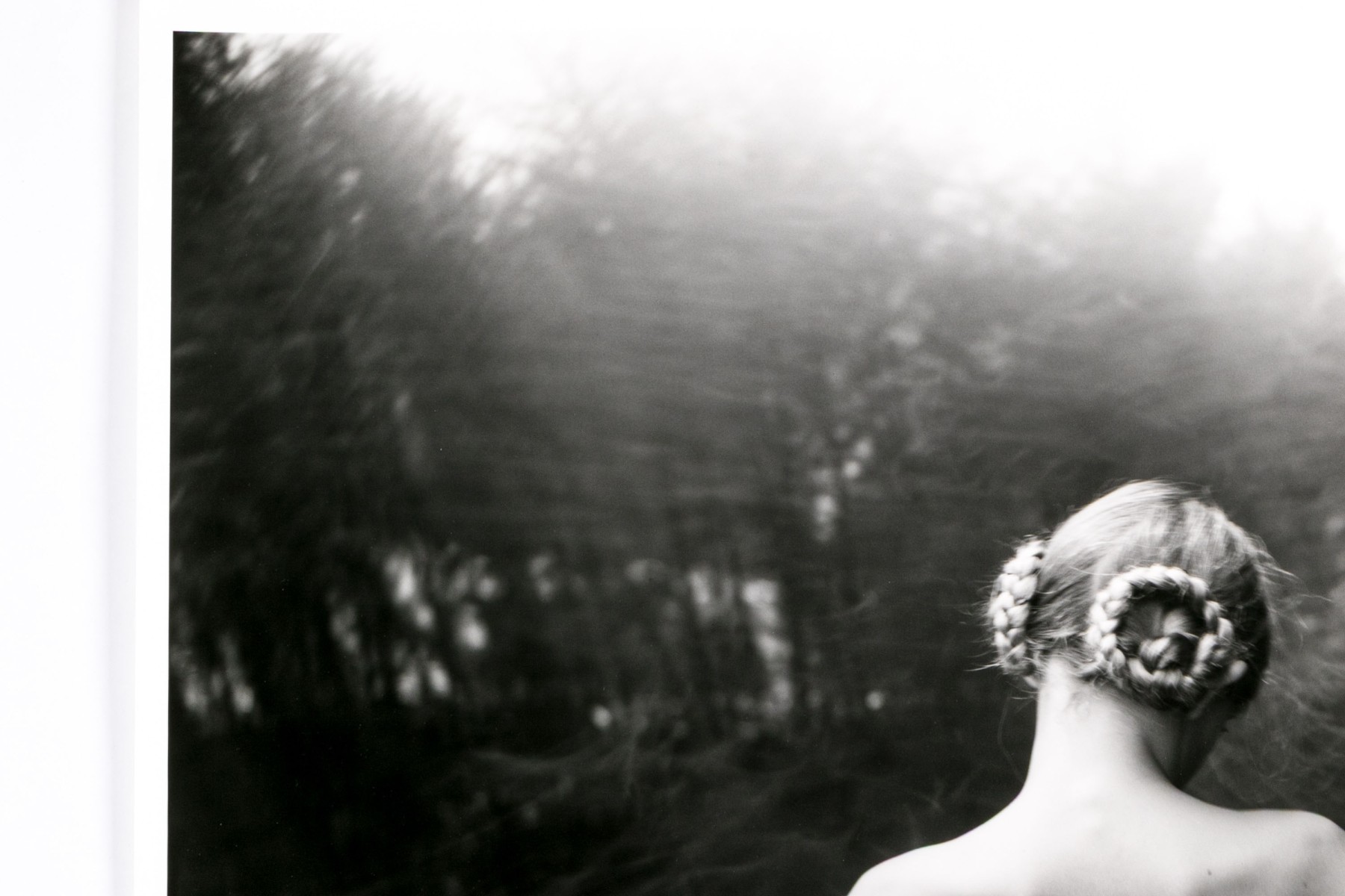 Sally Mann (American, b. 1951) "Vinland, 1992" gelatin silver print depicting a girl with blonde braided hair pinned in loops, posed standing facing away from the viewer with hands resting on her hips as she gazes out at a natural landscape. Mann masterfully conveys the essence of childhood with the distinct attitude in the girl's pose balanced by the serene and somber backdrop. The clarity of the figure and playful pose contrasted with the view facing away and the gentle blur of the environment tell a story of vibrant childhood emotions and hazy, nostalgic memories.