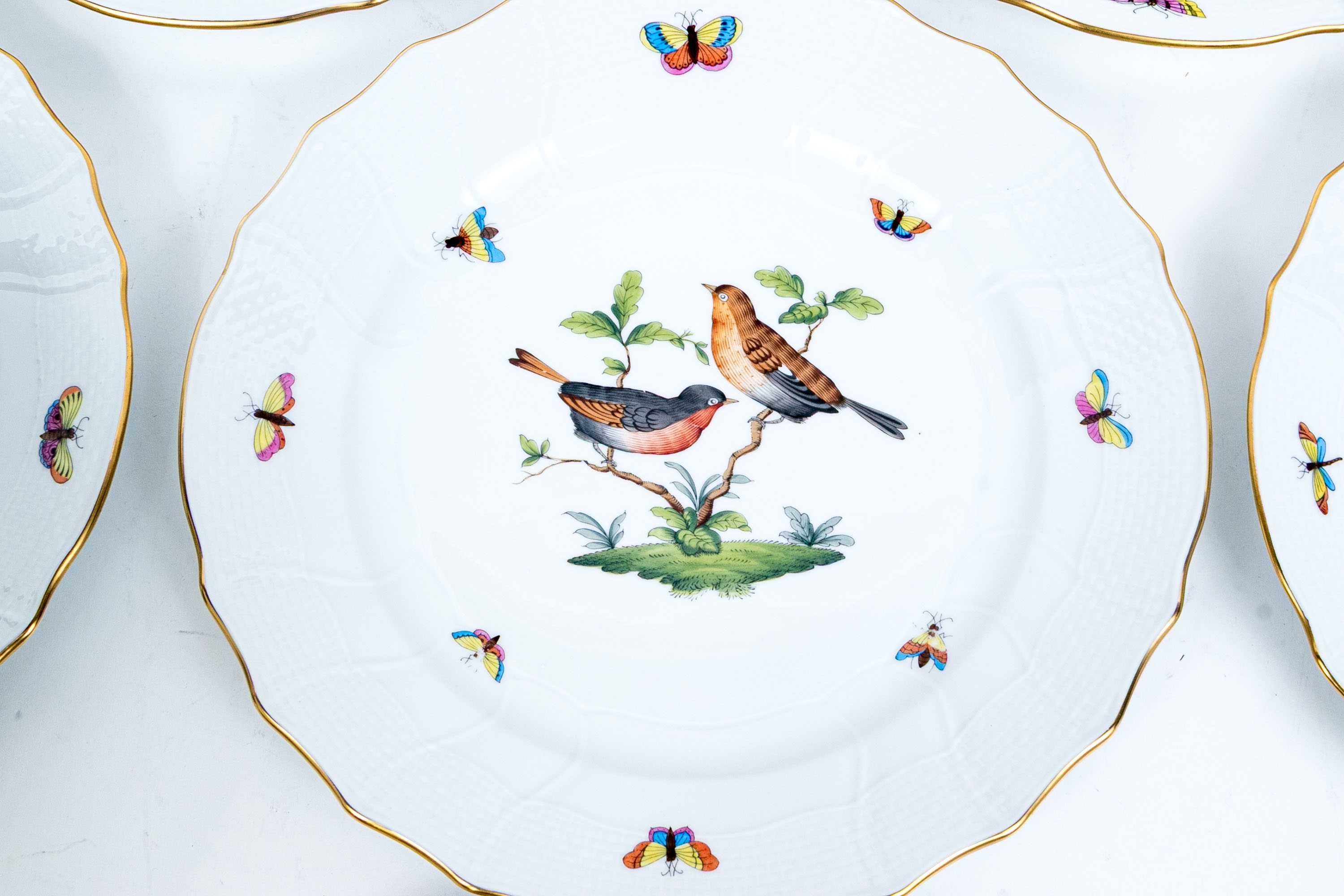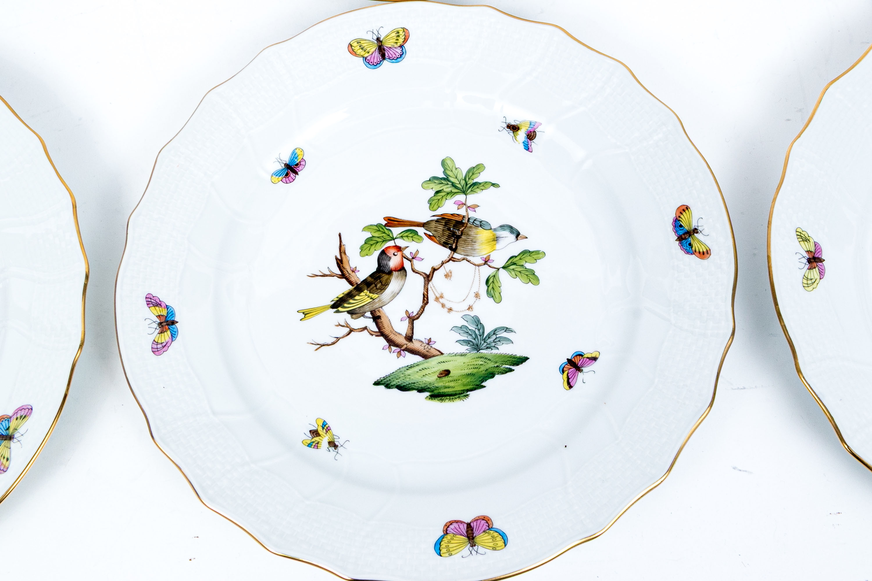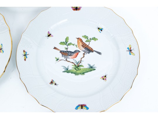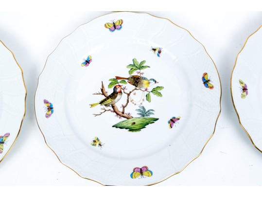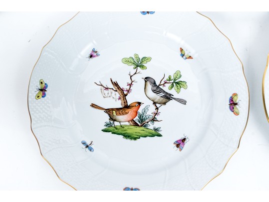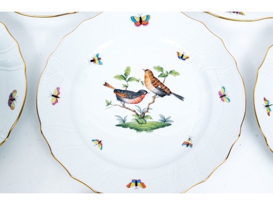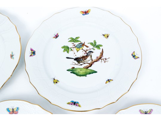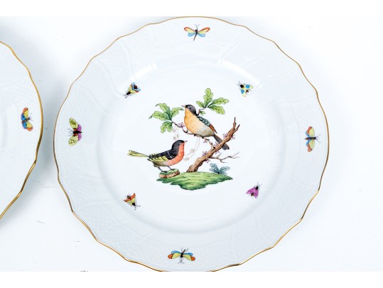 Set of eight Herend Hungary hand-painted porcelain dinner plates, featuring the Rothschild Bird (RO) pattern with elegant 24K gold trim. Each plate displays Herend’s signature basketweave (osier) molded border and gently scalloped edge, meticulously accented with a fine gold rim. The centers are decorated with unique bird and insect compositions, each distinct from the others—a hallmark of the Rothschild Bird series. Each piece bears the Herend Hungary blue shield hallmark with crossed paintbrushes, HANDPAINTED, and the pattern number 1524/RO.