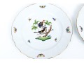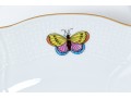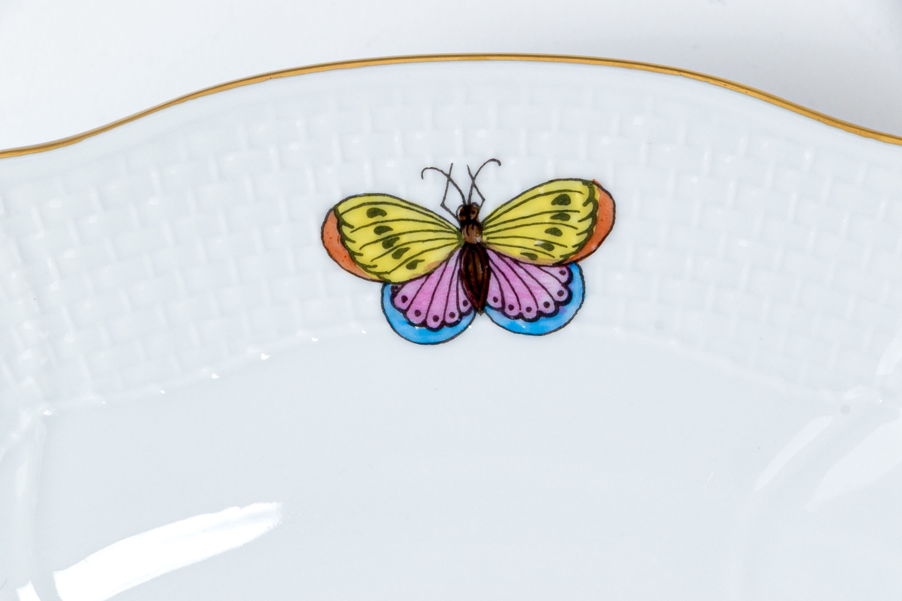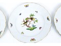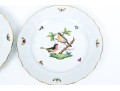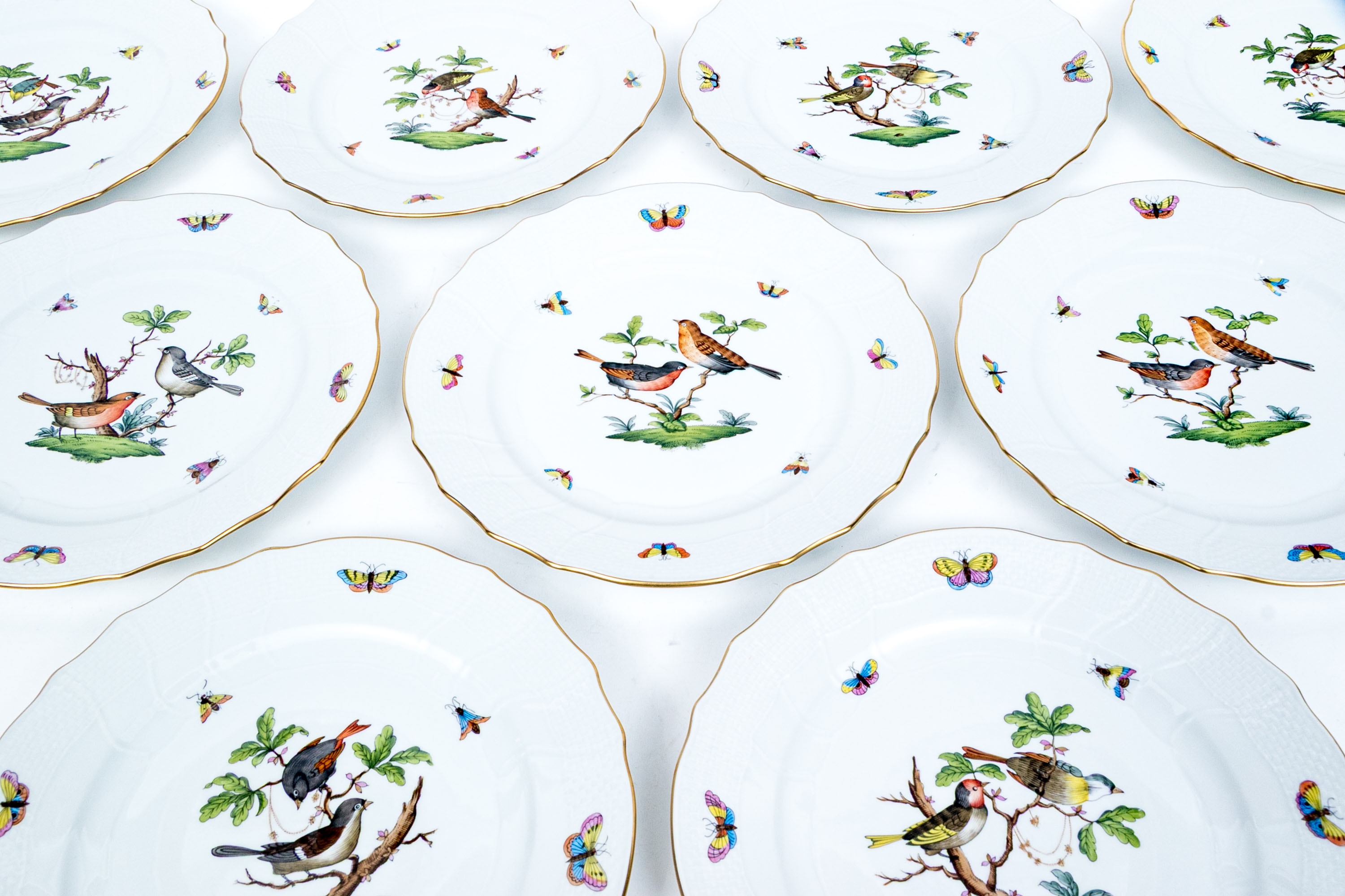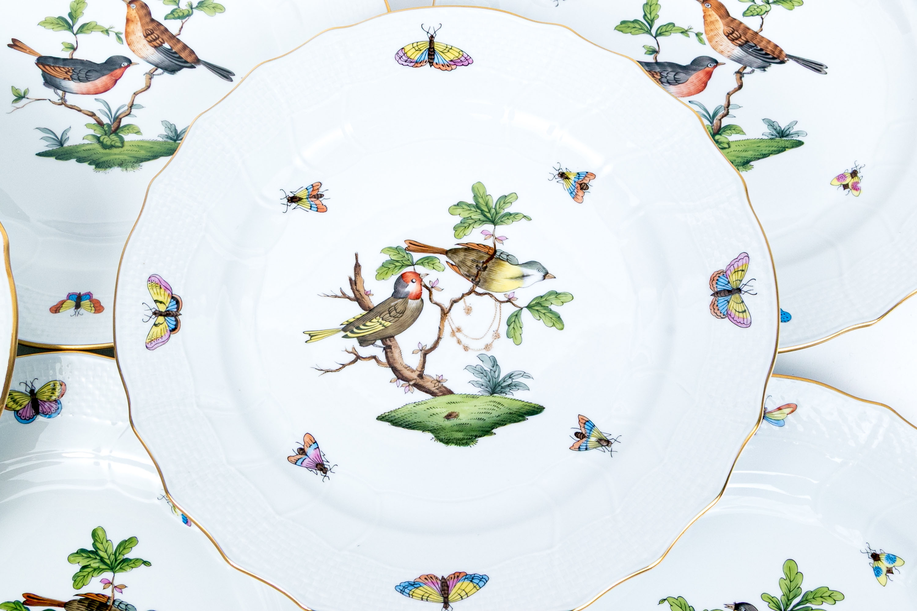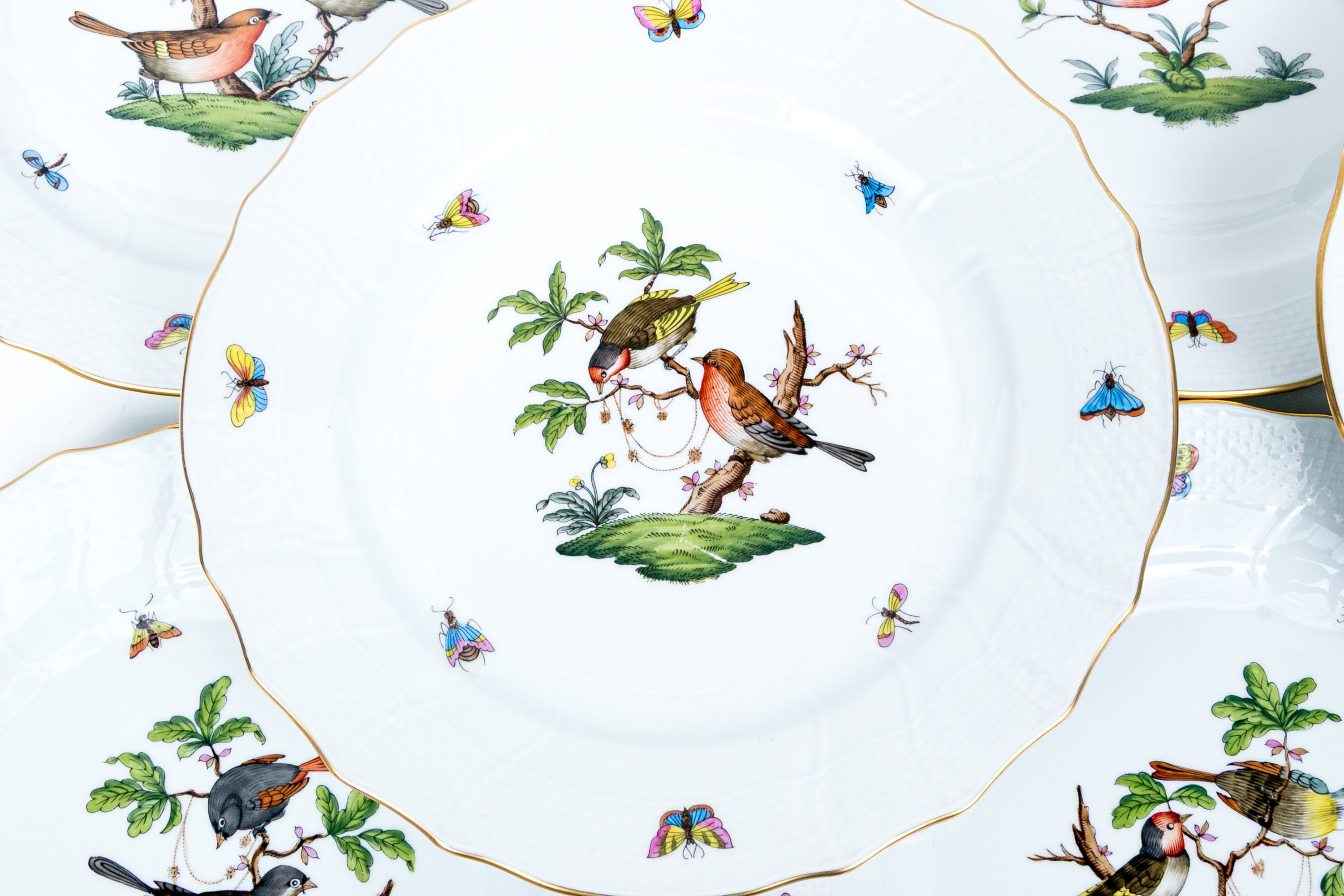Set of eight Herend Hungary hand-painted porcelain dinner plates, featuring the Rothschild Bird (RO) pattern with elegant 24K gold trim. Each plate displays Herend’s signature basketweave (osier) molded border and gently scalloped edge, meticulously accented with a fine gold rim. The centers are decorated with unique bird and insect compositions, each distinct from the others—a hallmark of the Rothschild Bird series. Each piece bears the Herend Hungary blue shield hallmark with crossed paintbrushes, HANDPAINTED, and the pattern number 1524/RO.