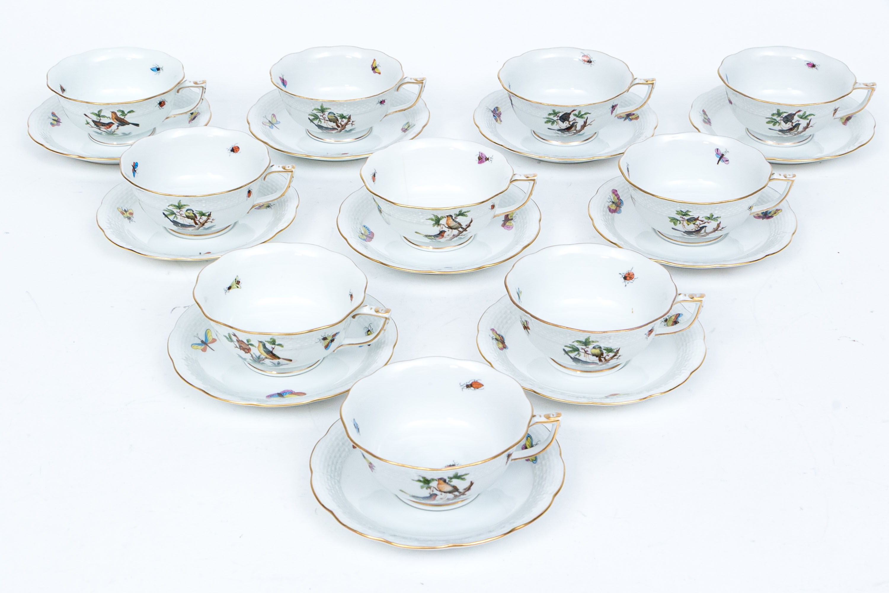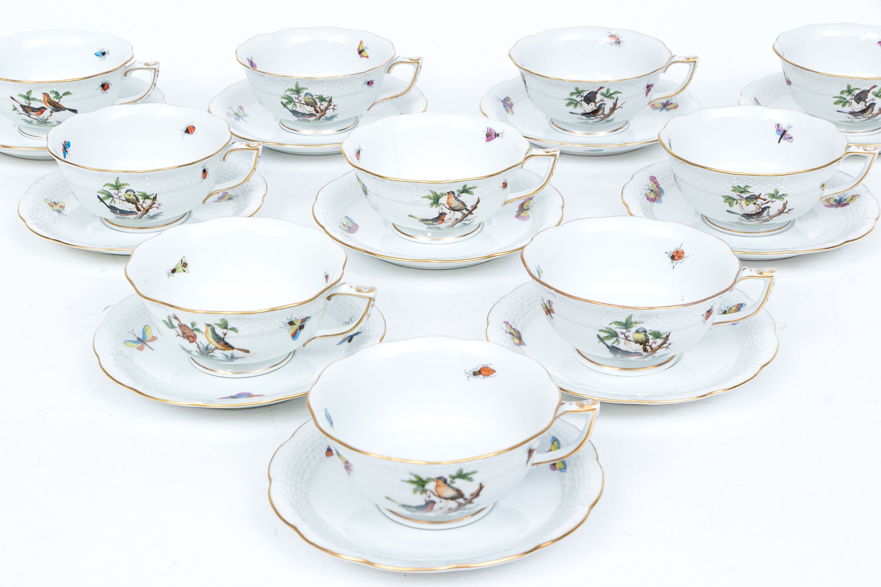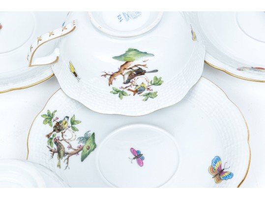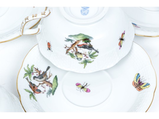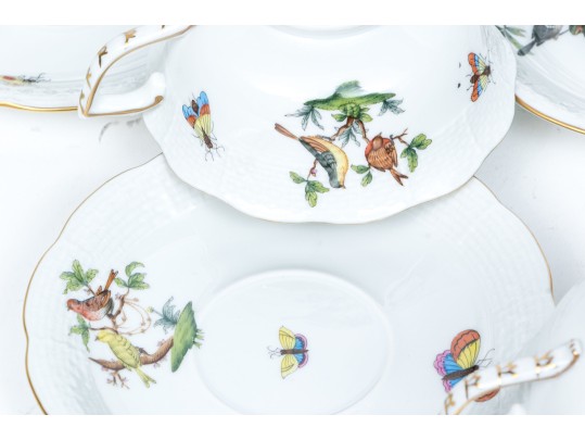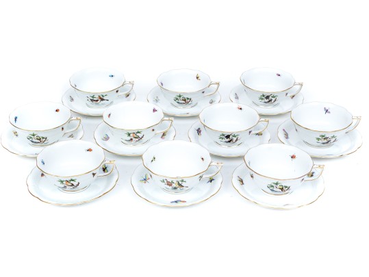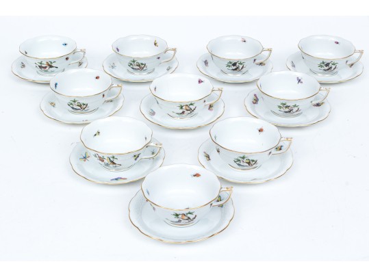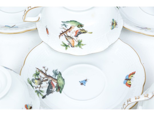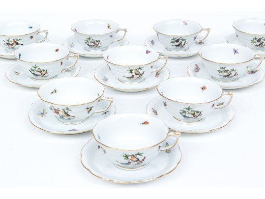 Set of ten Herend Hungary hand-painted porcelain tea cups with matching saucers, each executed in the Rothschild Bird (RO) pattern with 24K gold trim. Every cup and saucer displays Herend’s signature osier (basketweave) molded border and gently scalloped rim. The exteriors are richly decorated with the Rothschild Bird motif — pairs of finely detailed songbirds perched on delicate tree branches, surrounded by colorful butterflies, beetles, and insects rendered in luminous enamel tones of blue, green, orange, pink, and yellow.