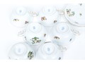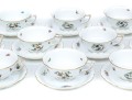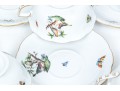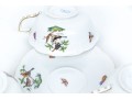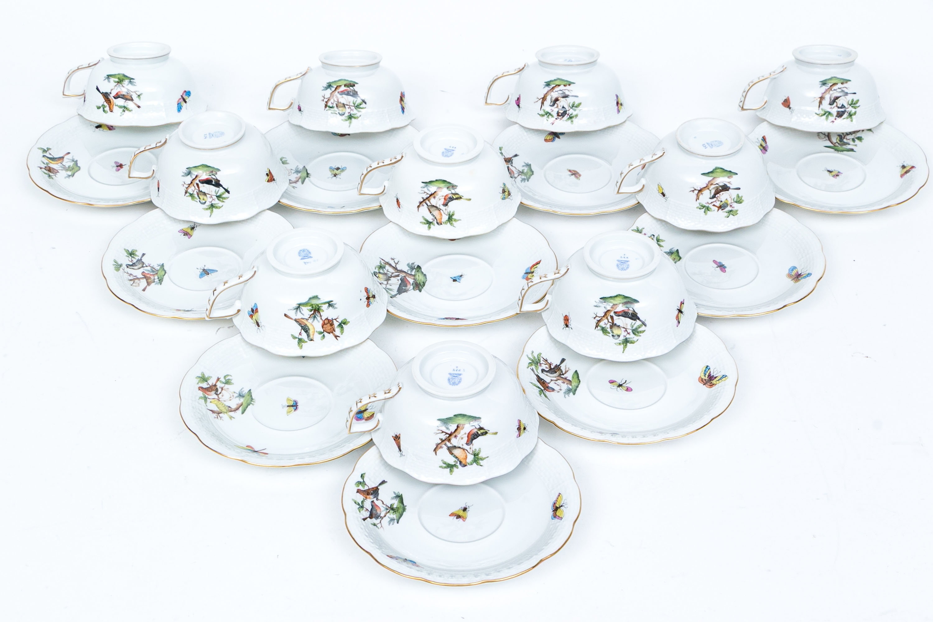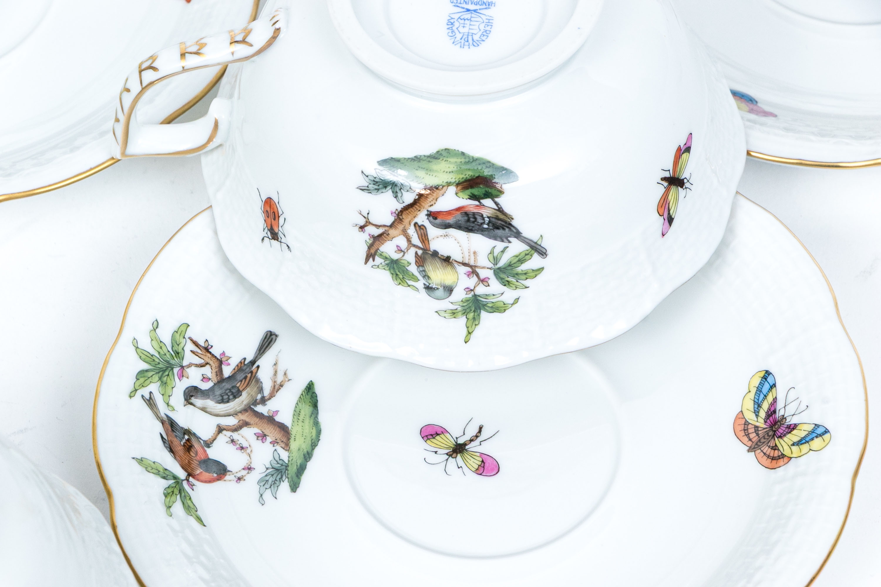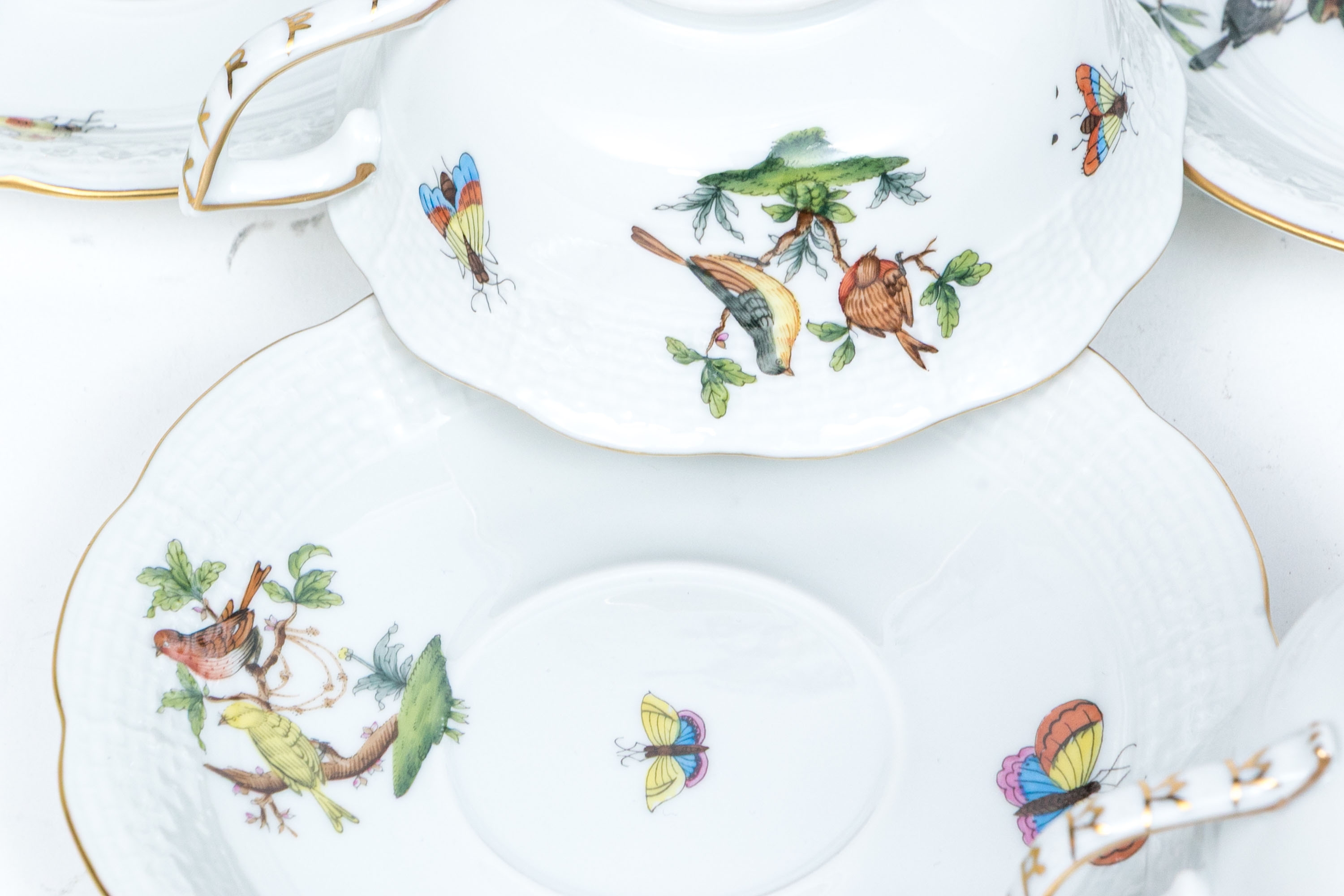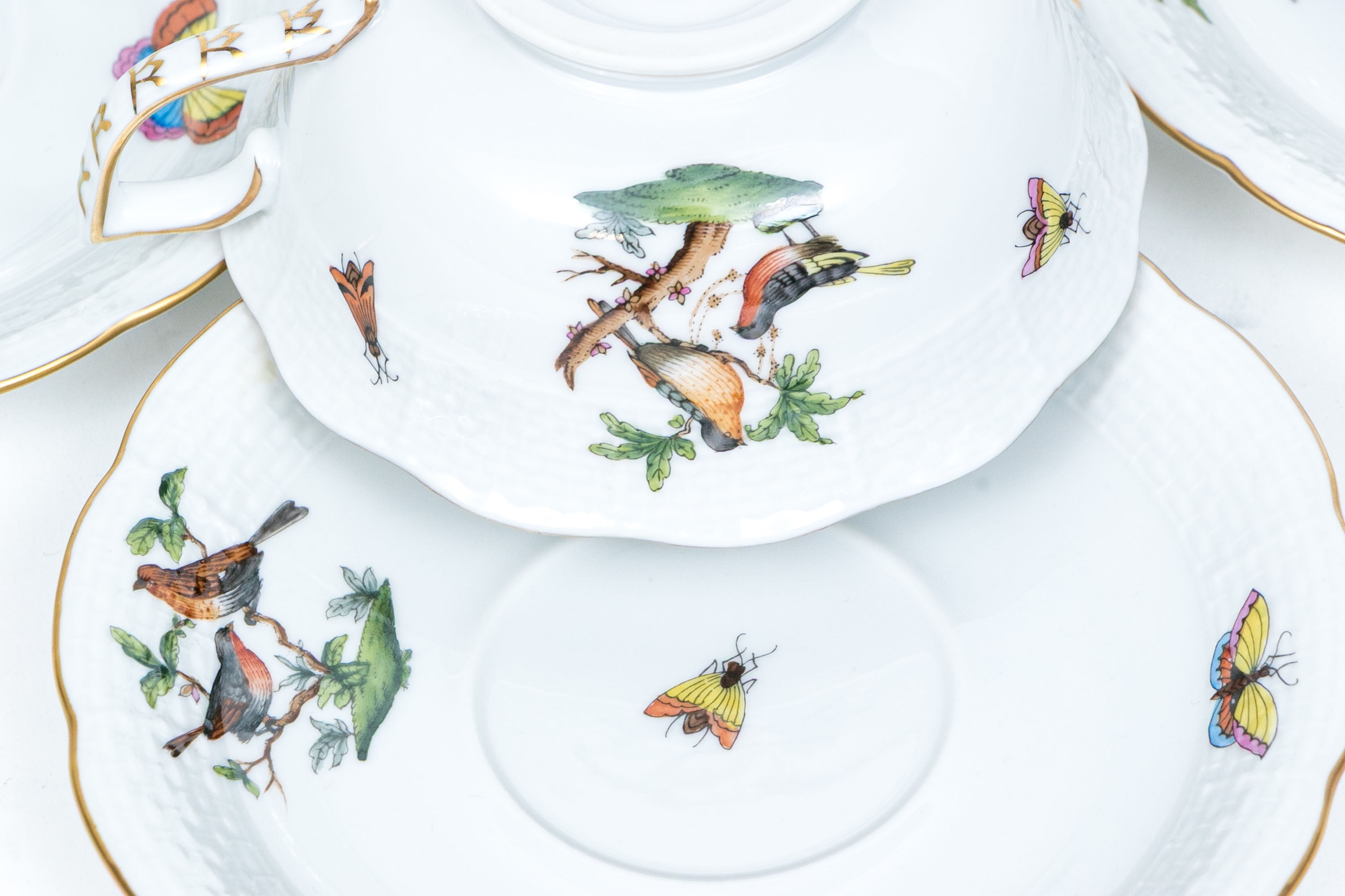 Set of ten Herend Hungary hand-painted porcelain tea cups with matching saucers, each executed in the Rothschild Bird (RO) pattern with 24K gold trim. Every cup and saucer displays Herend’s signature osier (basketweave) molded border and gently scalloped rim. The exteriors are richly decorated with the Rothschild Bird motif — pairs of finely detailed songbirds perched on delicate tree branches, surrounded by colorful butterflies, beetles, and insects rendered in luminous enamel tones of blue, green, orange, pink, and yellow.