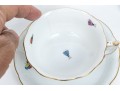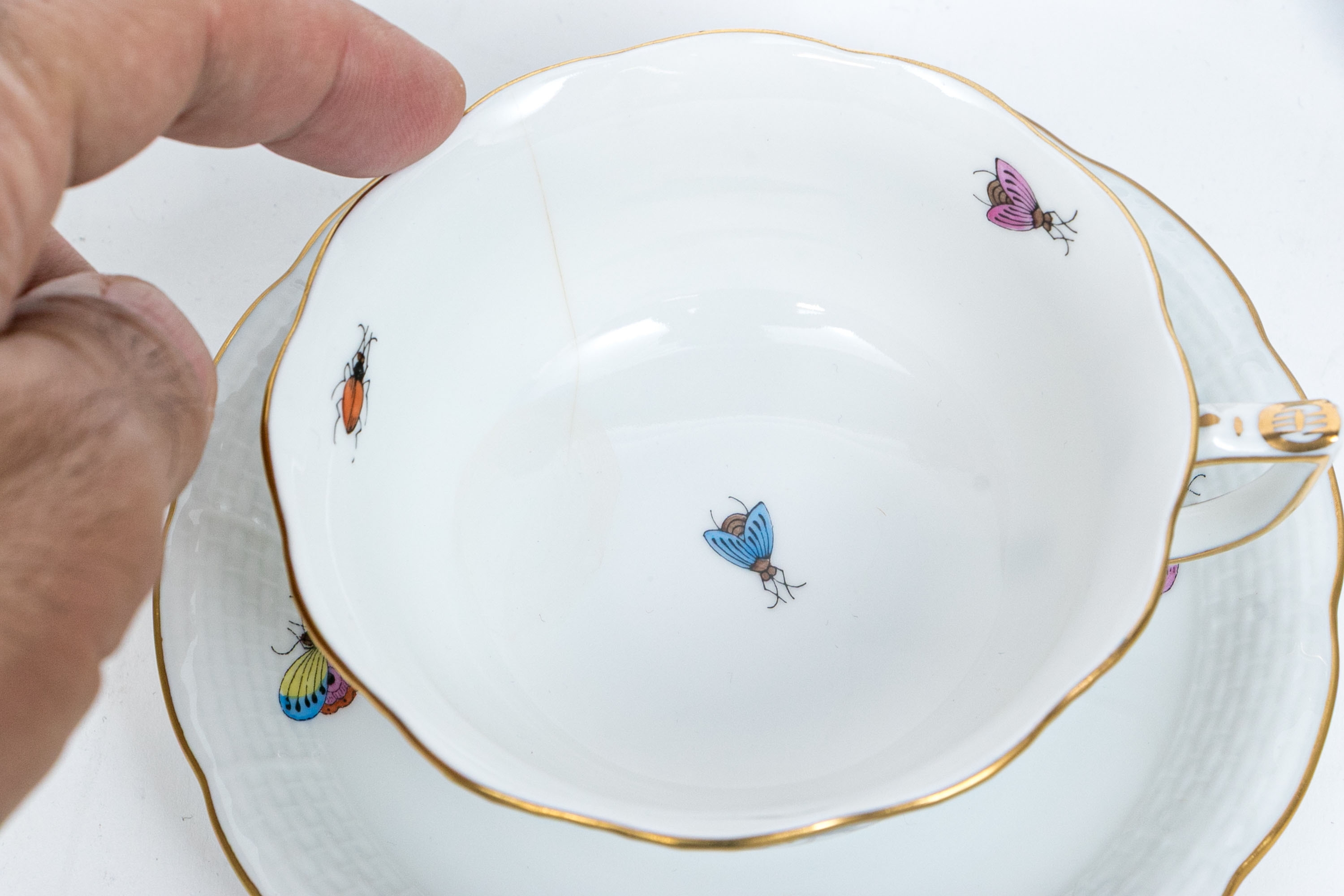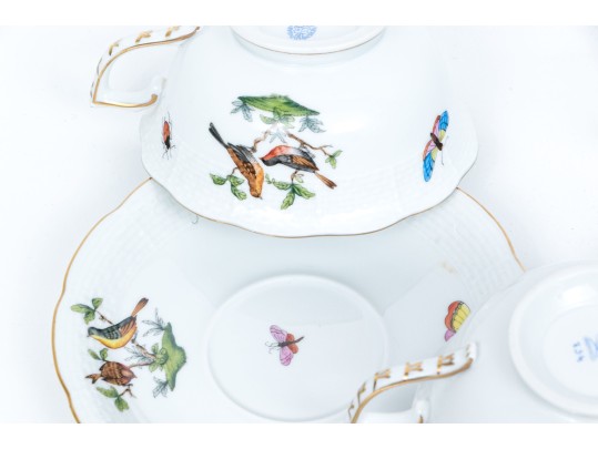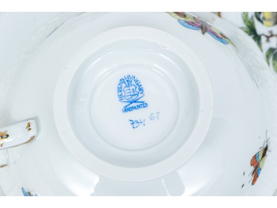 The interiors of the cups also feature scattered butterflies and insects, while the rims, handles, and footrings are elegantly edged in hand-applied gilding. All pieces bear the Herend Hungary blue shield hallmark, HANDPAINTED, and pattern numbers 734/RO (saucers) and 734-67/RO (cups)