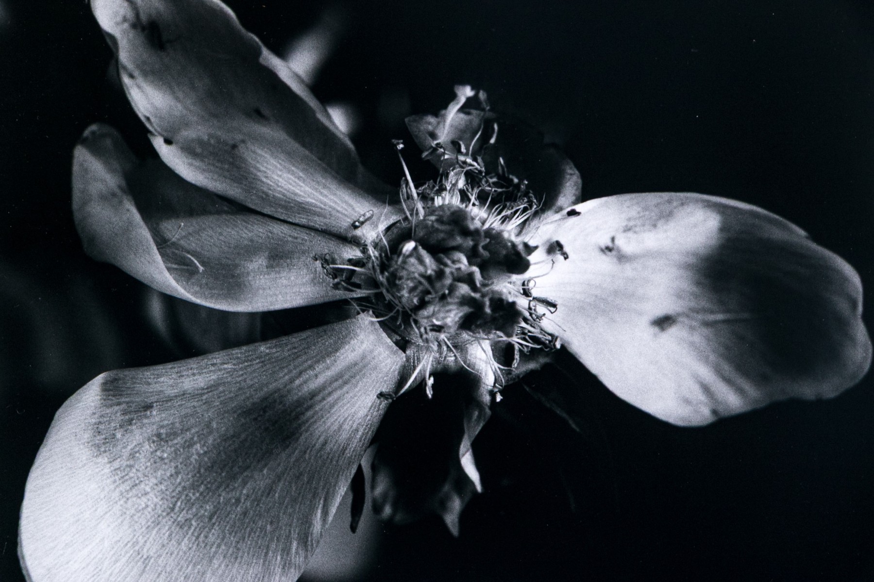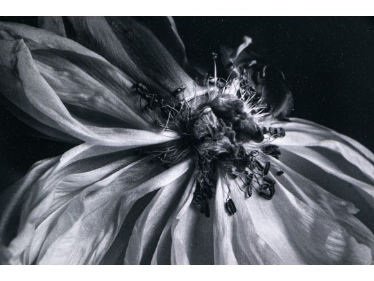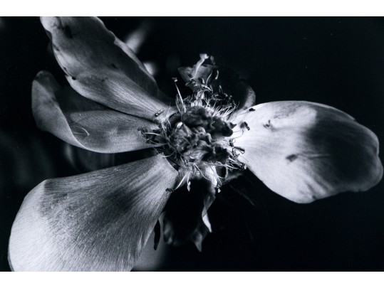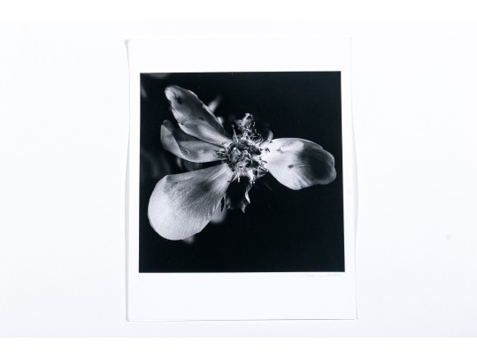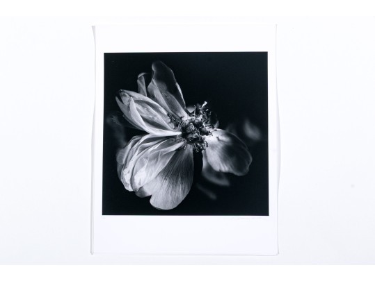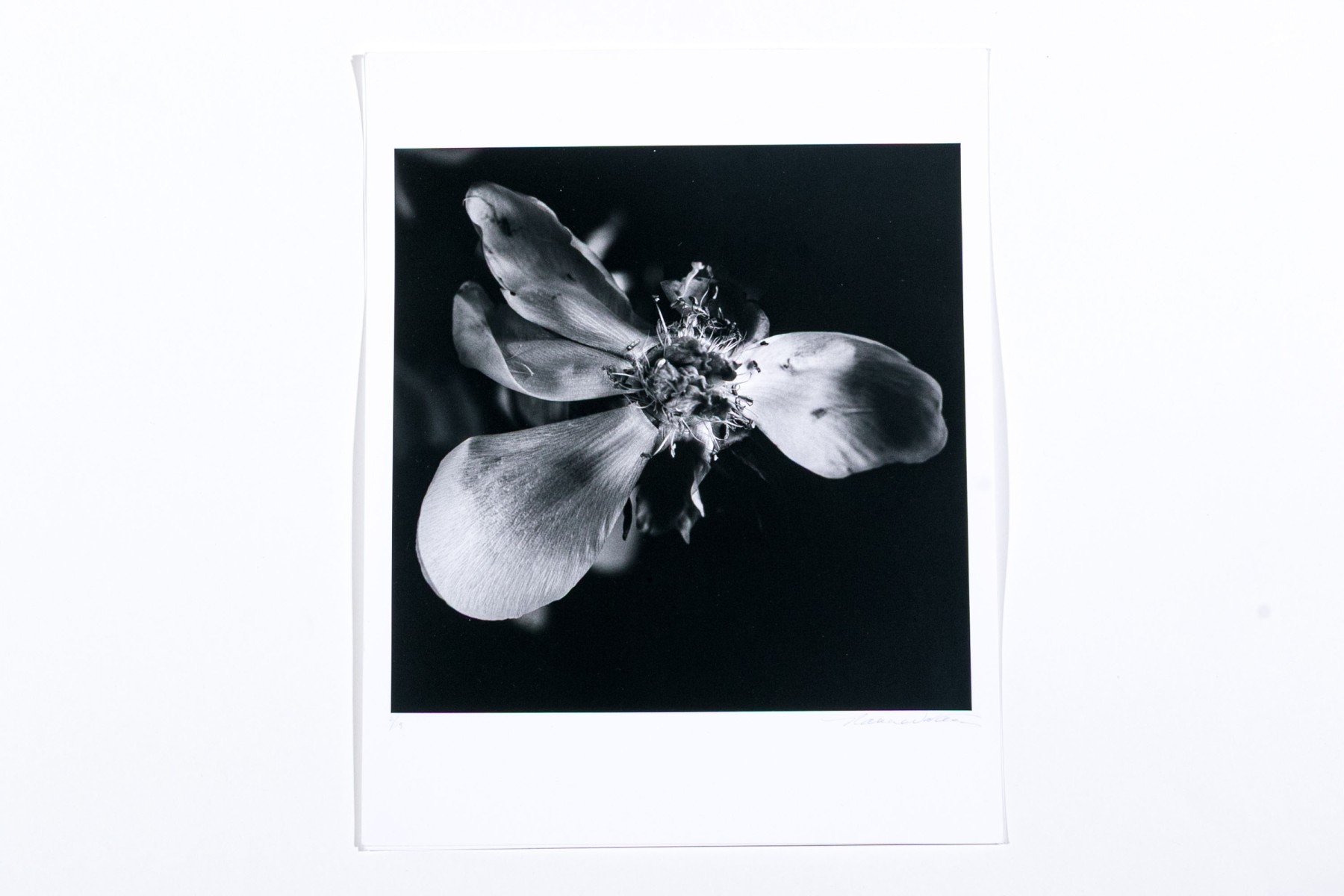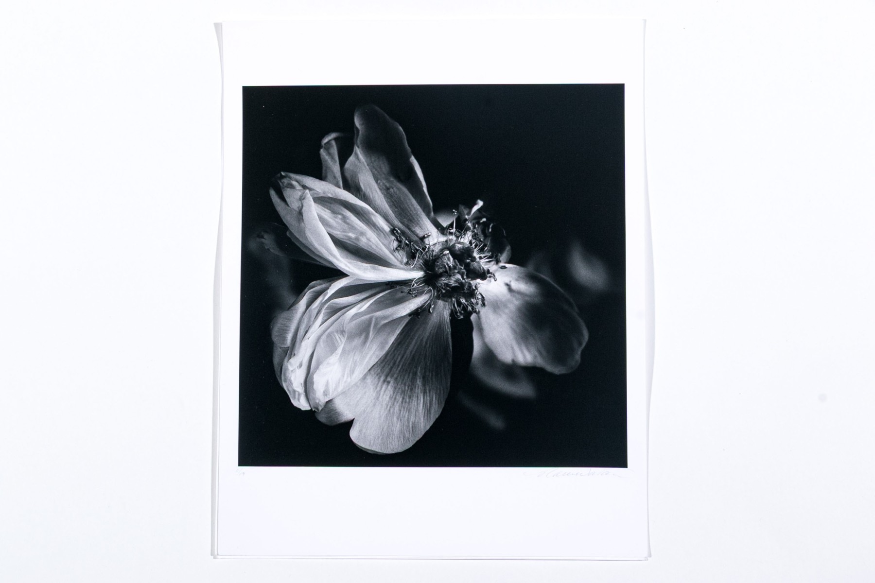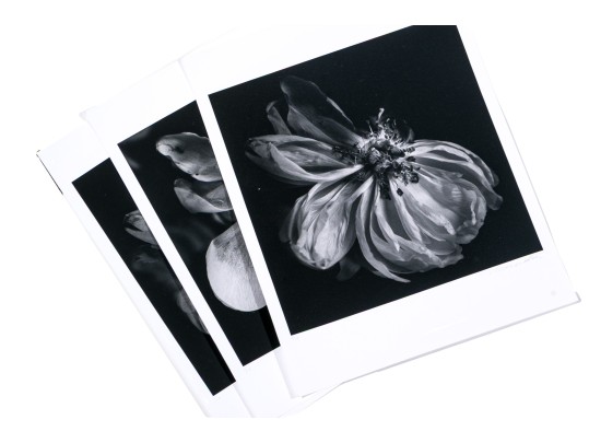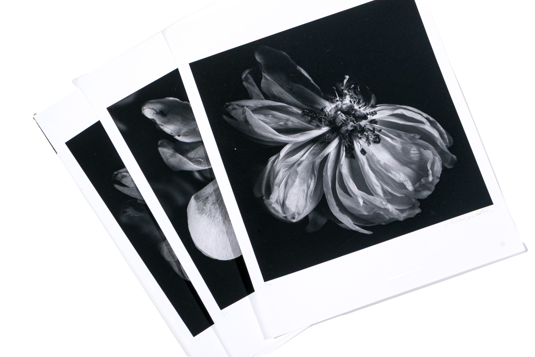 A set of three photographic prints depicting fading flower losing petals shown in dramatic light and shadows. Pencil signed indistinctly and numbered 2/19 each. Unframed.