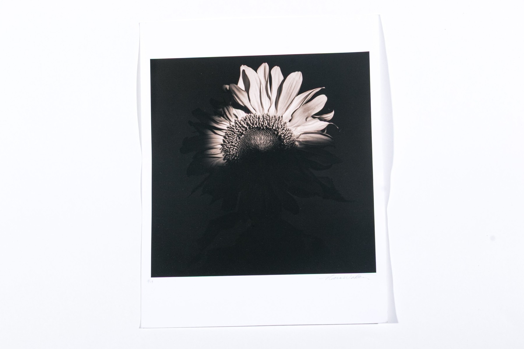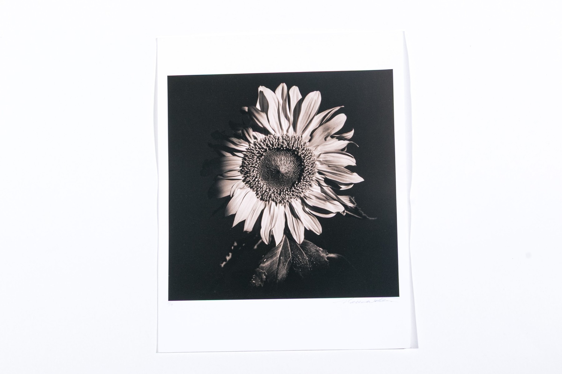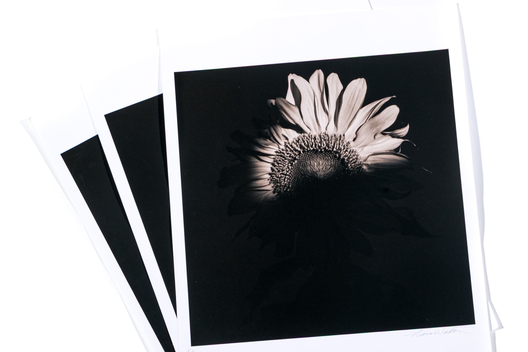 A lovely set of three photographic print depicting sunflowers shown in different lights and shadows. Pencil signed indistinctly and numbered 3/19 each. Unframed.