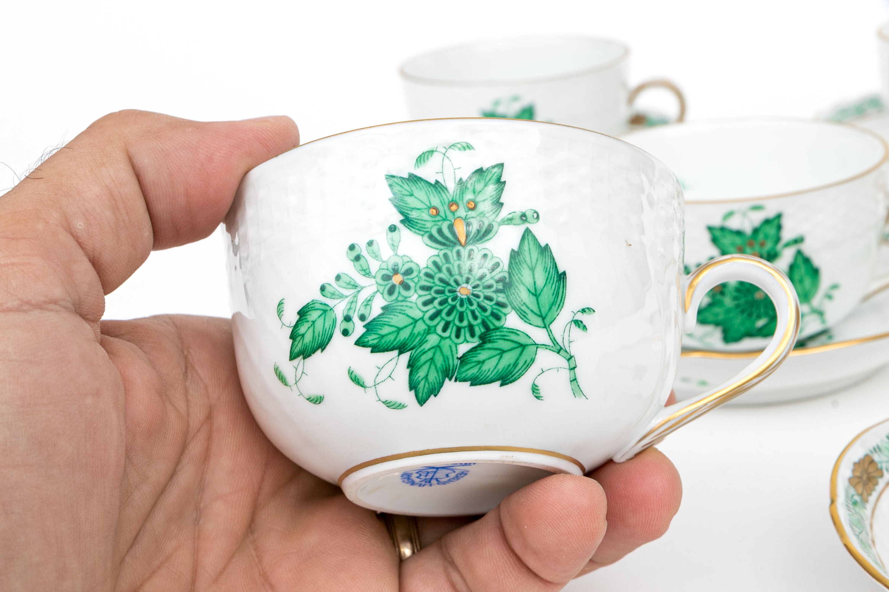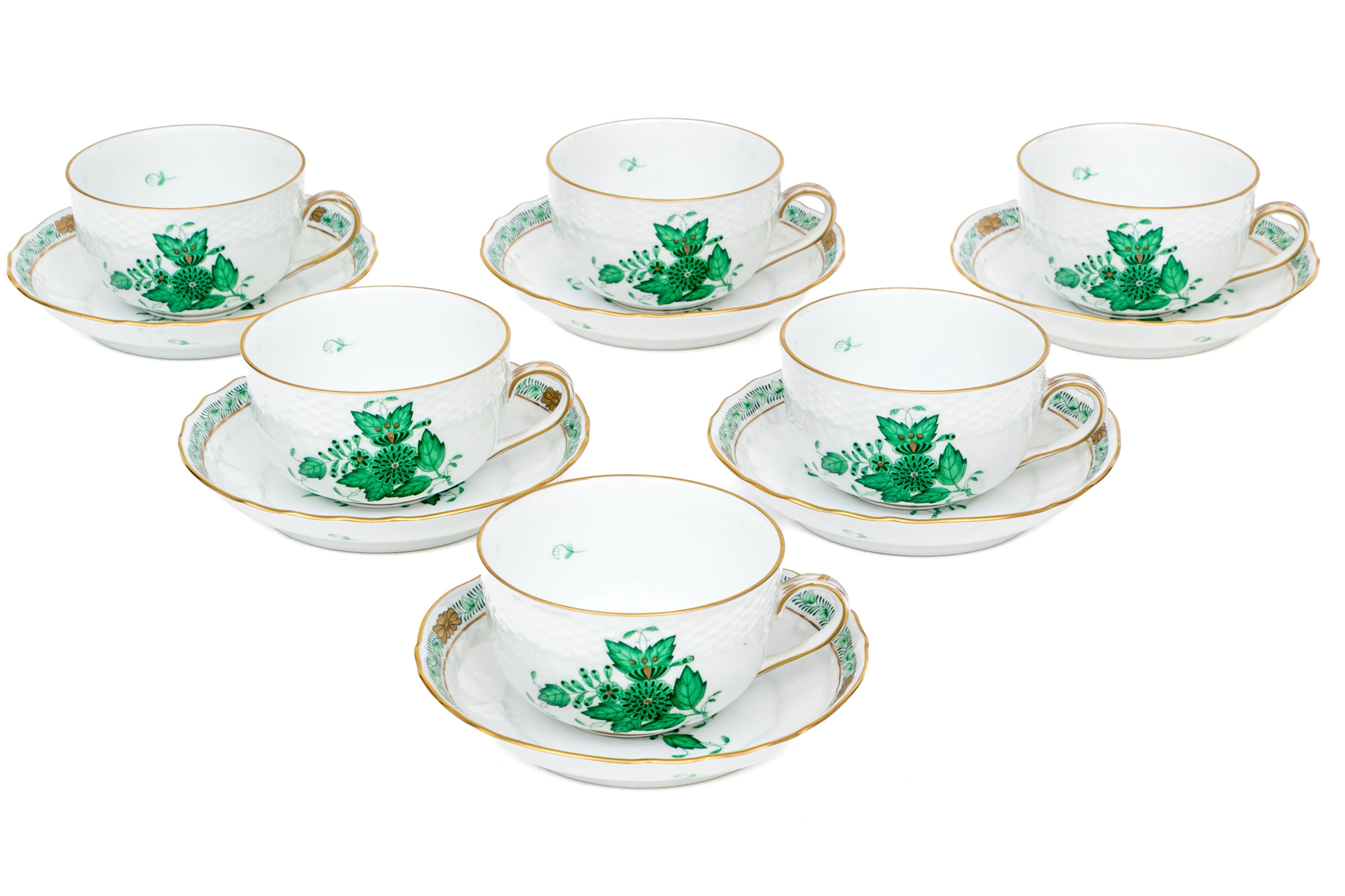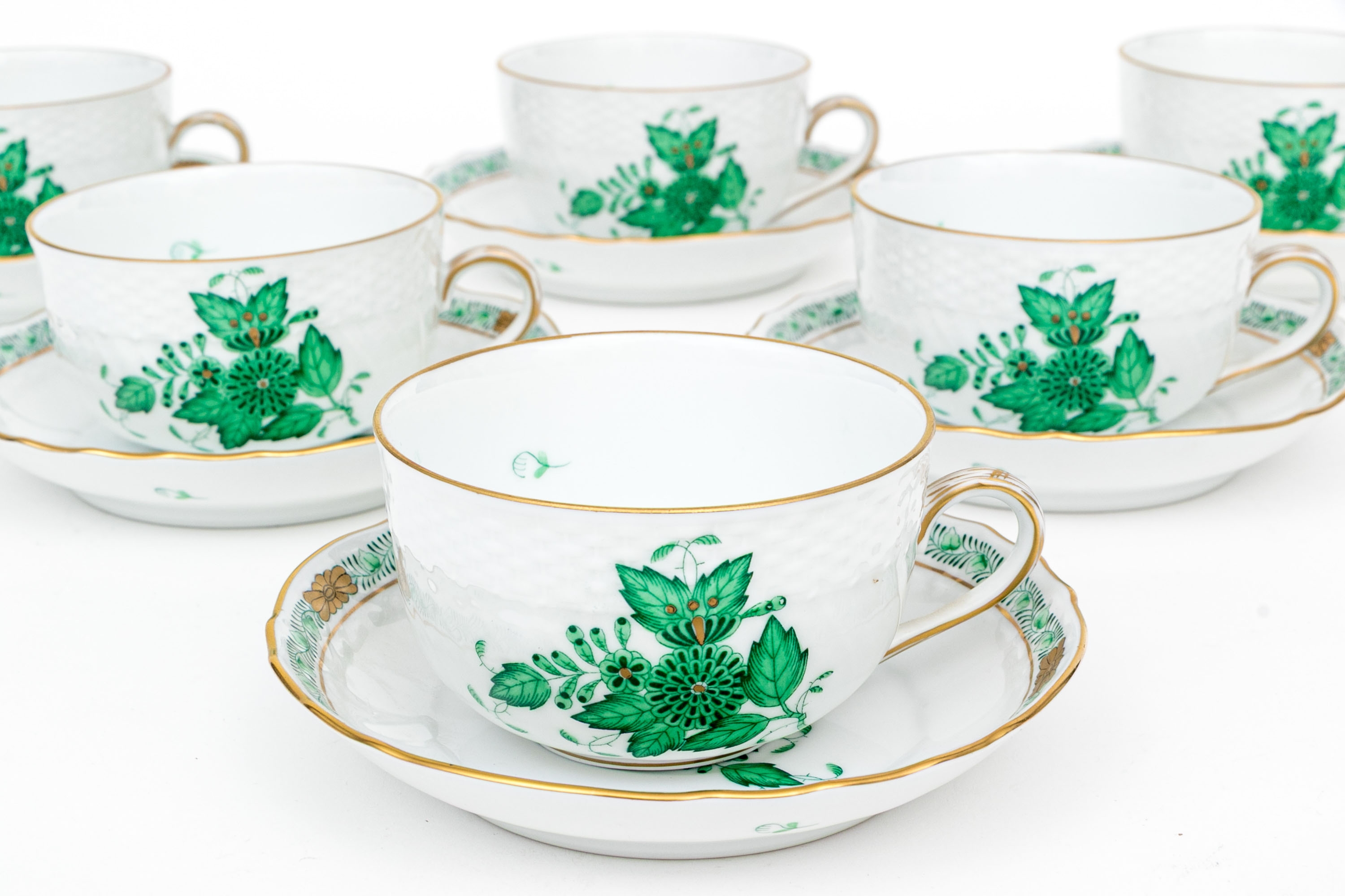 Set of six Herend Hungary porcelain cups and saucers, each hand-painted in the timeless Green Chinese Bouquet (AV) pattern with 24K gold trim. Each cup and saucer displays the floral motif in green hues, centered around a stylized peony blossom with scrolling foliage and fine botanical detailing. The rims, handles, and bases are accented in burnished gold, adding an elegant shimmer against the bright white porcelain. The edges feature Herend’s classic scalloped rims with the subtle basketweave (osier) texture that defines the brand’s signature form. The undersides are marked with the Herend Hungary blue shield hallmark and crossed paintbrushes, inscribed HANDPAINTED with the form numbers 1726 (cup) and 1726/AV (saucer).