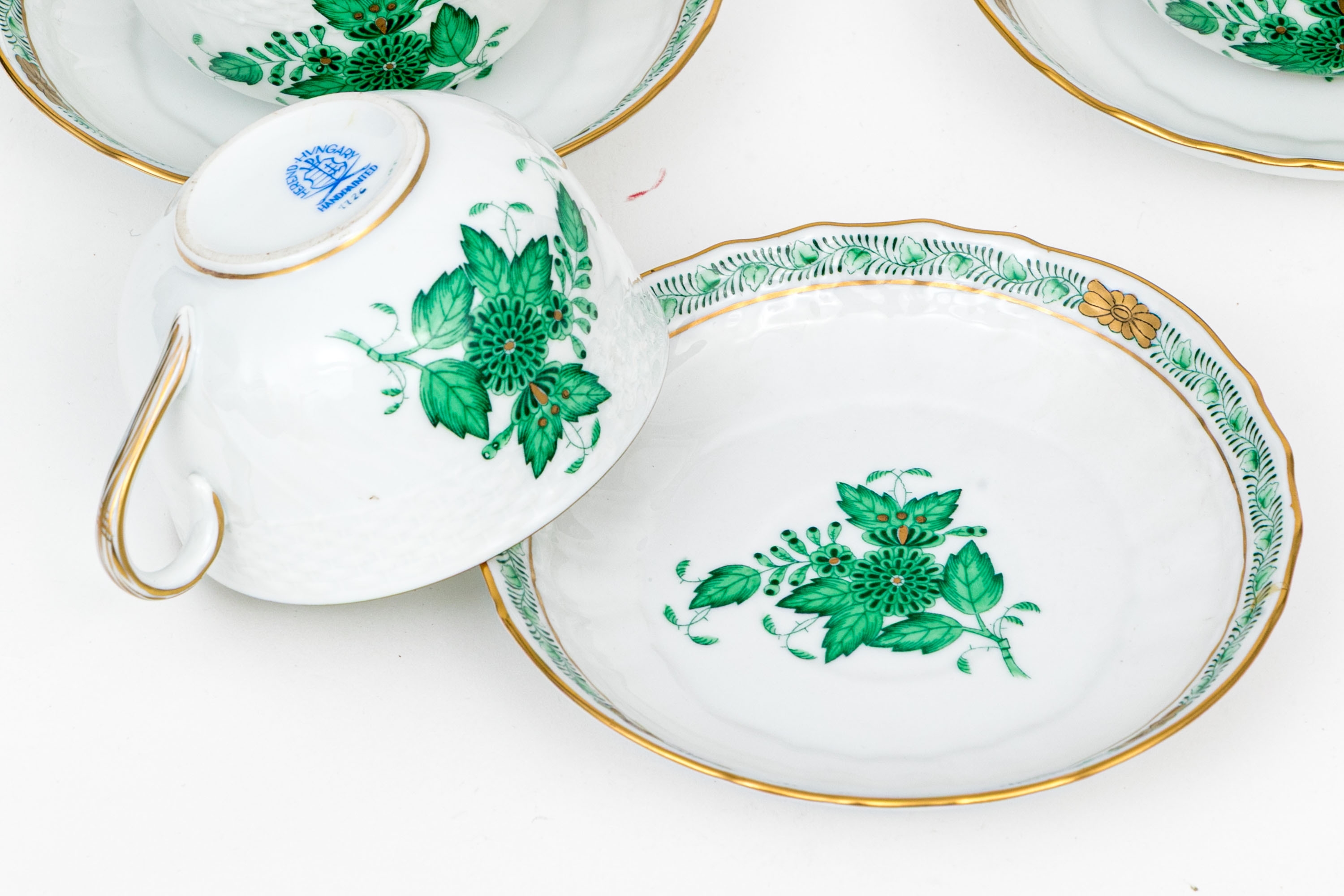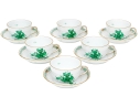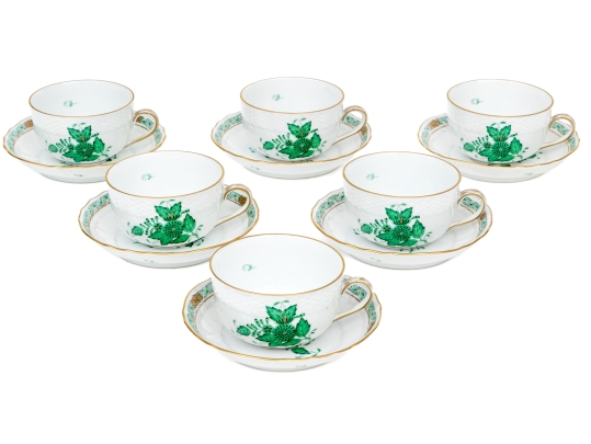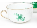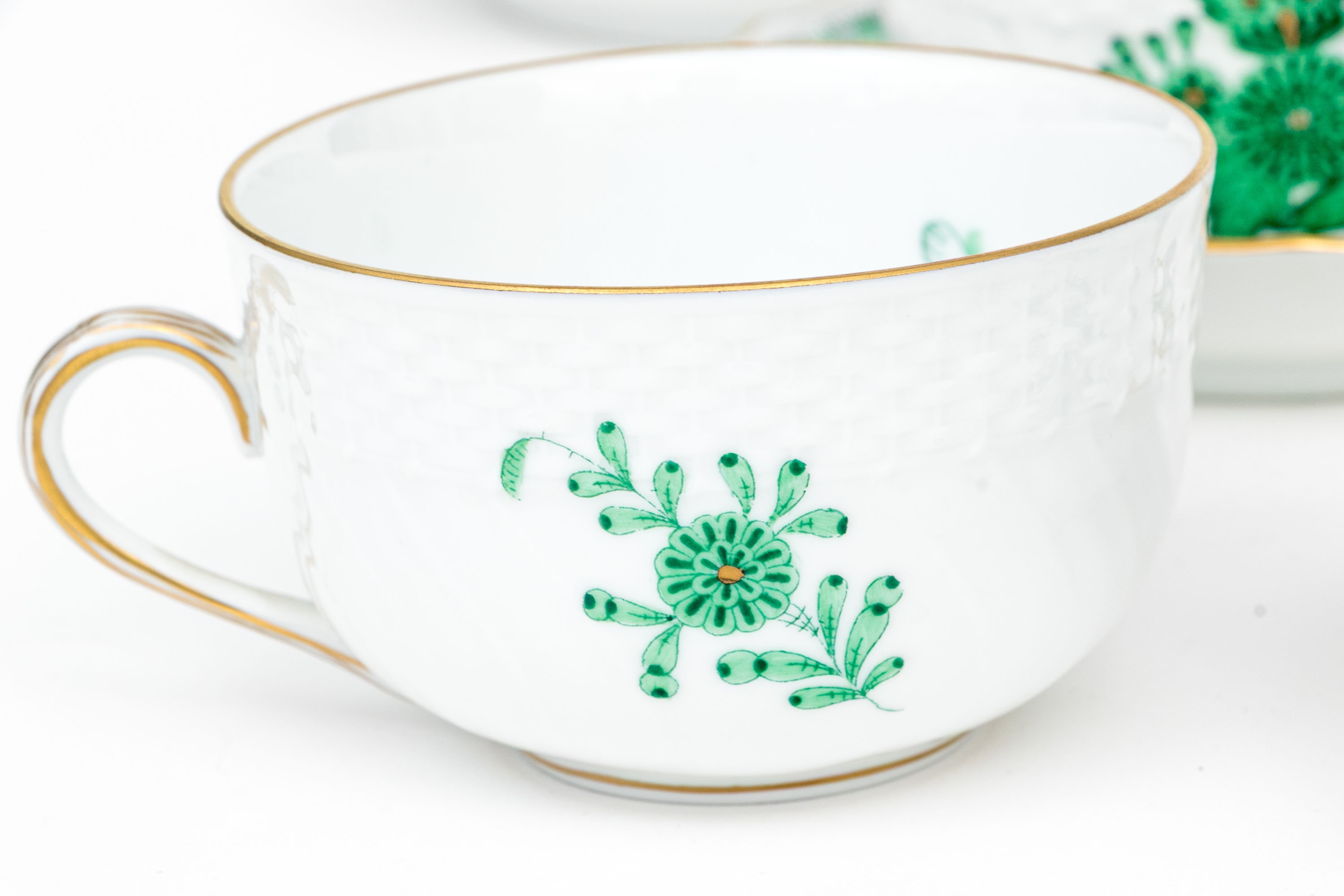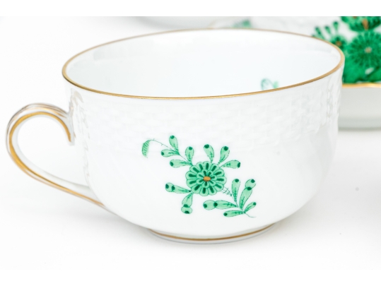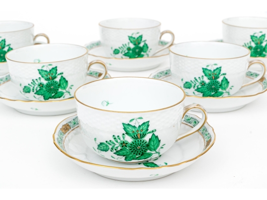Set of six Herend Hungary porcelain cups and saucers, each hand-painted in the timeless Green Chinese Bouquet (AV) pattern with 24K gold trim. Each cup and saucer displays the floral motif in green hues, centered around a stylized peony blossom with scrolling foliage and fine botanical detailing. The rims, handles, and bases are accented in burnished gold, adding an elegant shimmer against the bright white porcelain. The edges feature Herend’s classic scalloped rims with the subtle basketweave (osier) texture that defines the brand’s signature form. The undersides are marked with the Herend Hungary blue shield hallmark and crossed paintbrushes, inscribed HANDPAINTED with the form numbers 1726 (cup) and 1726/AV (saucer).
