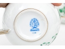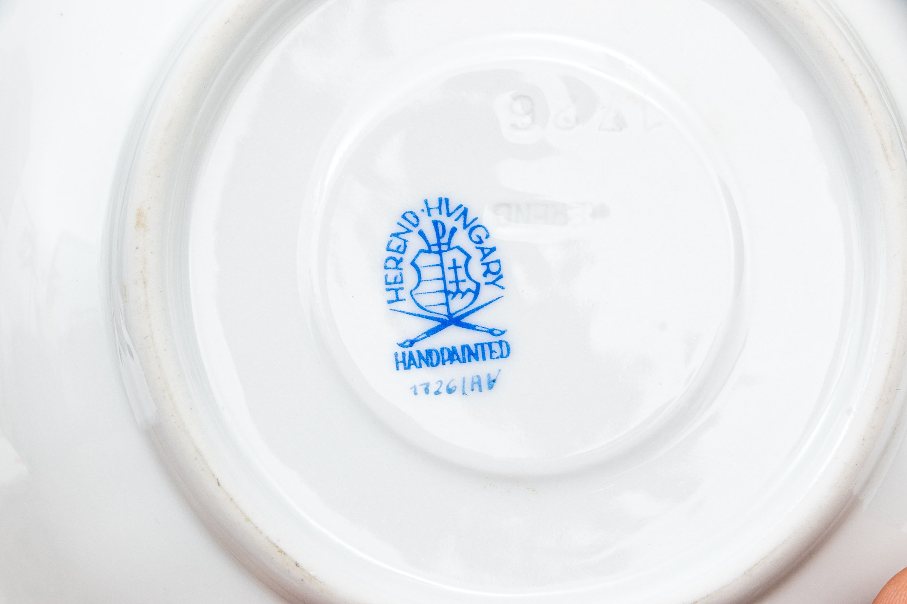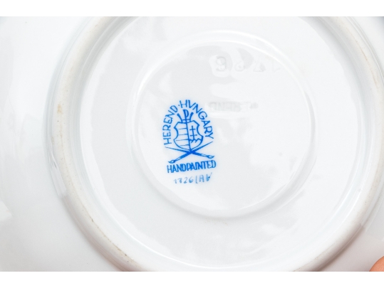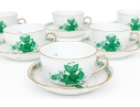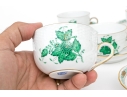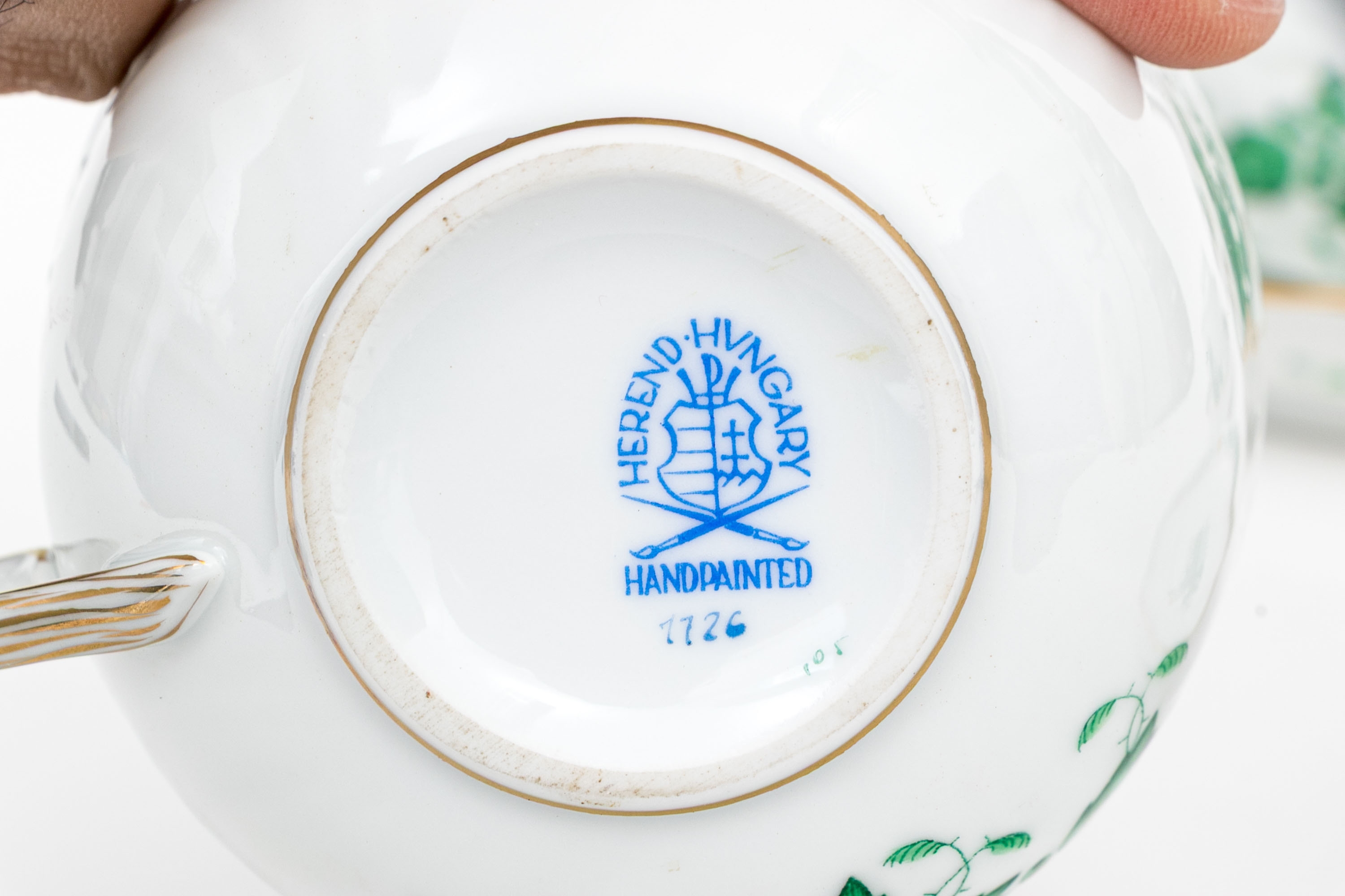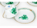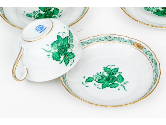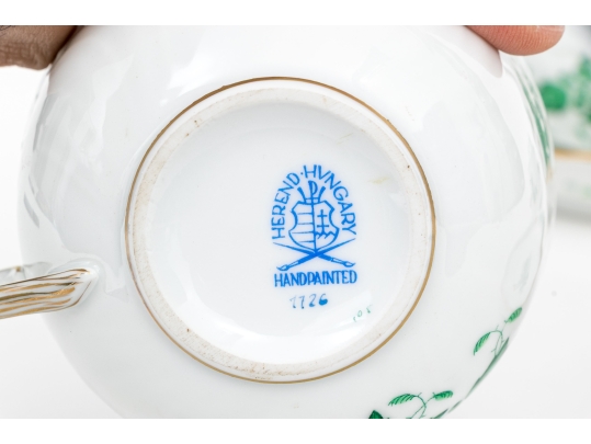 Condition: Excellent overall. All pieces are free from chips, cracks, or repairs. The hand-painted green floral designs remain vivid and crisp, and the gilding retains its bright luster with minimal wear. Surfaces are glossy and clean throughout, showing only faint, expected base wear from cabinet display. Undersides are clean and clearly marked, with fully legible Herend factory stamps and model references. No discoloration, crazing, or glaze imperfections noted.