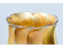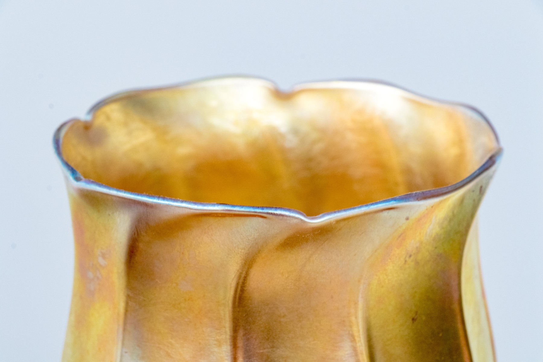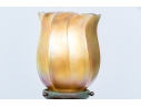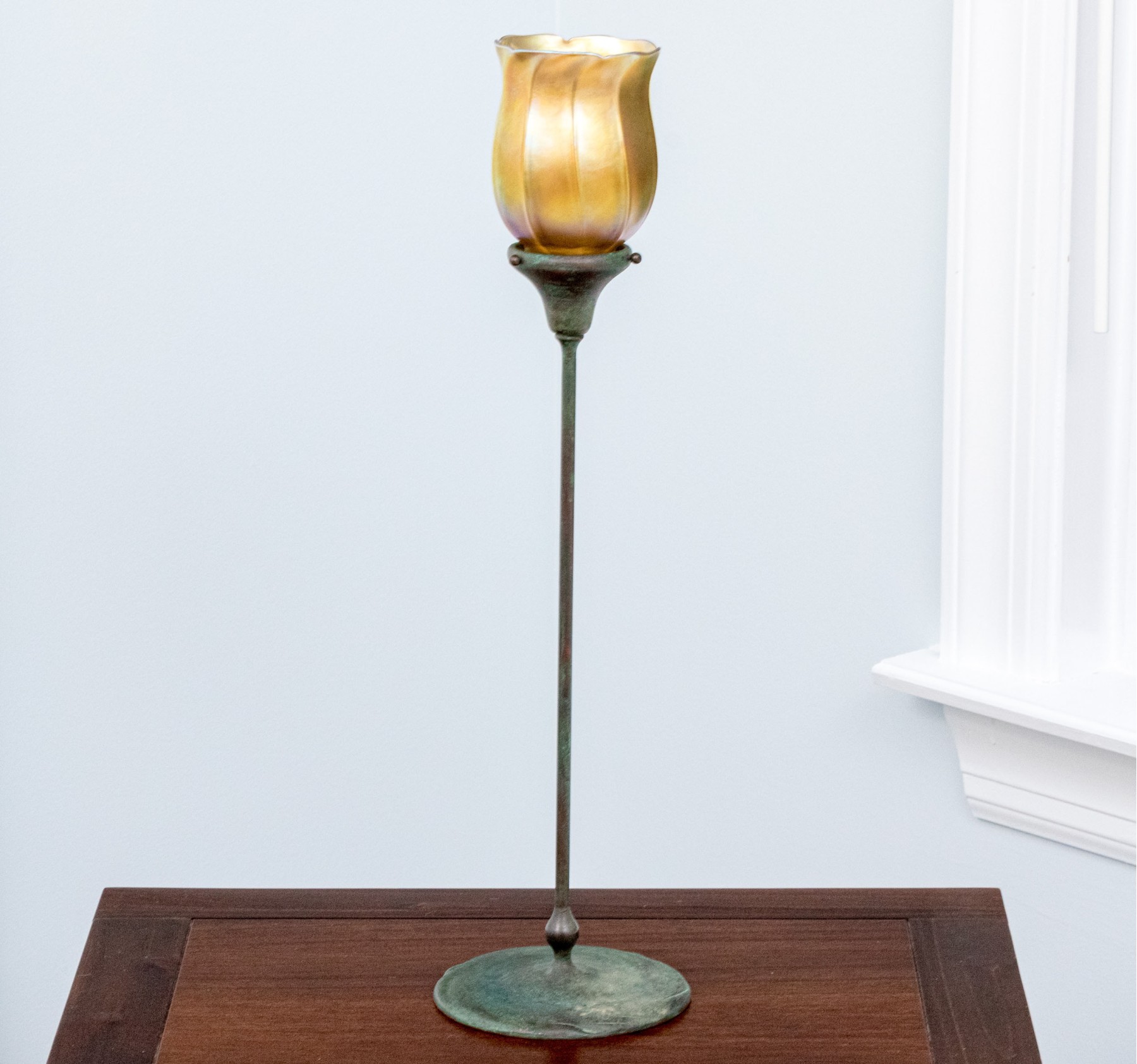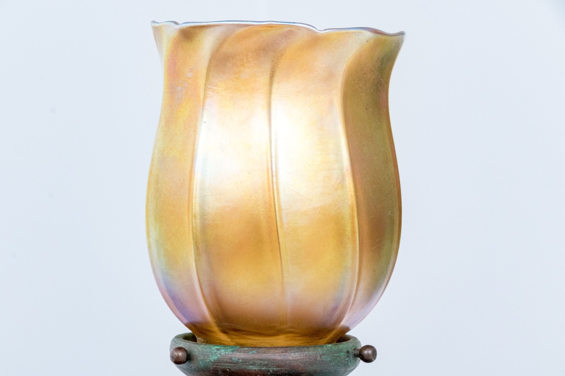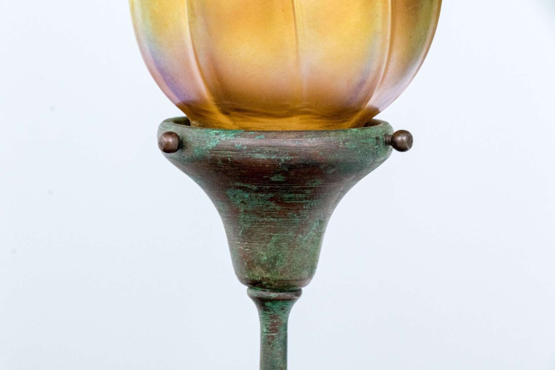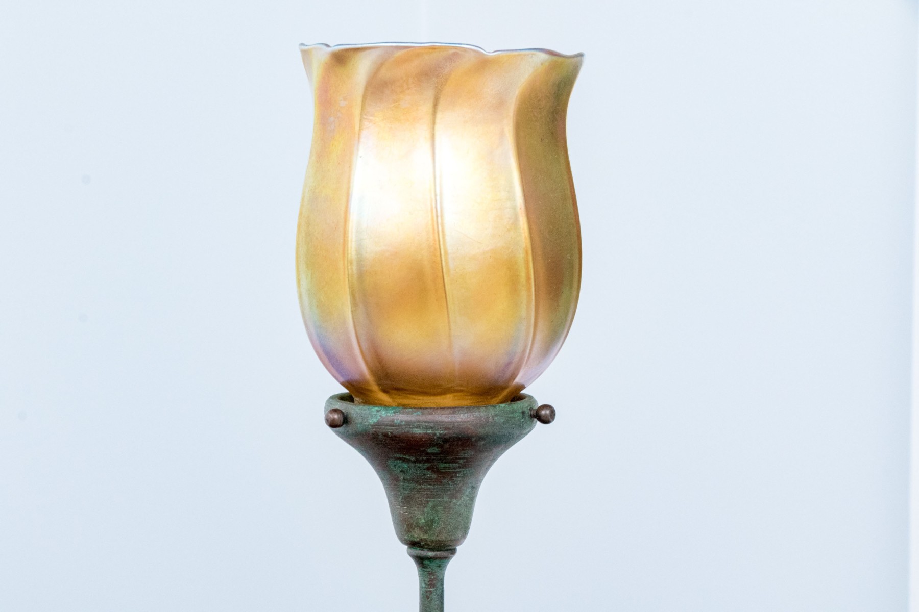 An excellent Tiffany Studios style candle lamp with excellent Art Deco flare, sporting a yellow opalescent favrile glass shade with a floral petal design, lending a tulip-like appearance with its tall slender bronze neck terminating on the circular base. Marked underfoot.