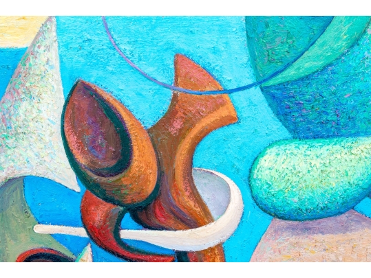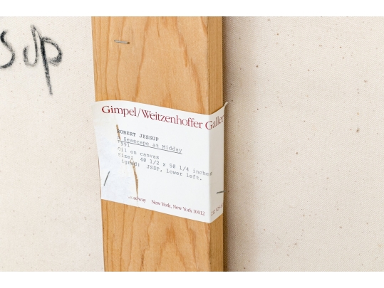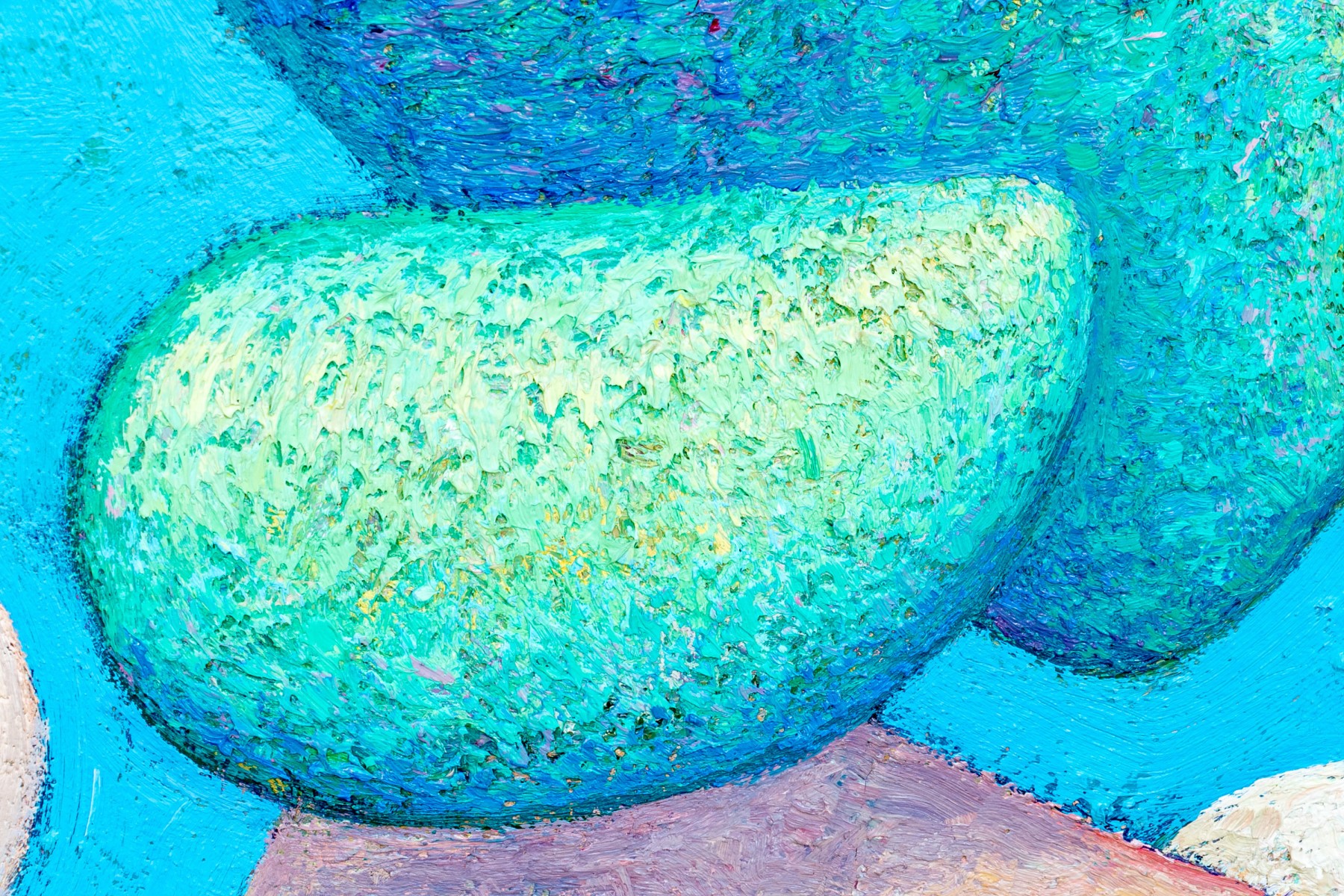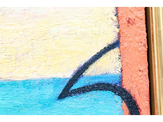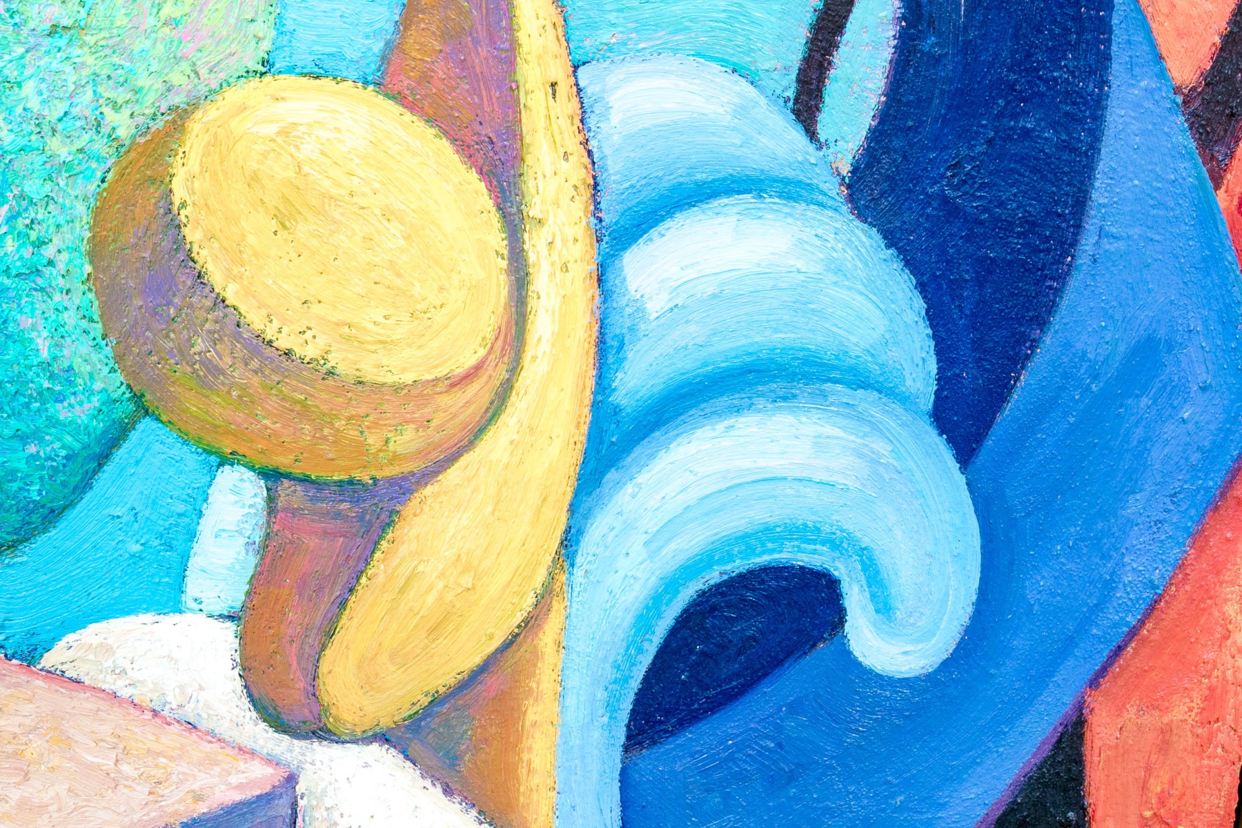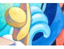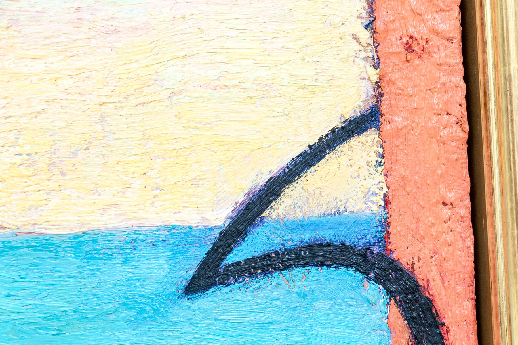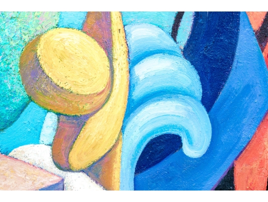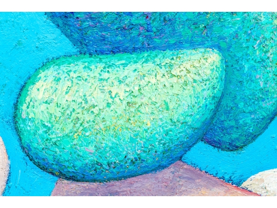 Robert Jessup (American, b. 1952) "A Seascape at Midday", oil on canvas painting depicting a textural impasto composition of organic forms in teal, yellow, blue, orange, and red against an ocean background. Signed lower right and on the verso with title.