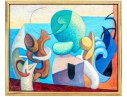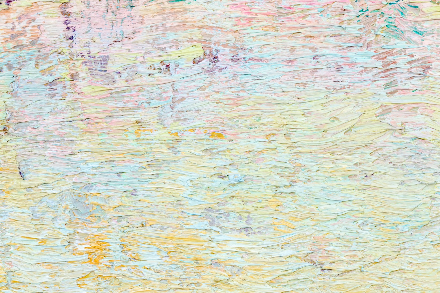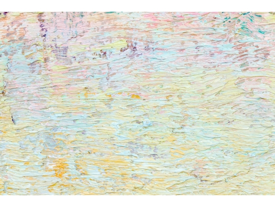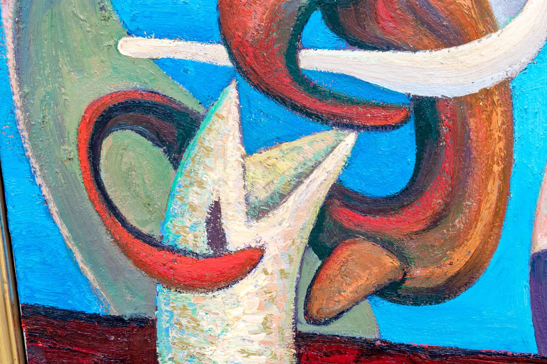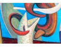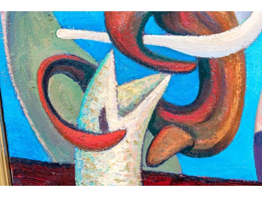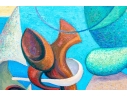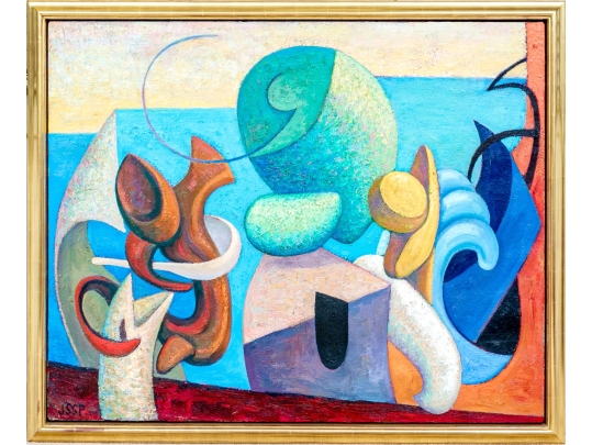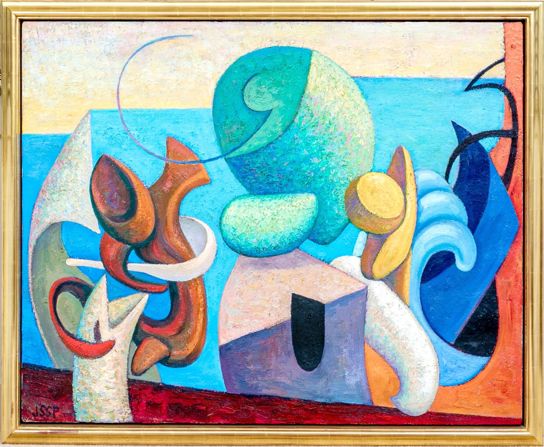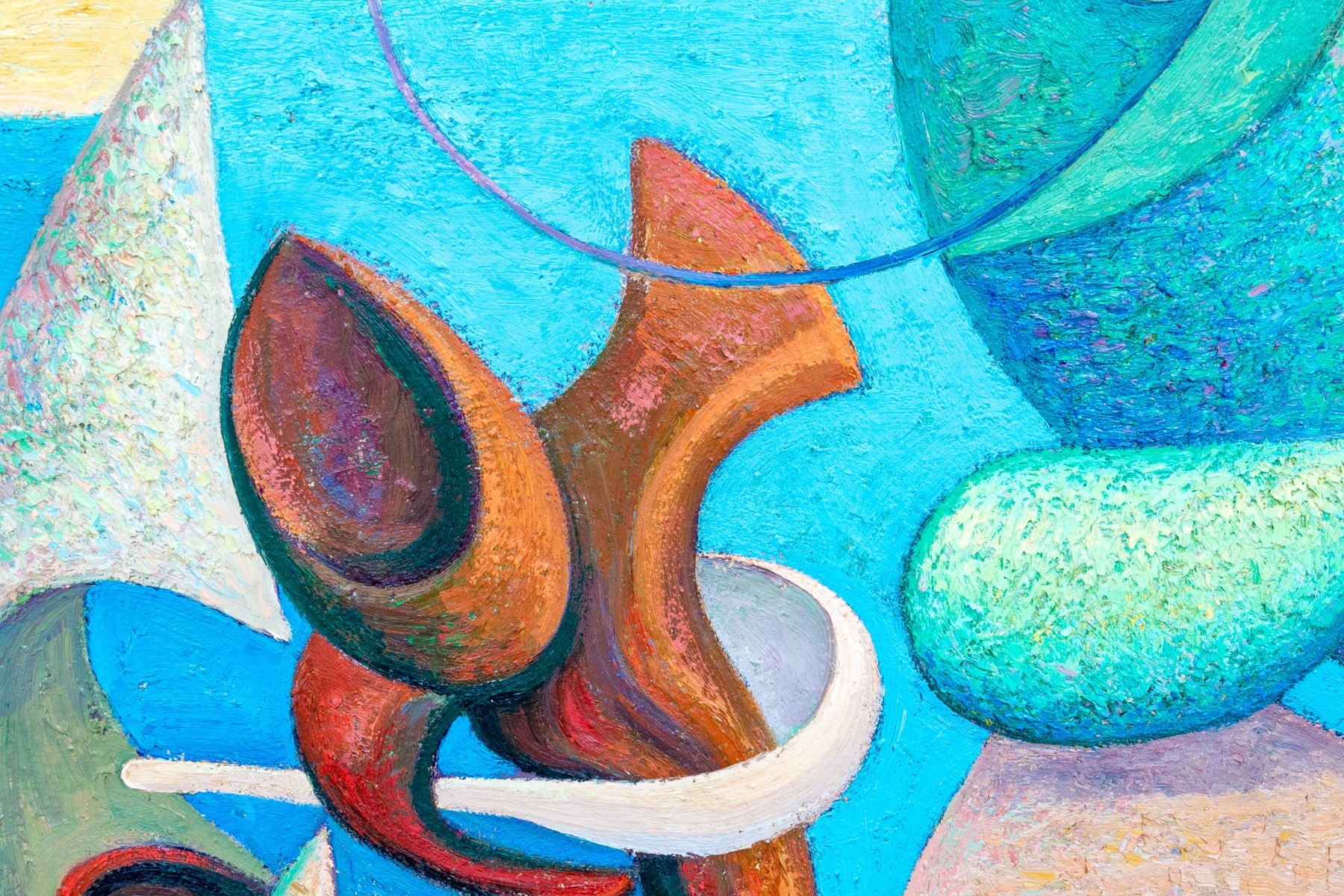 Robert Jessup (American, b. 1952) "A Seascape at Midday", oil on canvas painting depicting a textural impasto composition of organic forms in teal, yellow, blue, orange, and red against an ocean background. Signed lower right and on the verso with title.