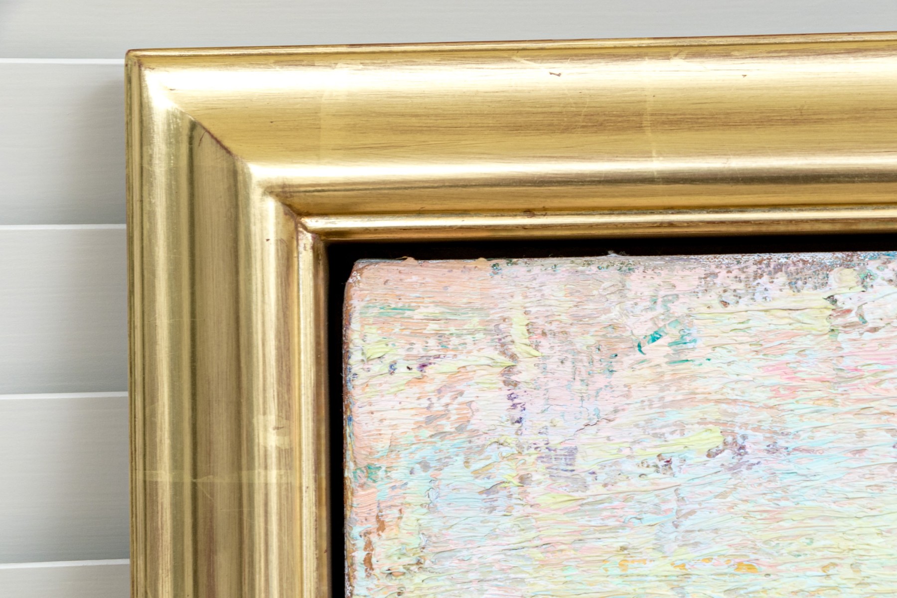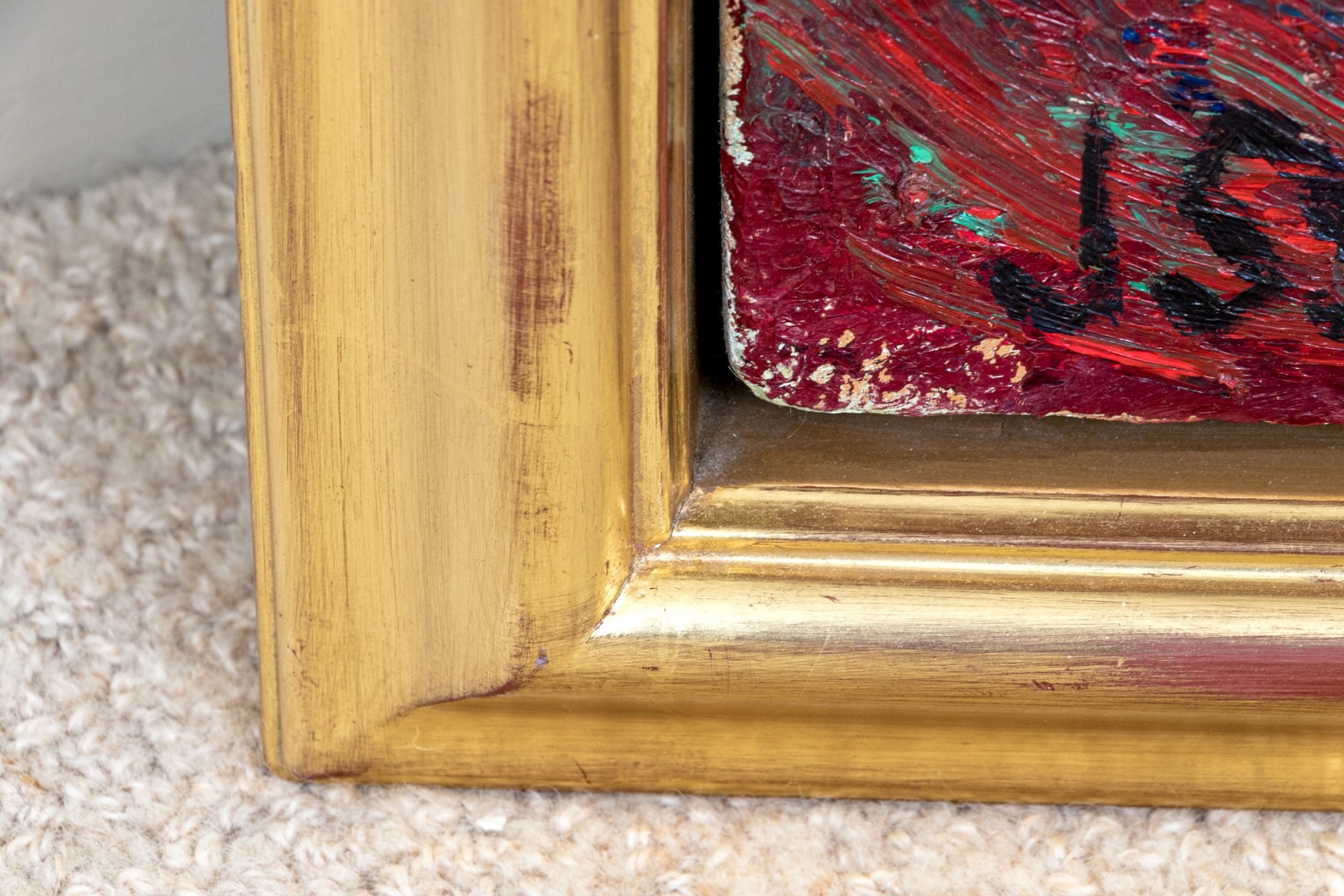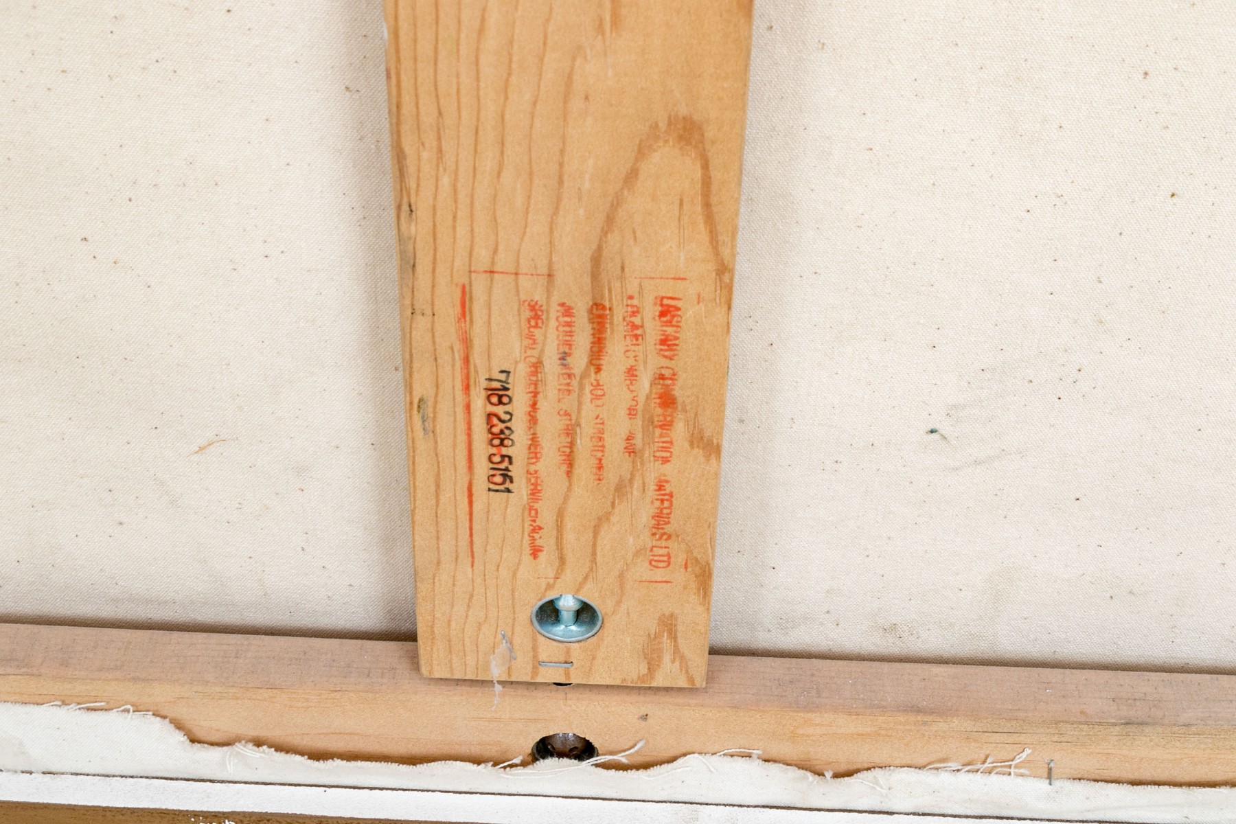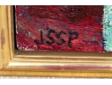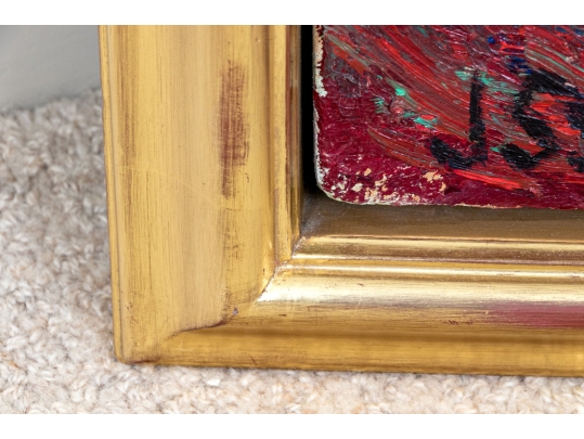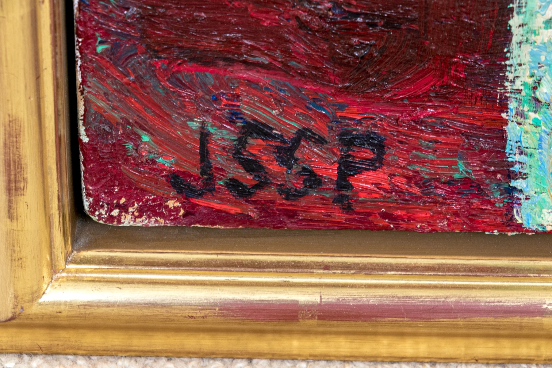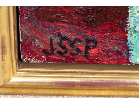 Robert Jessup (American, b. 1952) "A Seascape at Midday", oil on canvas painting depicting a textural impasto composition of organic forms in teal, yellow, blue, orange, and red against an ocean background. Signed lower right and on the verso with title.