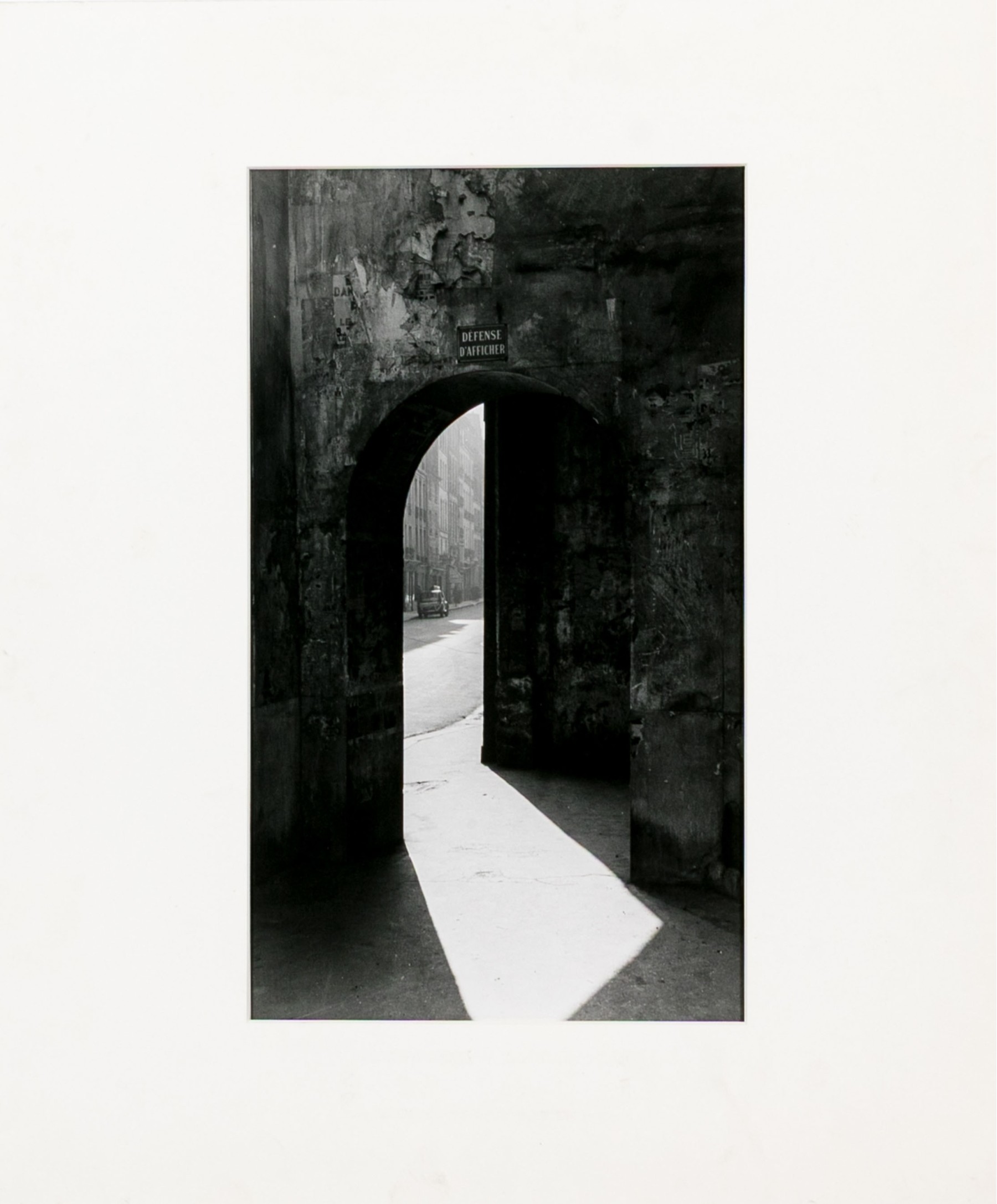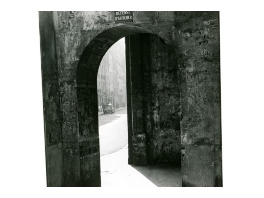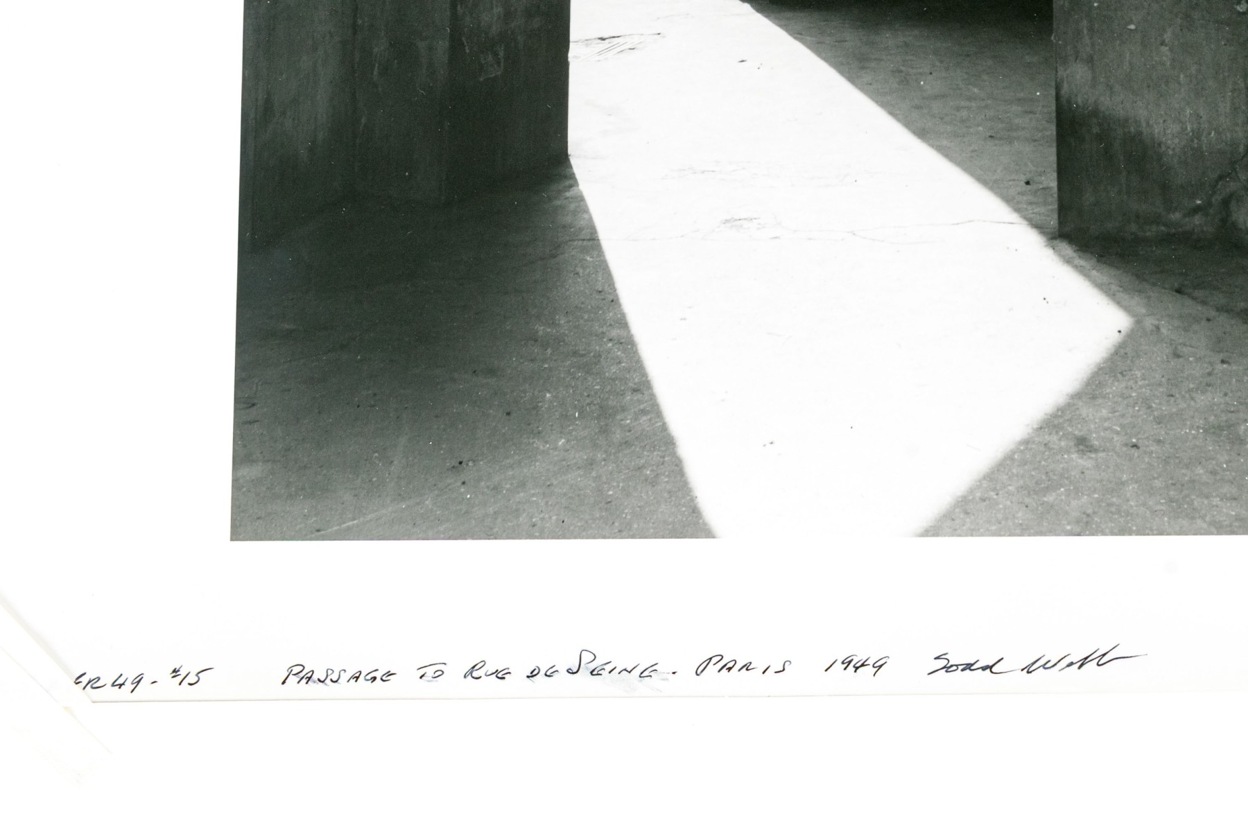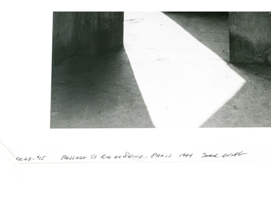 Todd Webb (American, 1905-2000) "Passage To Rue De Seine" photographic print depicting a view of light streaming in through an archway around a building corner leading to a view of an urban street in the background. Signed, titled, and numbered #15 lower left. Unframed.