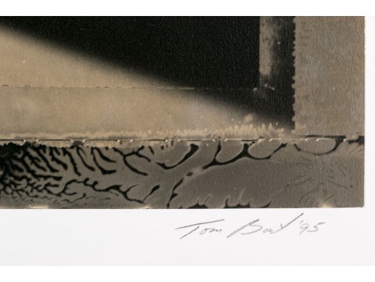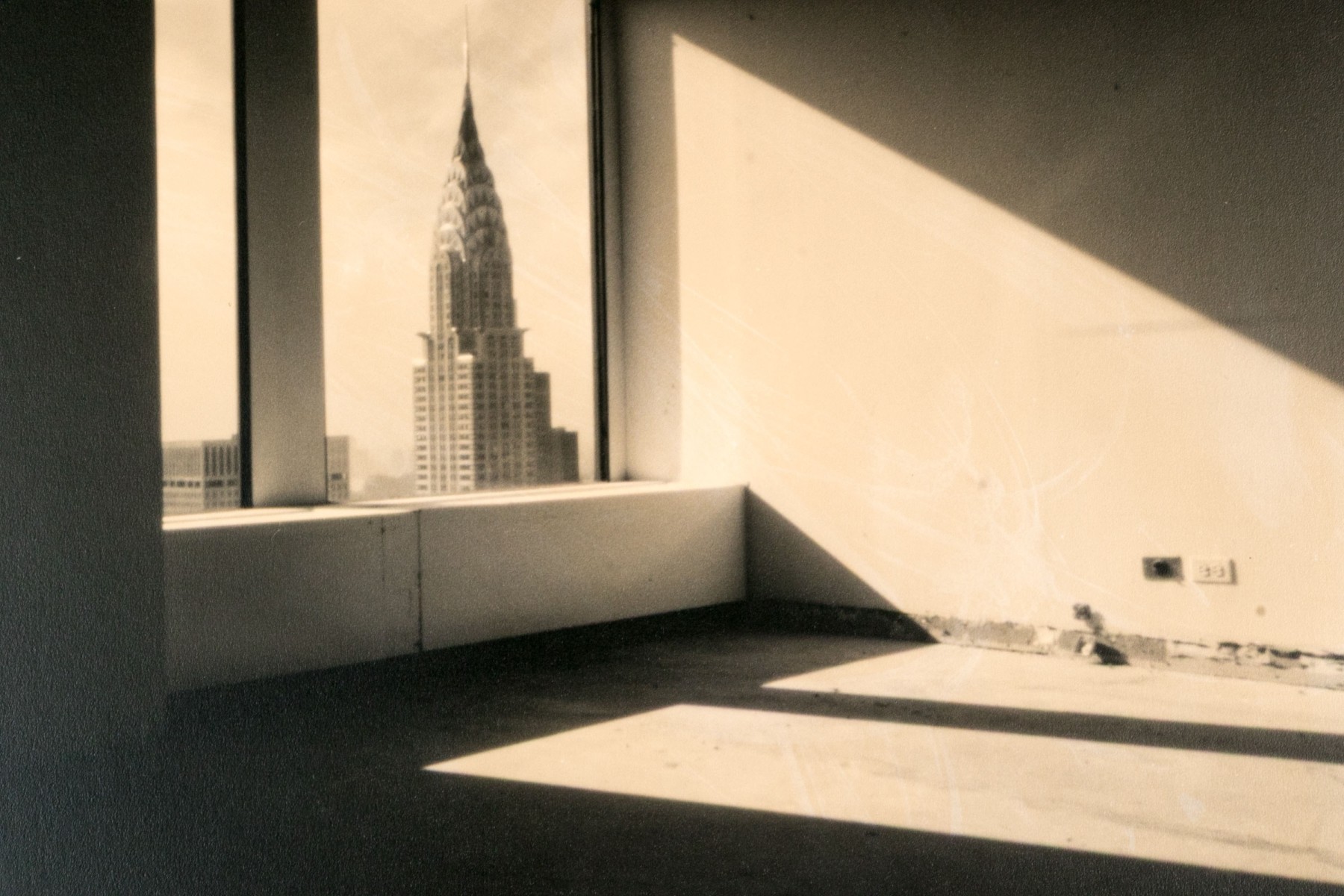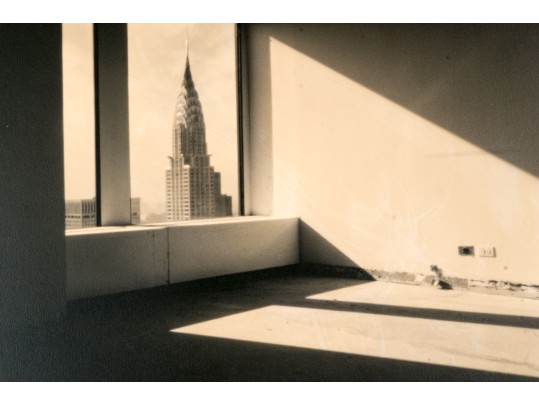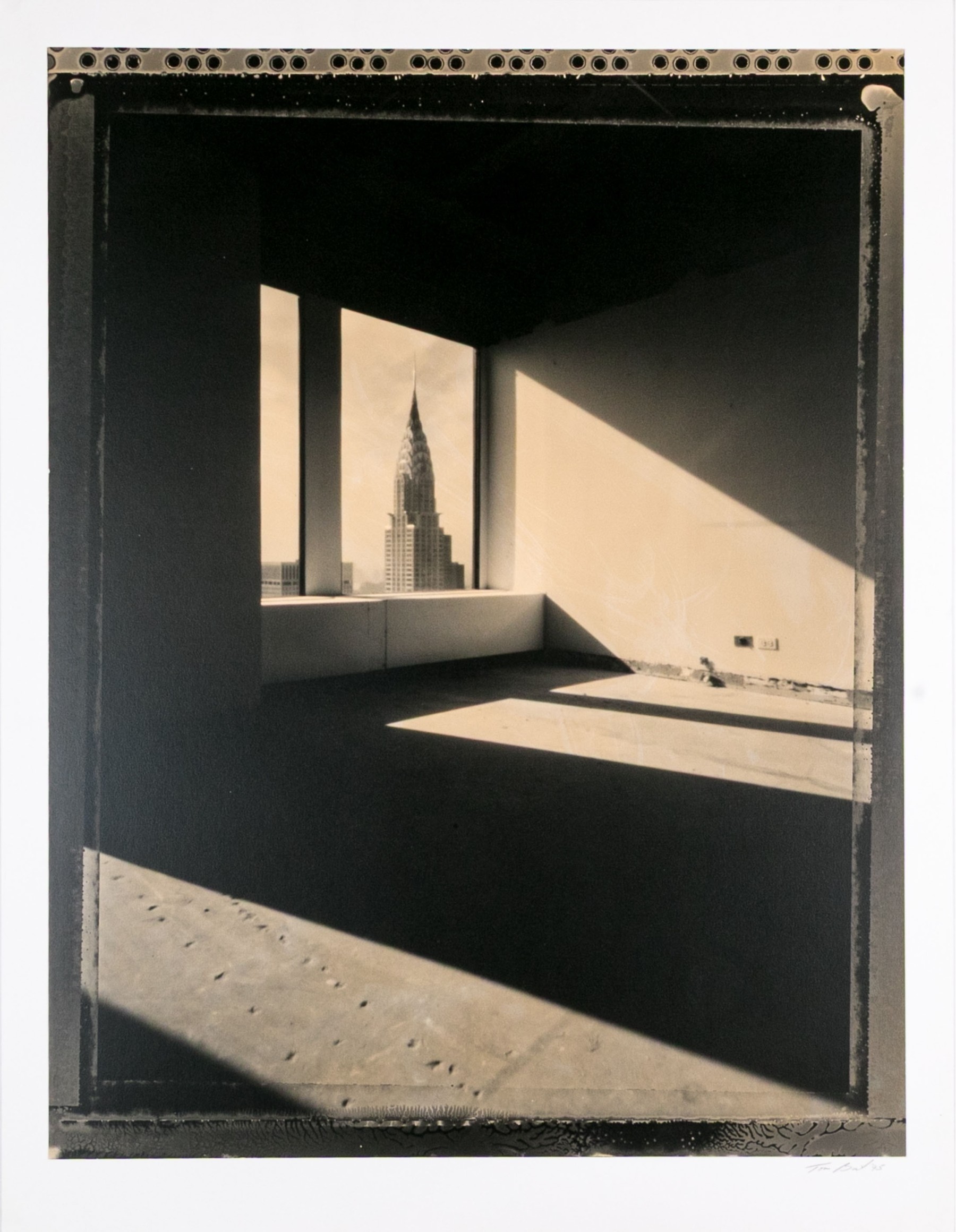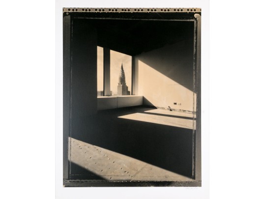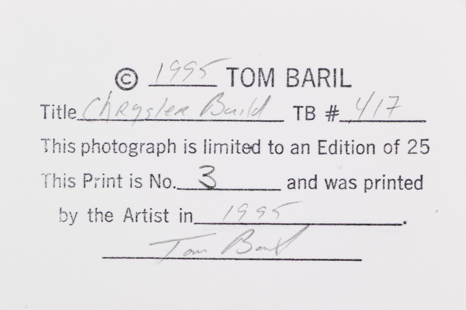 Tom Baril (American, B. 1952) "Chrysler Build" Gelatin silver print depicting a view of the Empire State Building from a brutalist interior with high contrast from the light and shadows created by the windows. Signed and dated '95 lower right and stamped denoting the edition 3/25. Unframed.