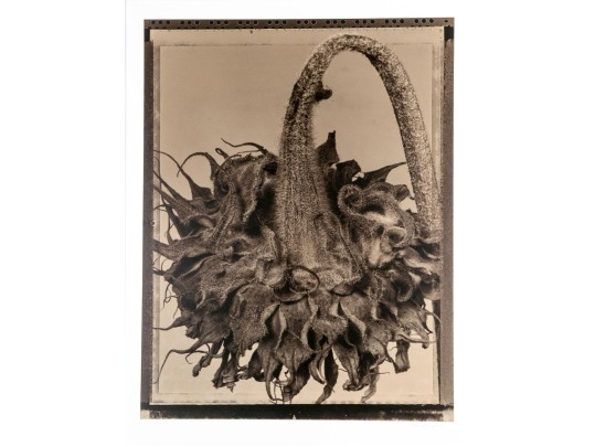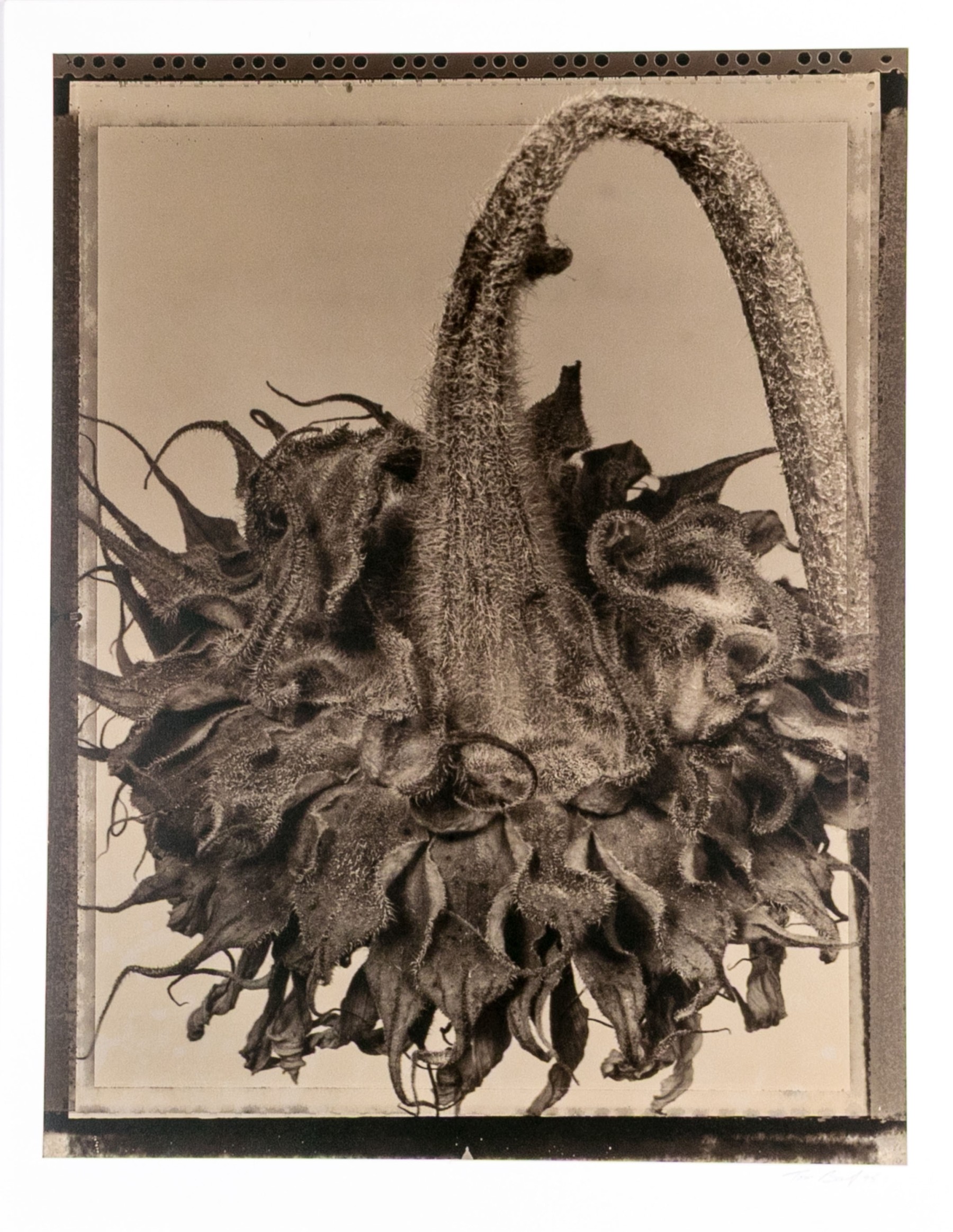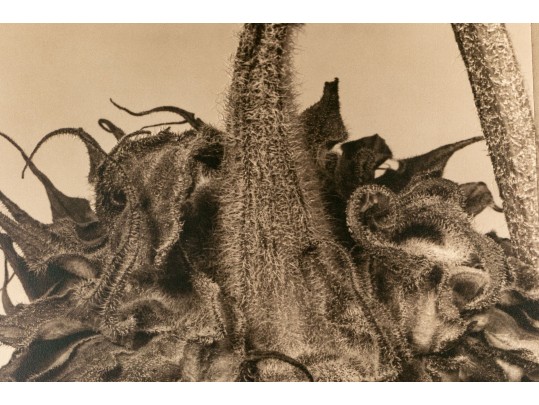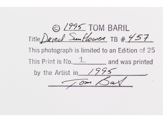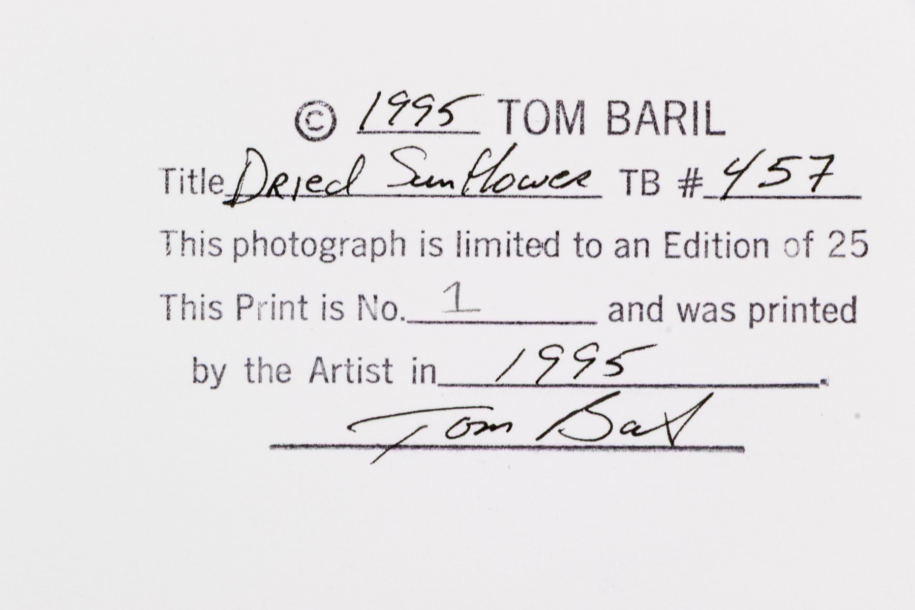 Tom Baril (American, B. 1952) "Dried Sunflower" Gelatin silver print depicting a dried sunflower head dramatically arched downwards. Signed and dated '95 lower right and stamped with the edition 1/25. Unframed.