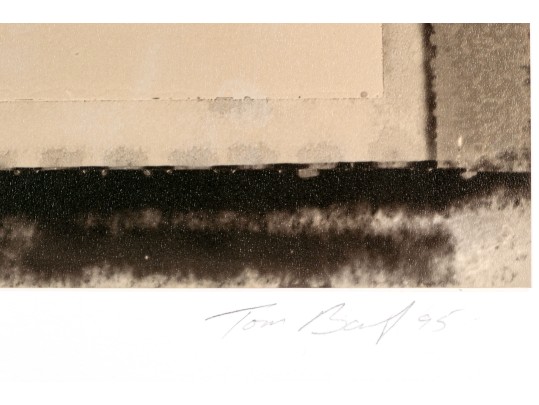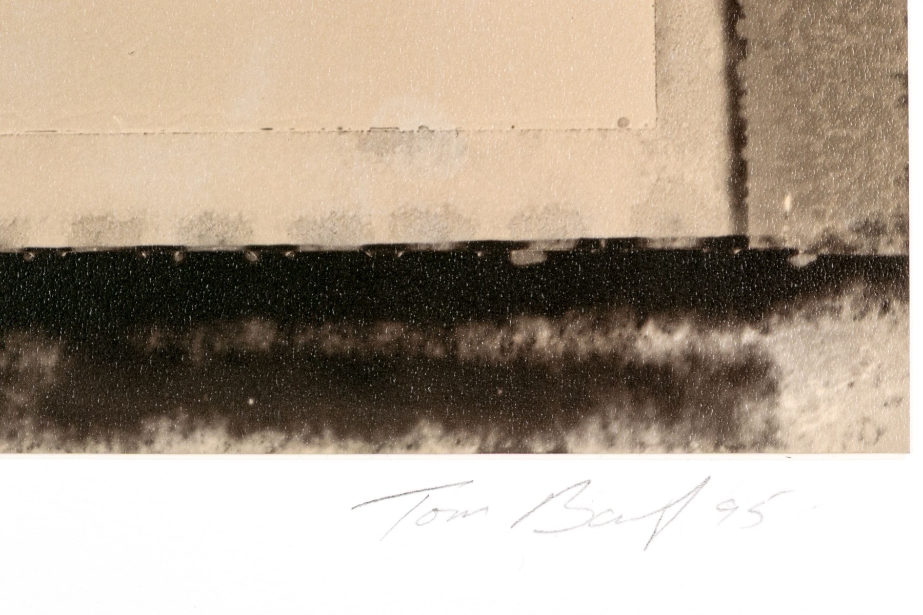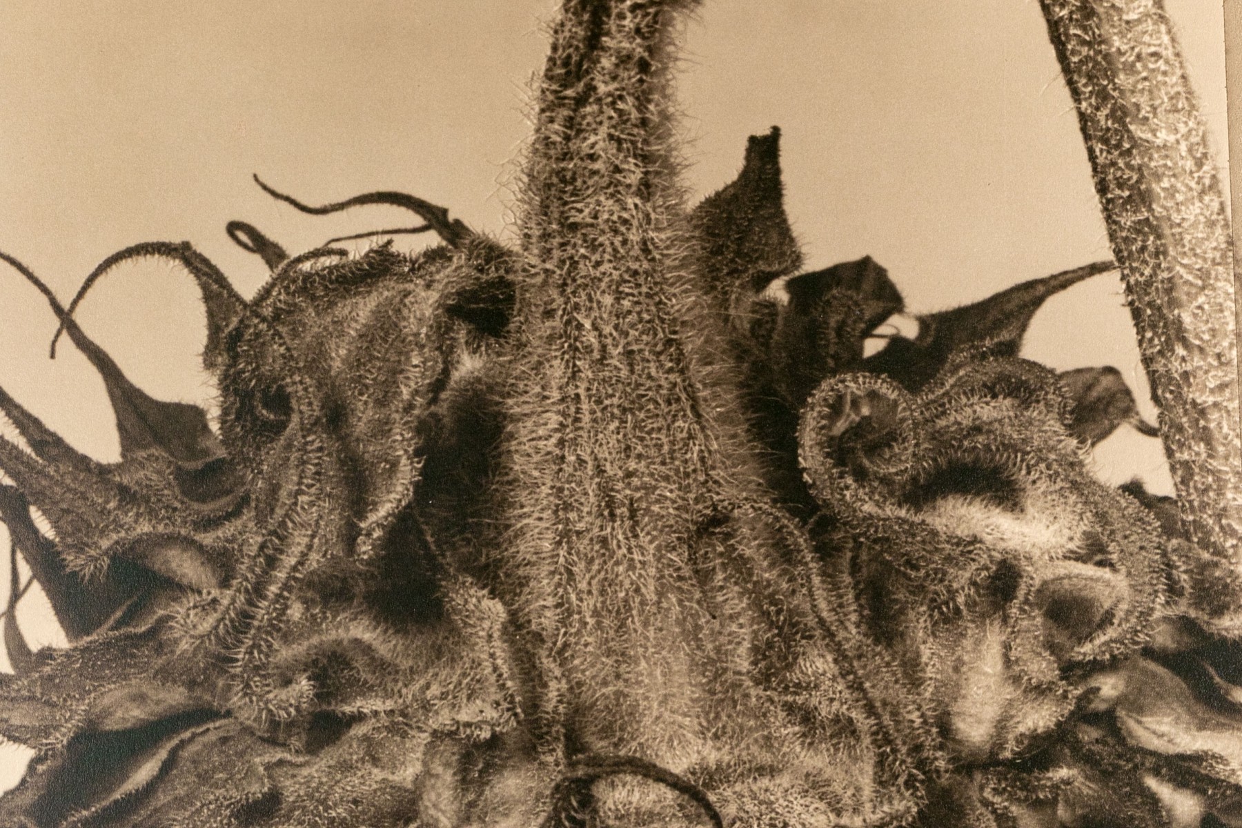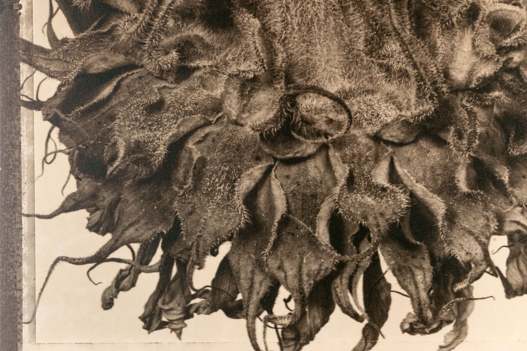 Tom Baril (American, B. 1952) "Dried Sunflower" Gelatin silver print depicting a dried sunflower head dramatically arched downwards. Signed and dated '95 lower right and stamped with the edition 1/25. Unframed.