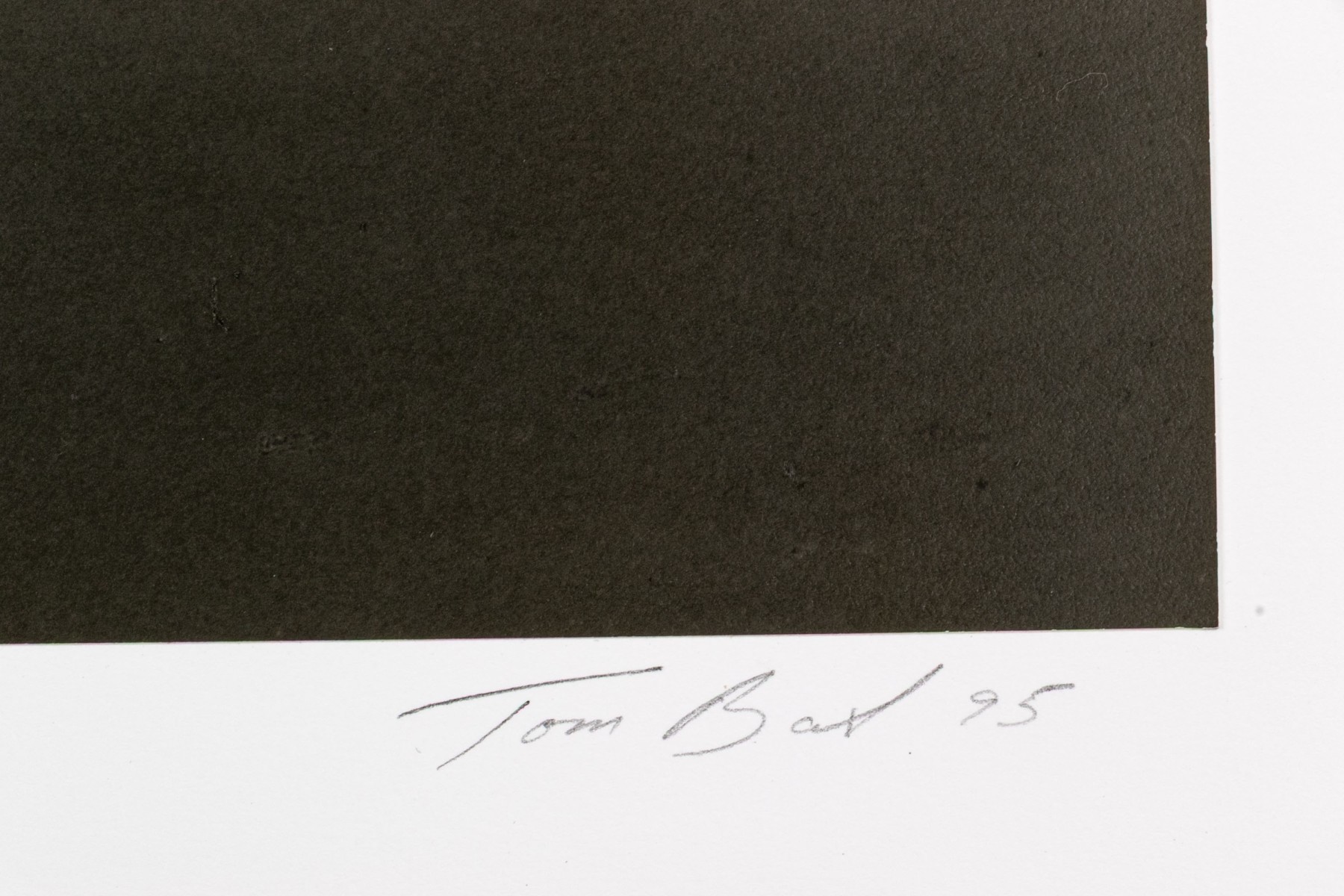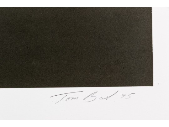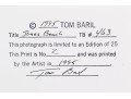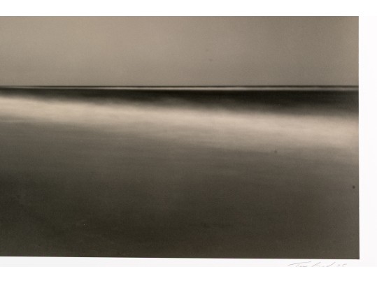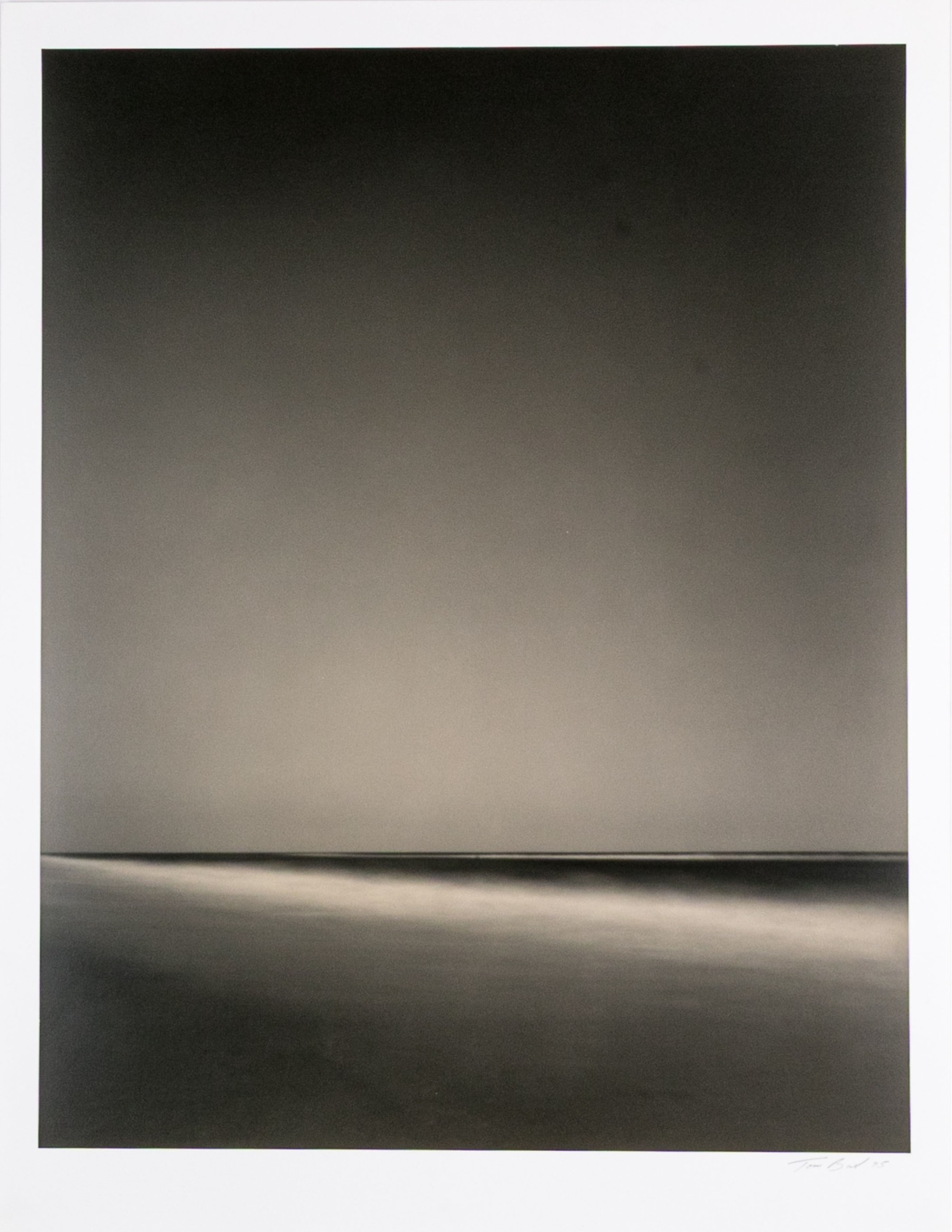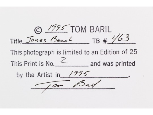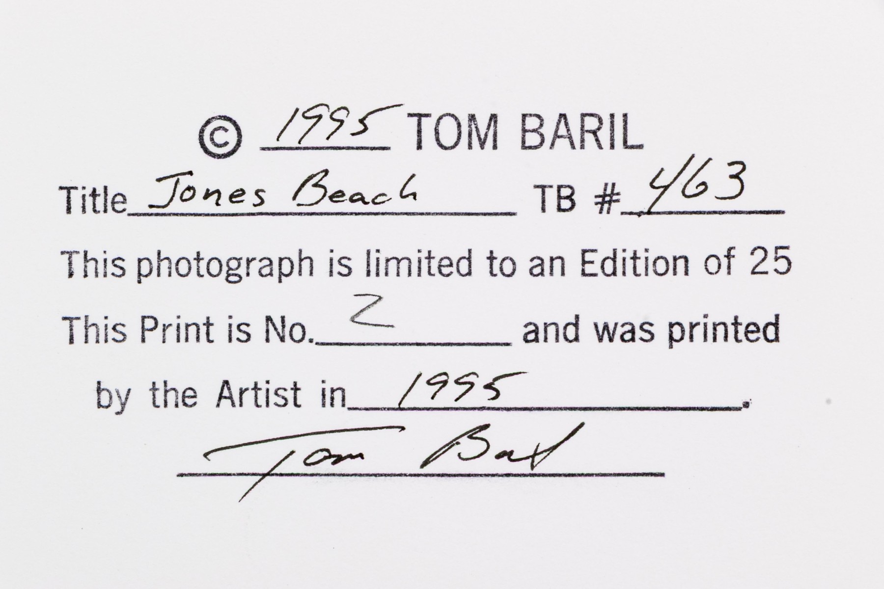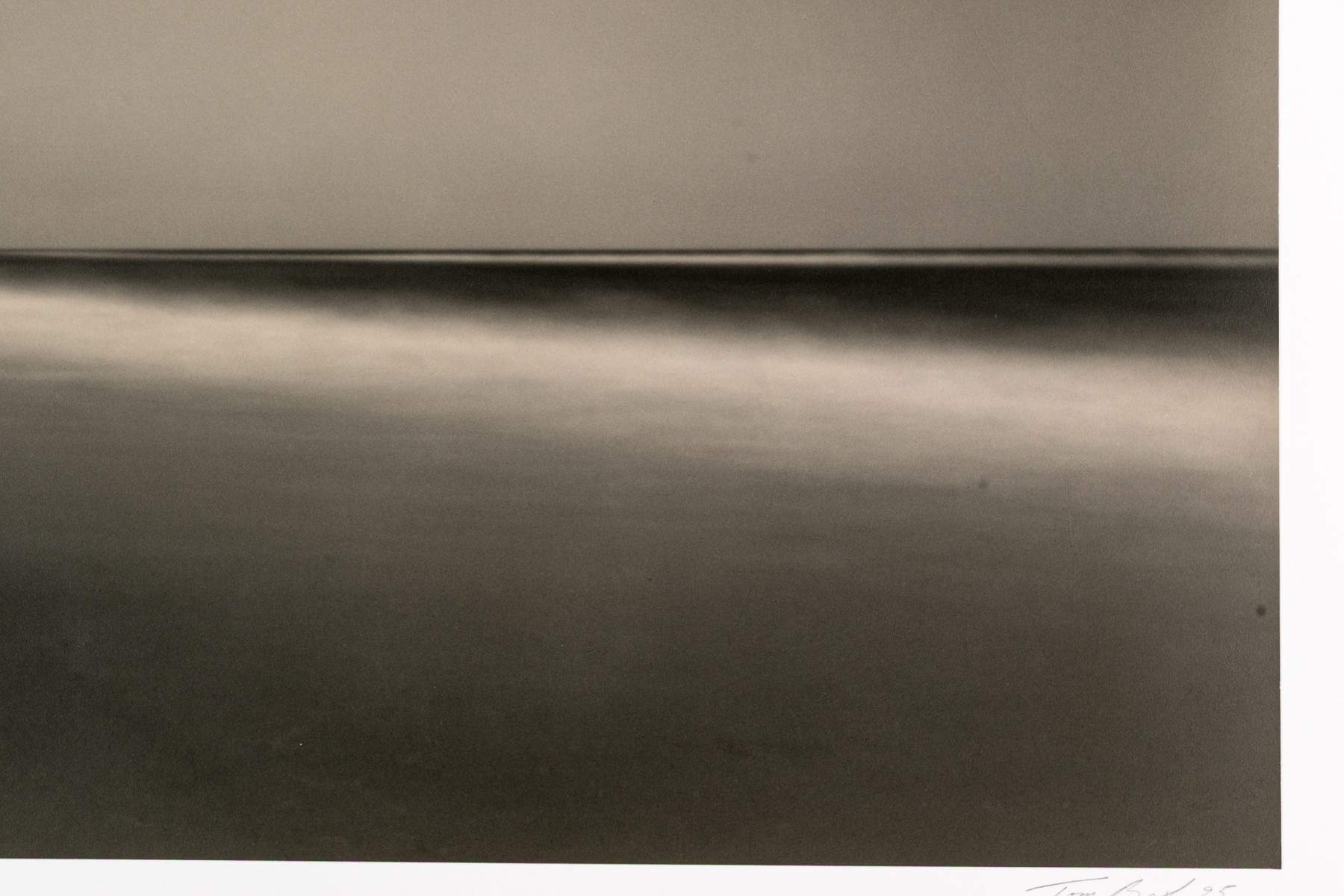 Tom Baril (American, B. 1952) "Jones Beach" Gelatin silver print depicting a view of the ocean shore with a striking diagonal gradient created by the frothing waves contrasting a straight horizon. Signed and dated '95 lower right and stamped denoting the edition 2/25. Unframed.