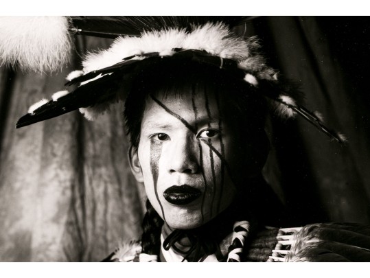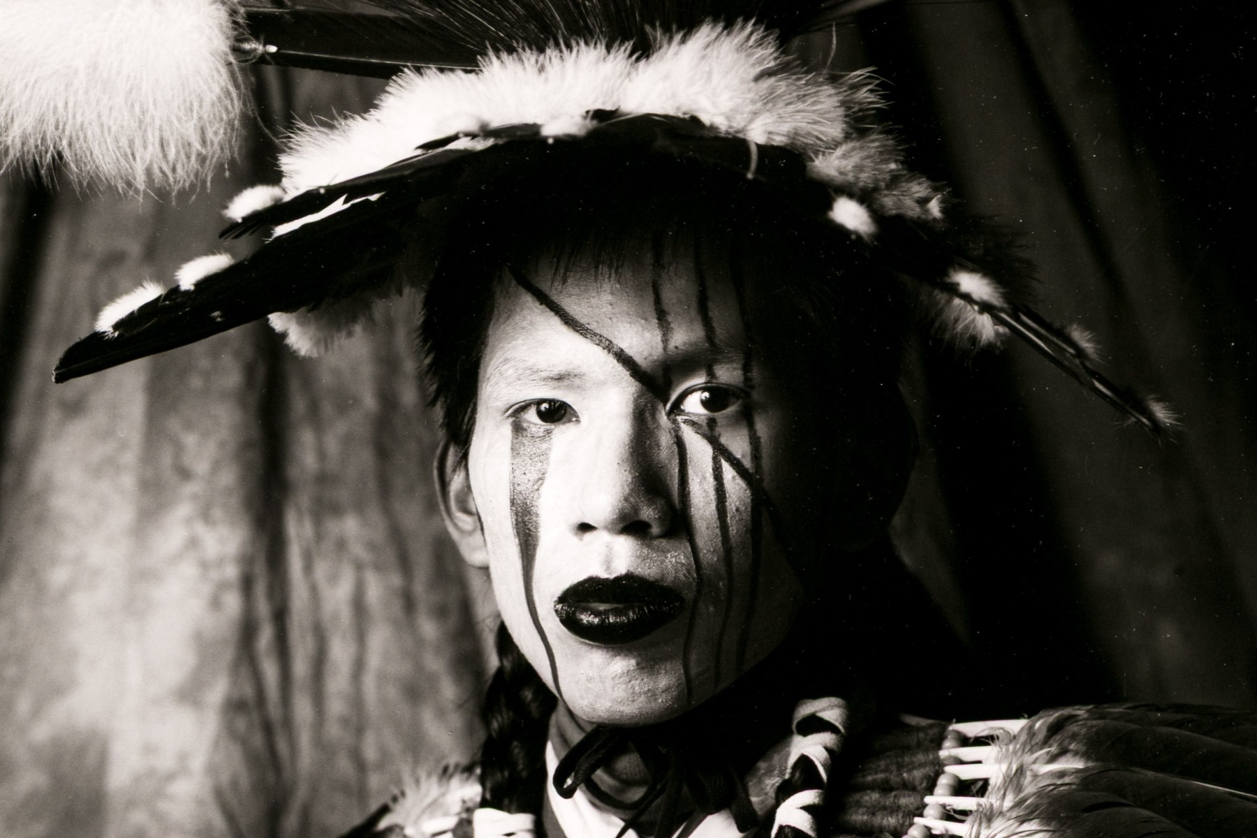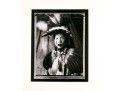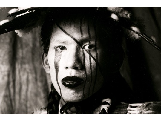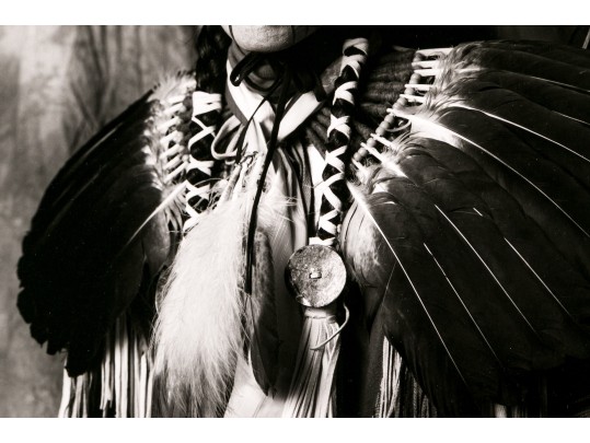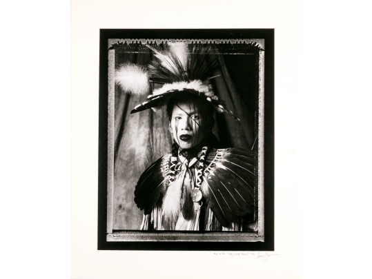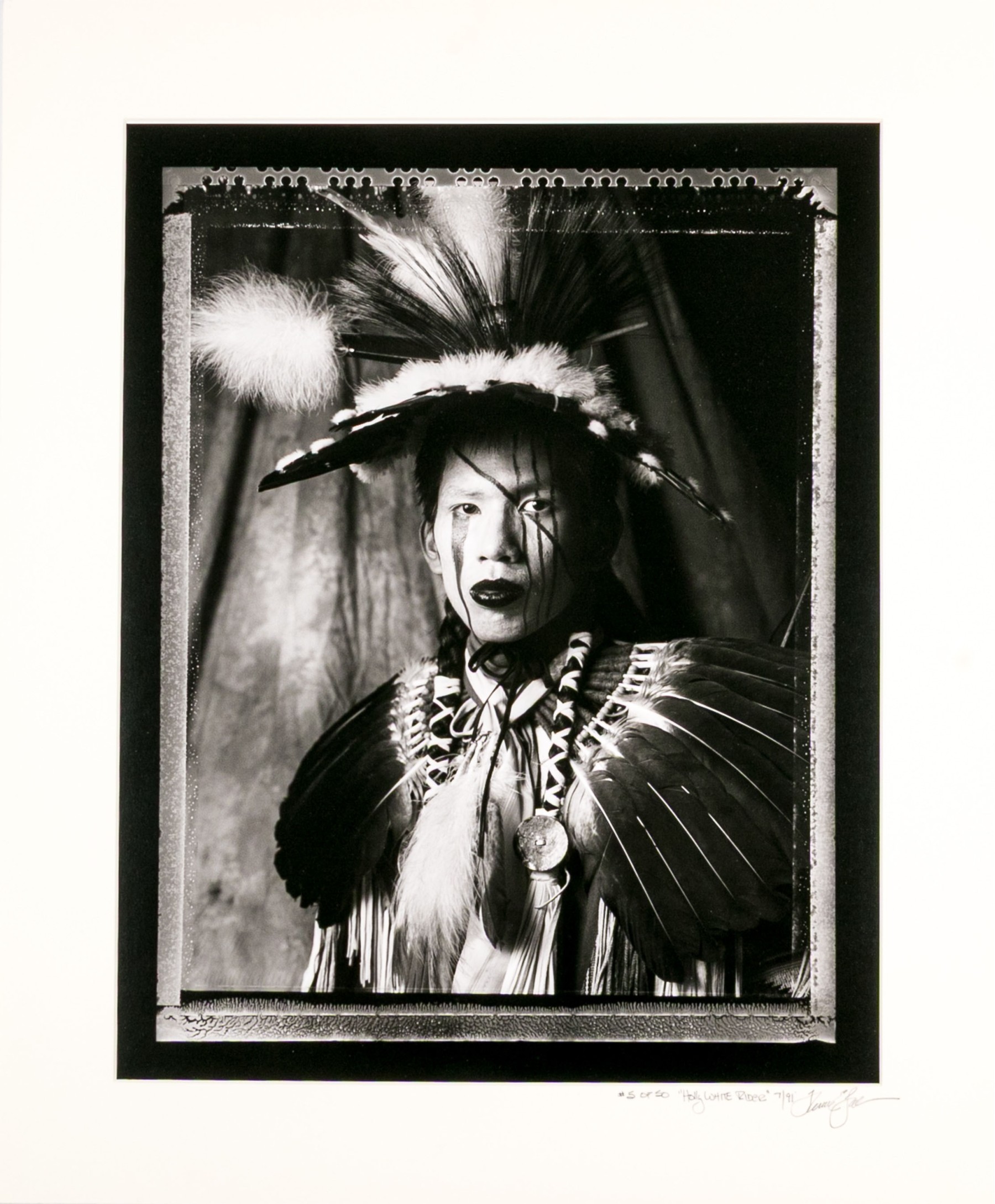 Tom Lindfors (American [WI], B. 1956) "Holy White Rider" gelatin silver print depicting a person in feathered attire with head turned slightly to the left and gaze forward towards the viewer. Pencil signed, titled, numbered #5 of 50 and 7/91 on the mat. Unframed.