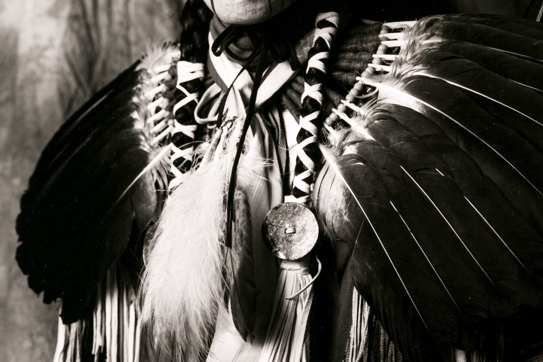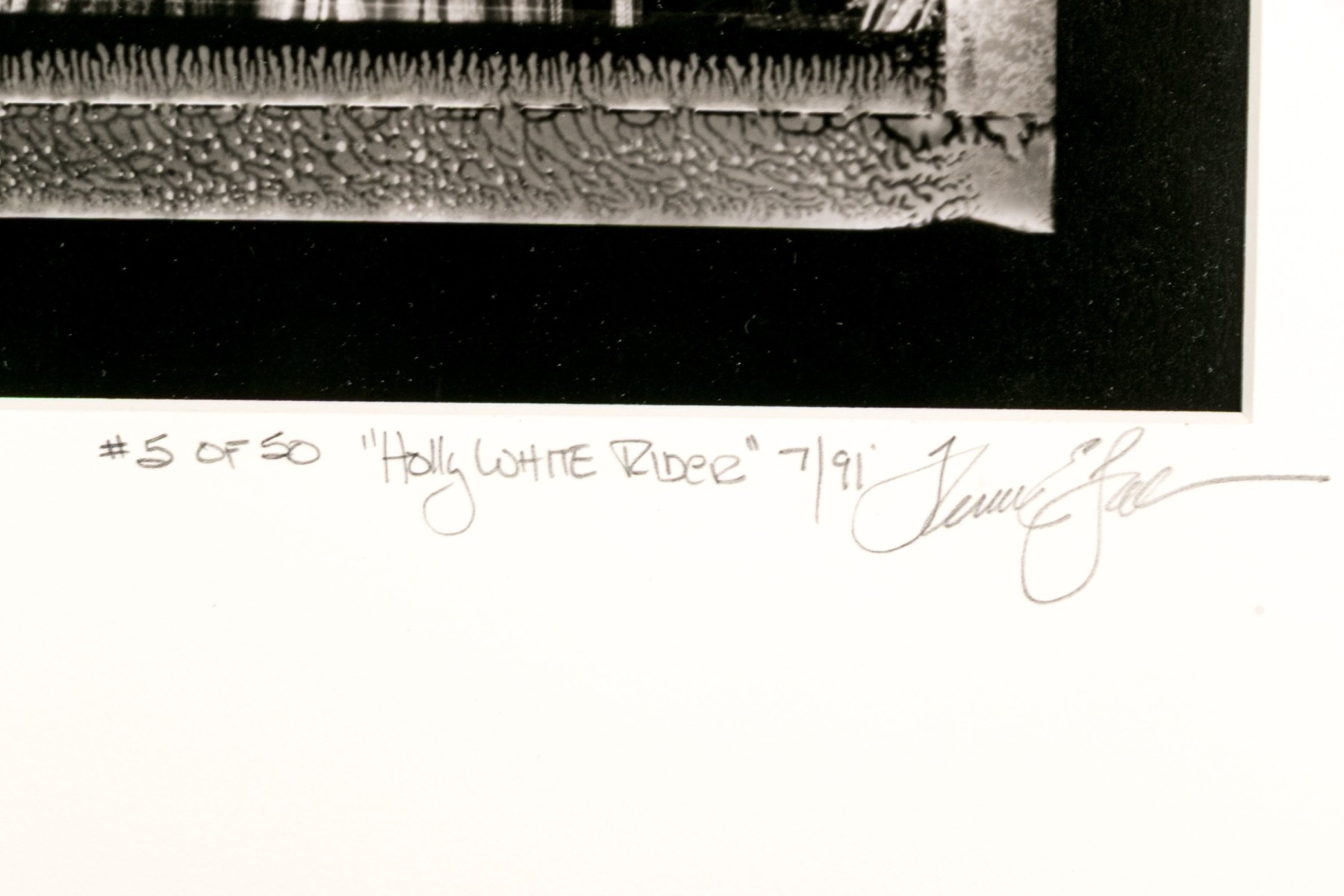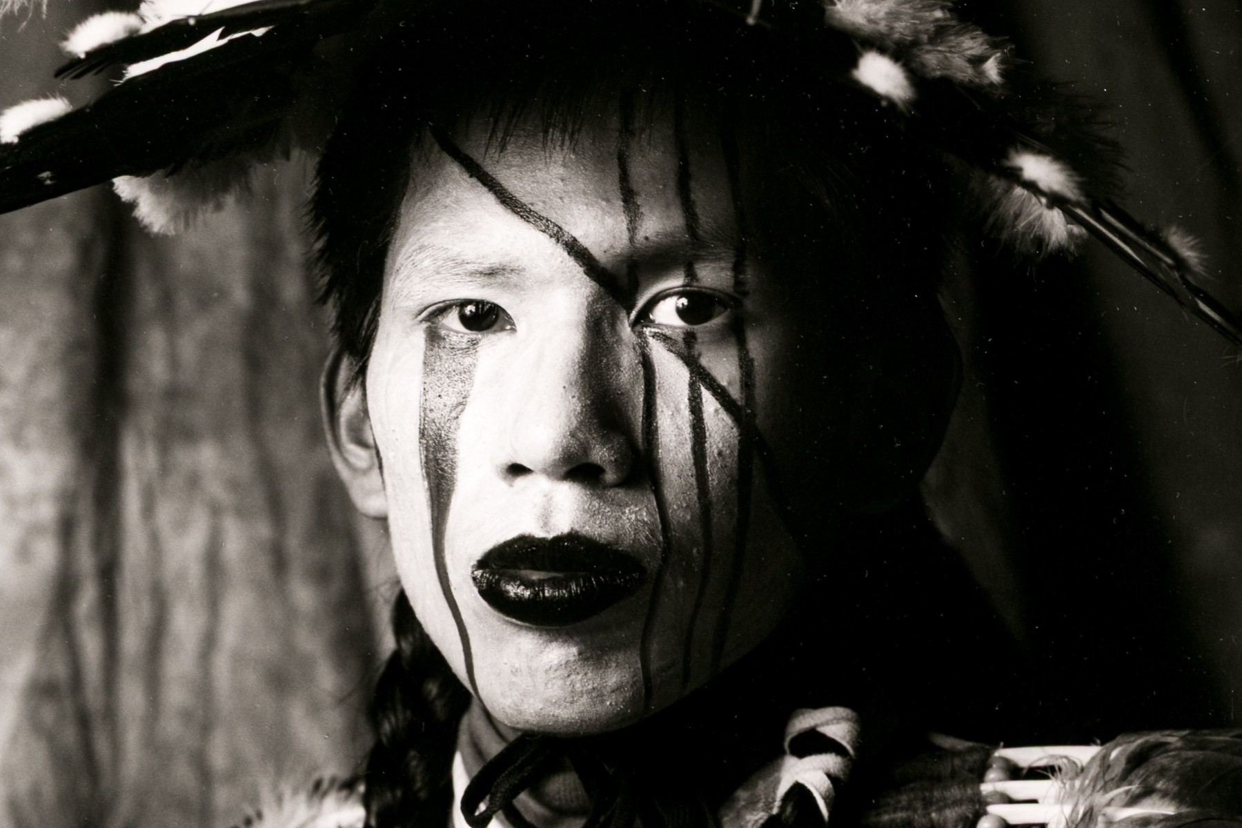 Tom Lindfors (American [WI], B. 1956) "Holy White Rider" gelatin silver print depicting a person in feathered attire with head turned slightly to the left and gaze forward towards the viewer. Pencil signed, titled, numbered #5 of 50 and 7/91 on the mat. Unframed.