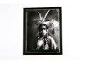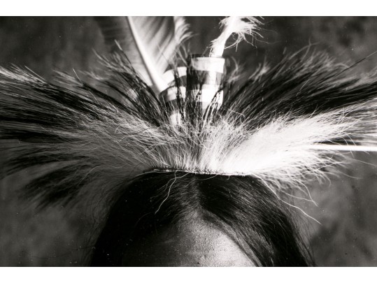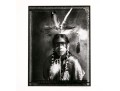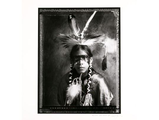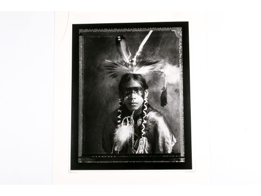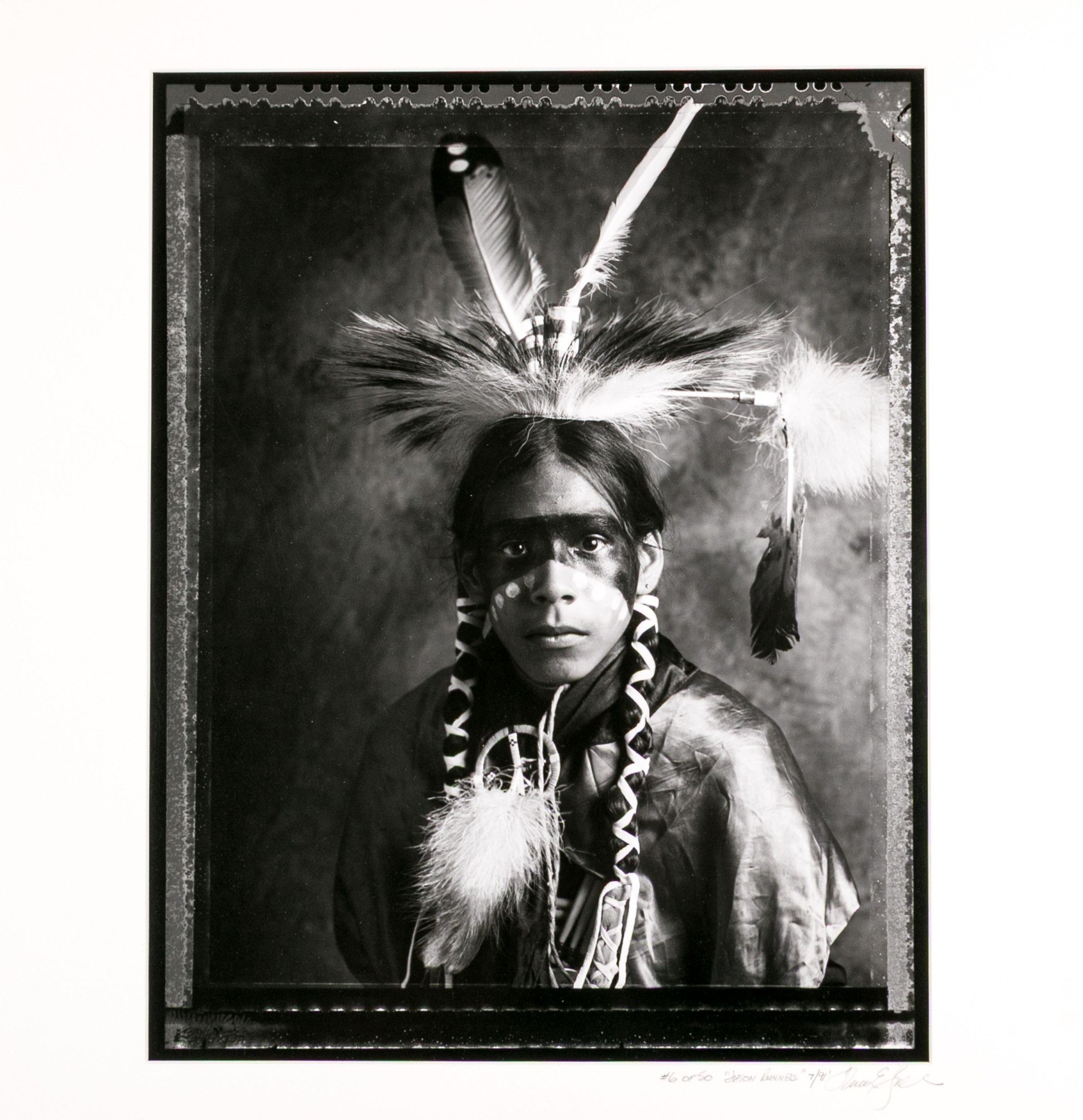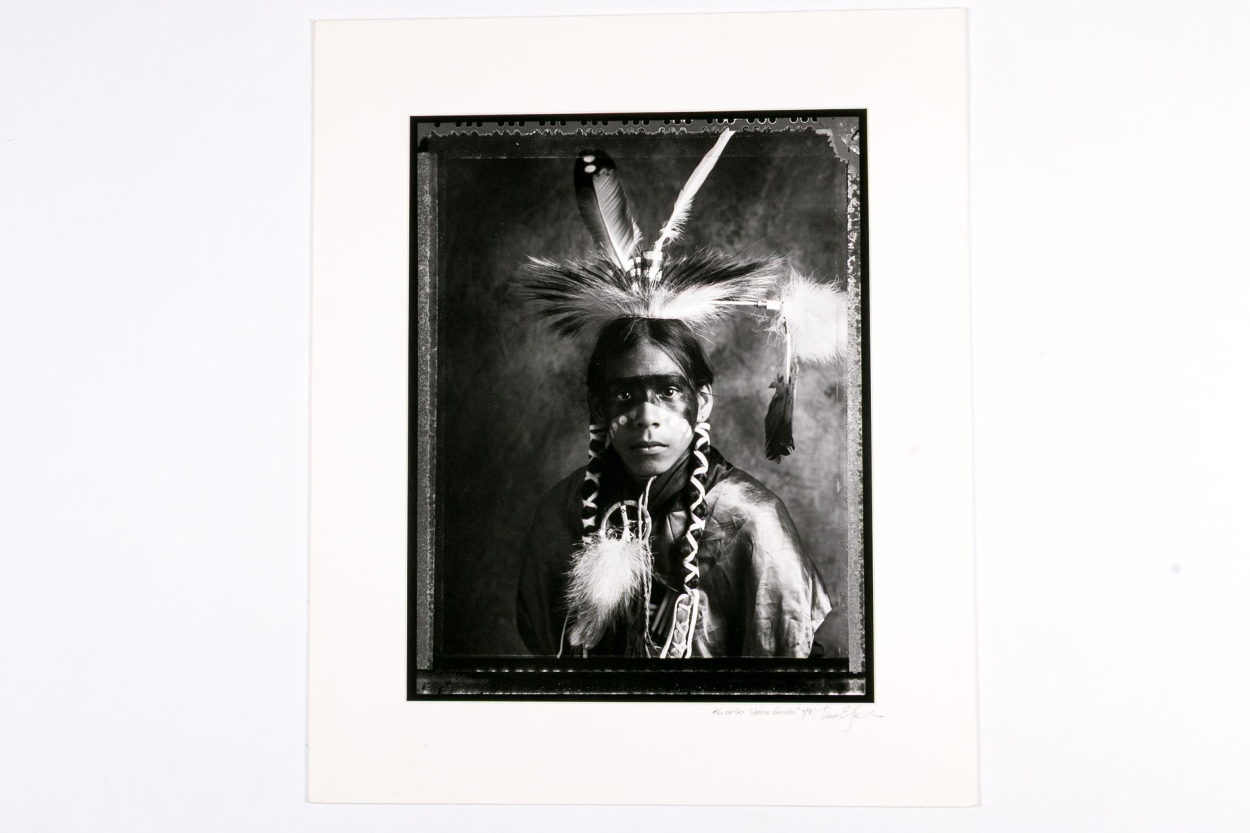 Tom Lindfors (American [WI], B. 1956) "Jason Runnels" gelatin silver print depicting a Native American person with a feather headpiece and wrapped braids standing against a neutral background. Pencil signed, titled, numbered #6 of 50 and 7/91 on the mat. Unframed.