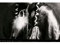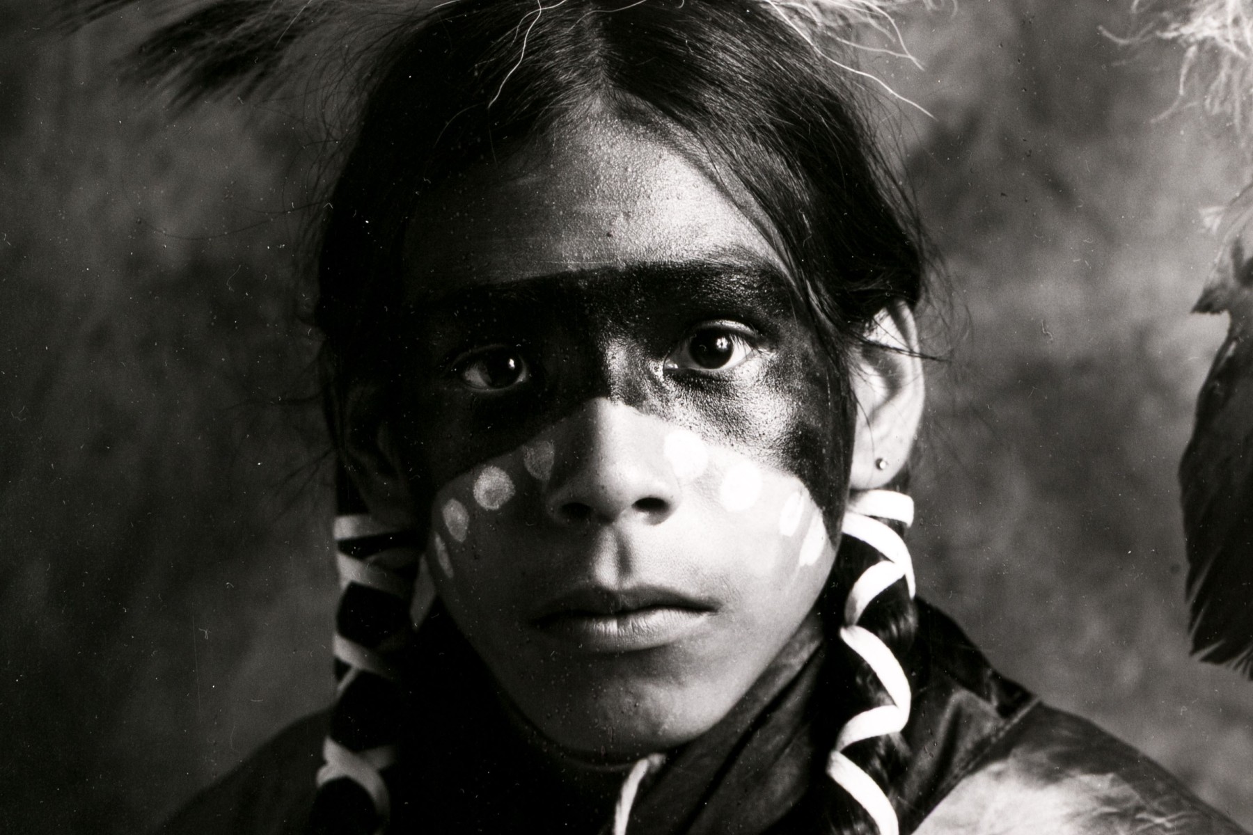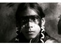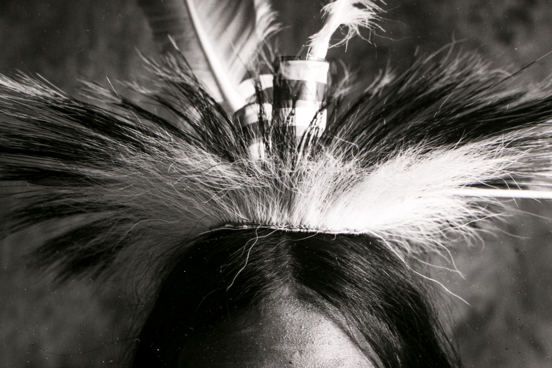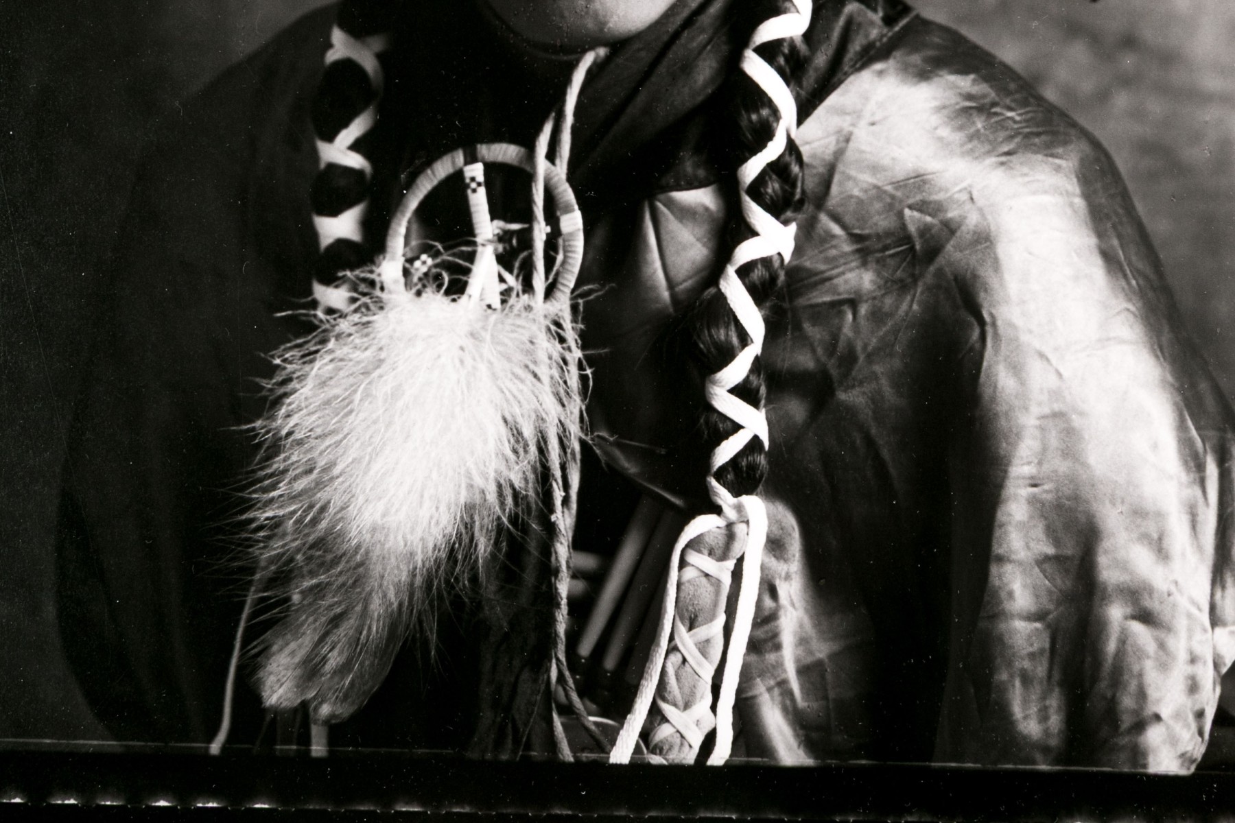 Tom Lindfors (American [WI], B. 1956) "Jason Runnels" gelatin silver print depicting a Native American person with a feather headpiece and wrapped braids standing against a neutral background. Pencil signed, titled, numbered #6 of 50 and 7/91 on the mat. Unframed.