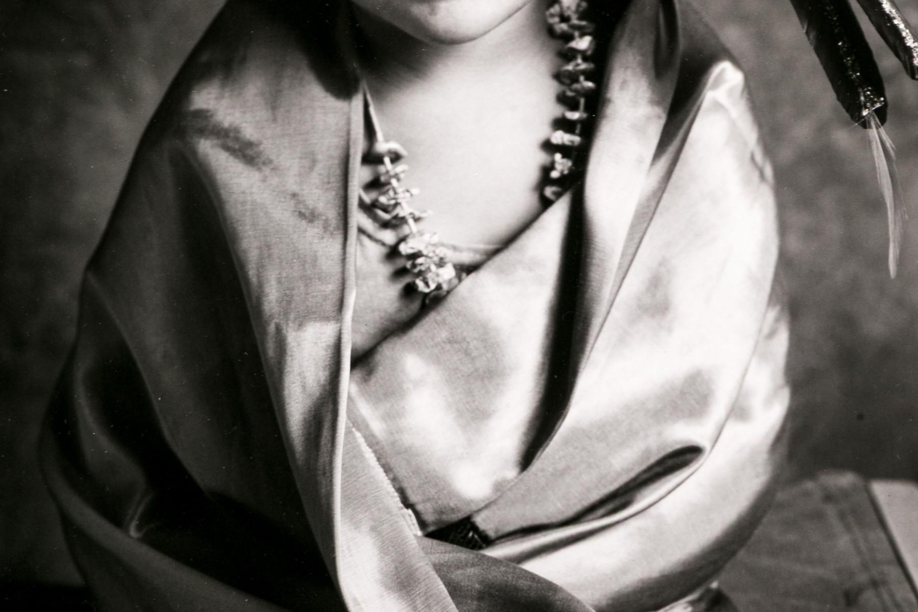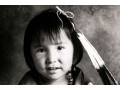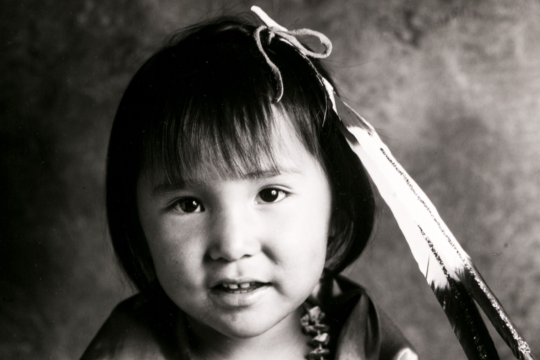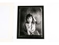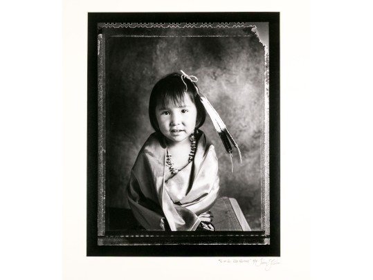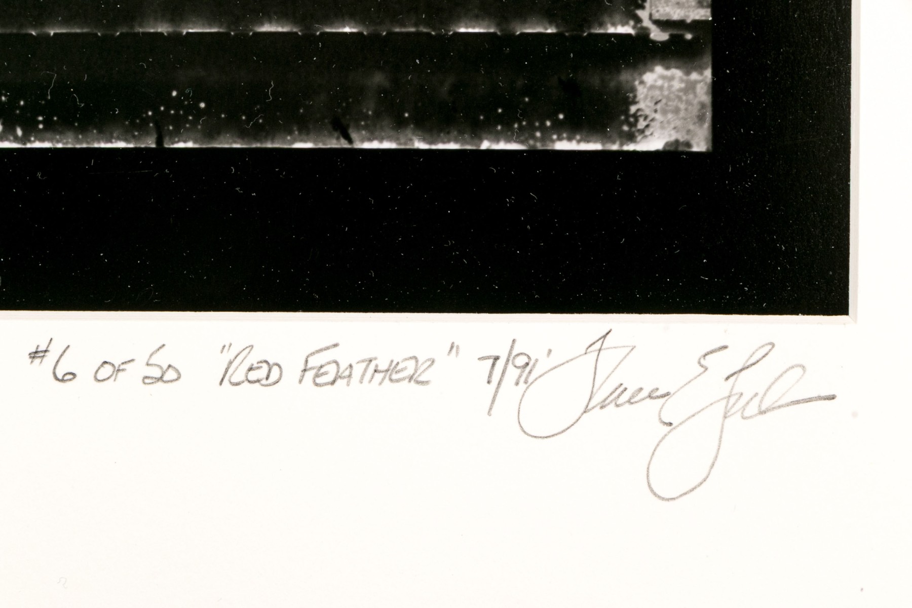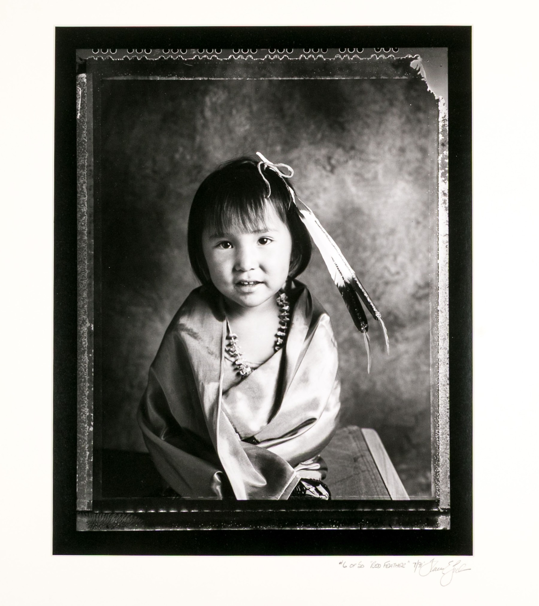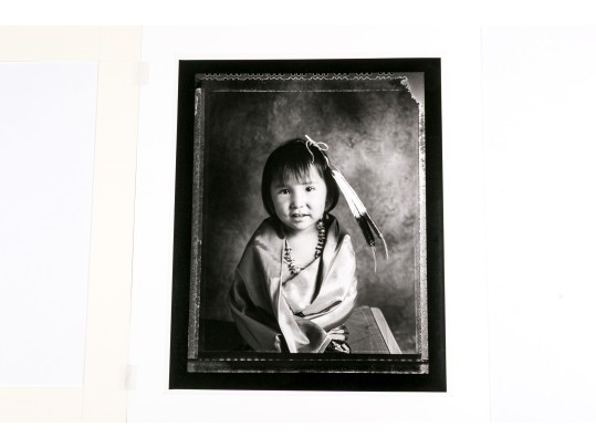 Tom Lindfors (American [WI], B. 1956) "Red Feather" gelatin silver print depicting a young Native American child wearing feathers in their hair, a necklace, and a wrapped cloth. Pencil signed, titled, numbered #6 of 50 and 7/91 on the mat. Unframed.