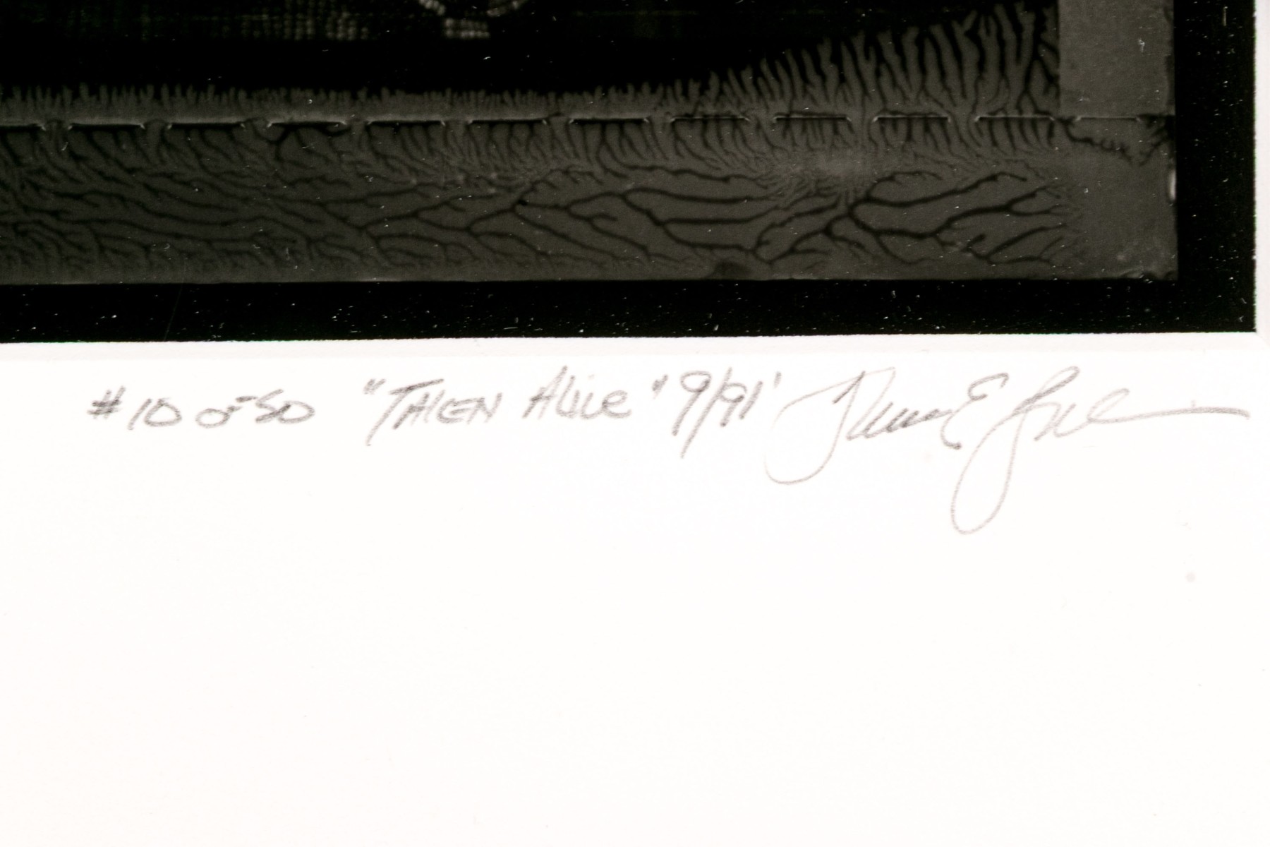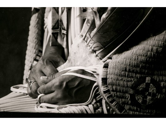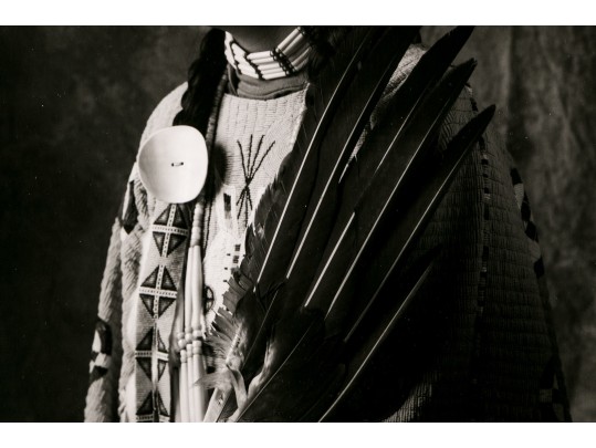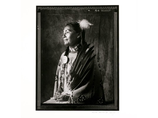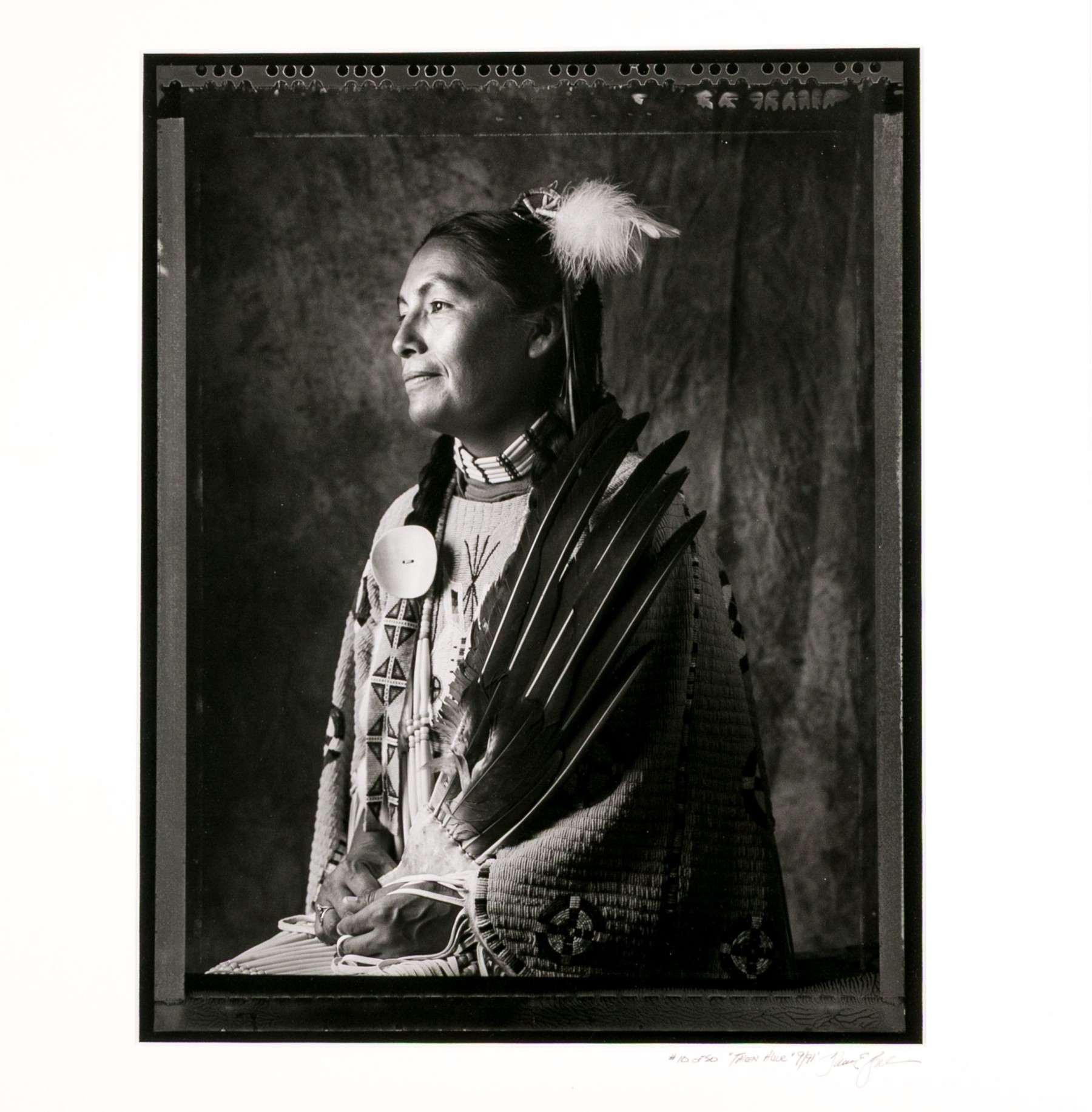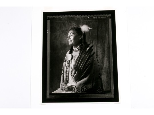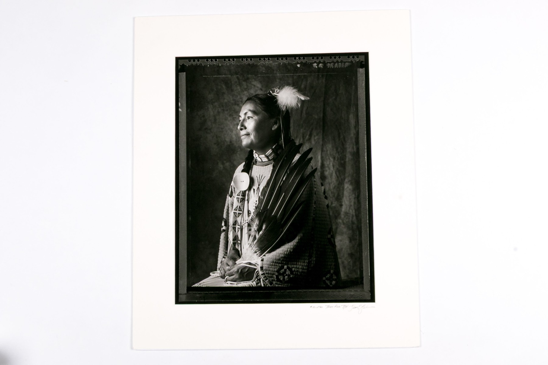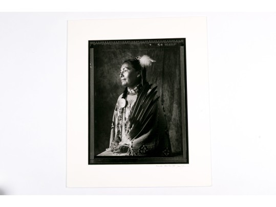 Tom Lindfors (American [WI], B. 1956) "Then Alive" gelatin silver print depicting a Native American person in traditional attire seated in three quarter profile. Pencil signed, titled, numbered #10 of 50 and 9/91 on the mat. Unframed.