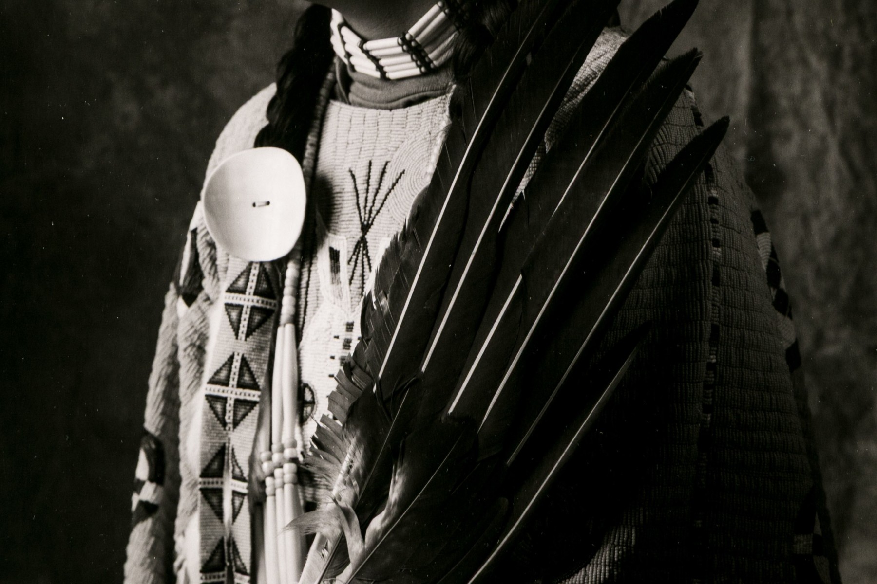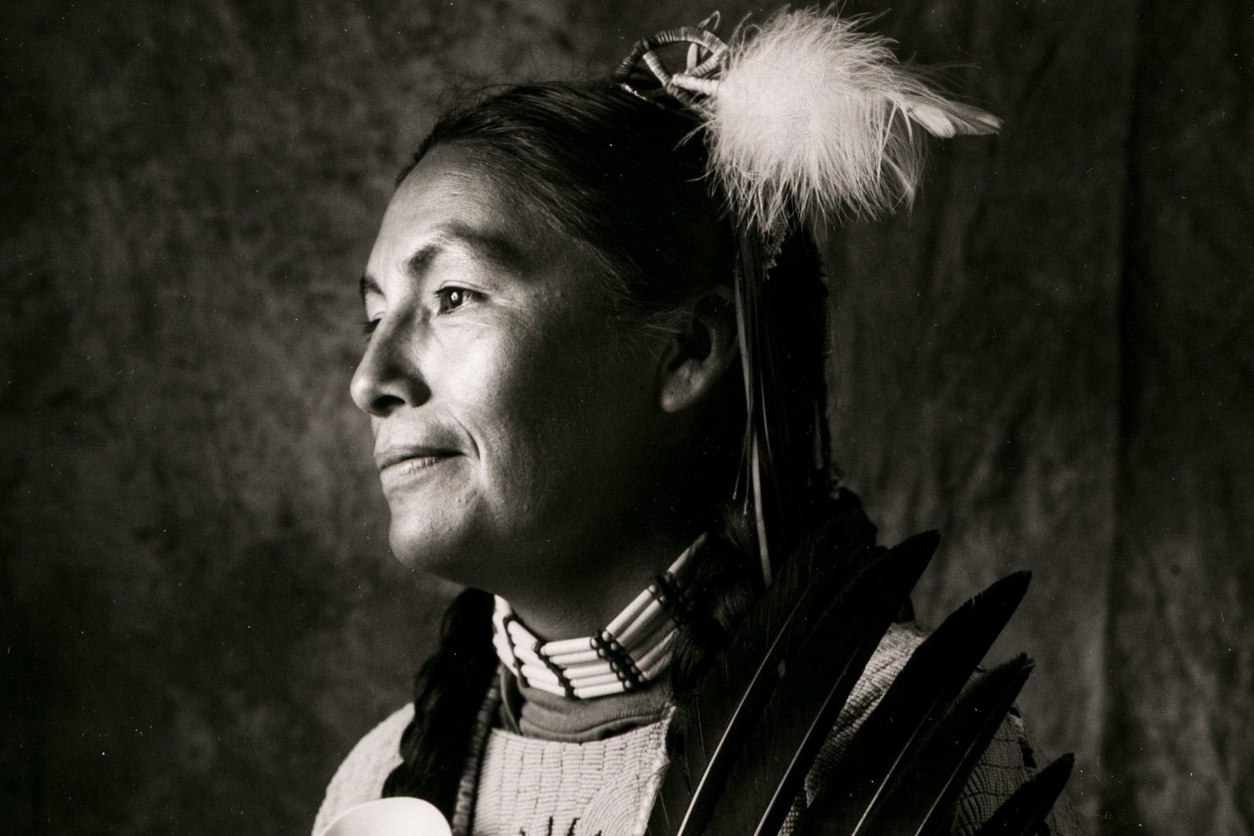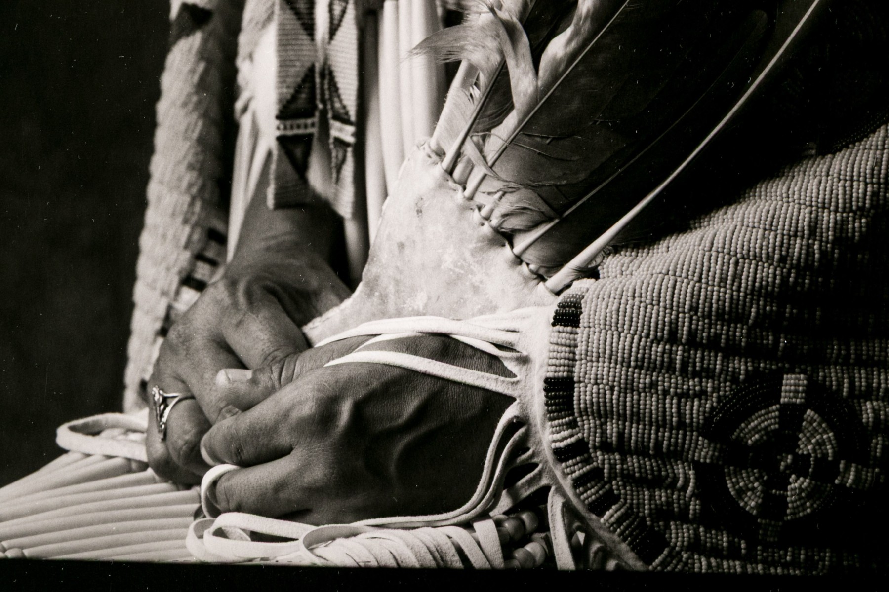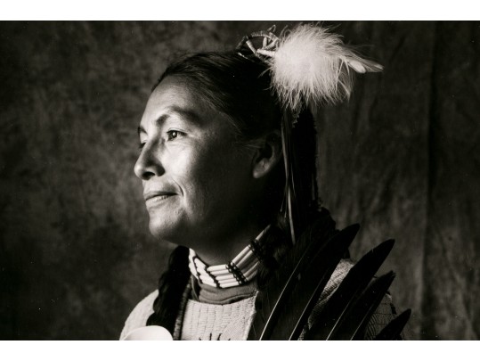 Tom Lindfors (American [WI], B. 1956) "Then Alive" gelatin silver print depicting a Native American person in traditional attire seated in three quarter profile. Pencil signed, titled, numbered #10 of 50 and 9/91 on the mat. Unframed.