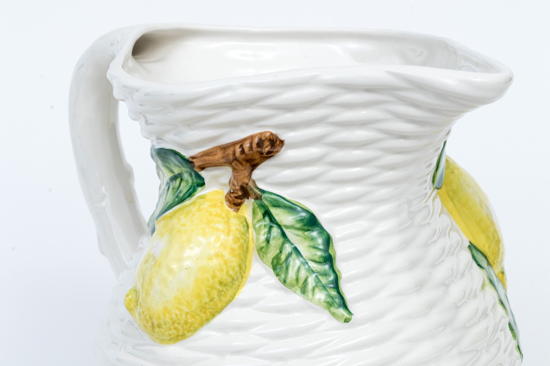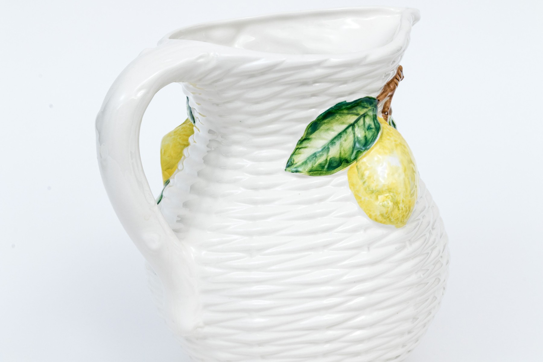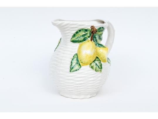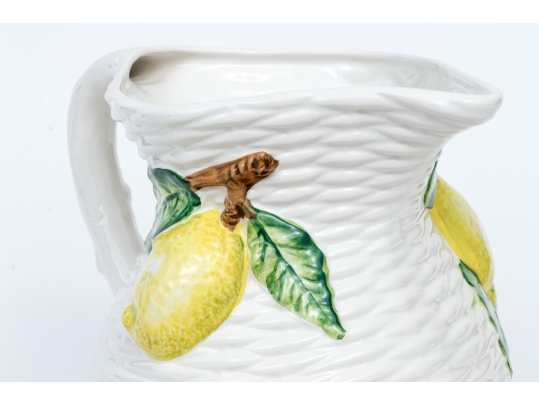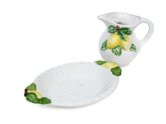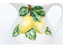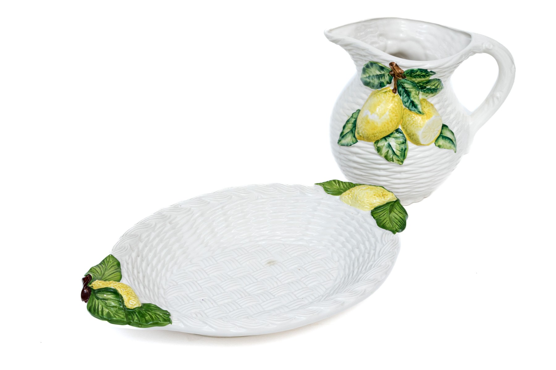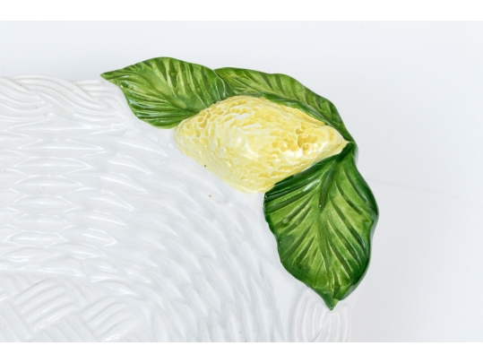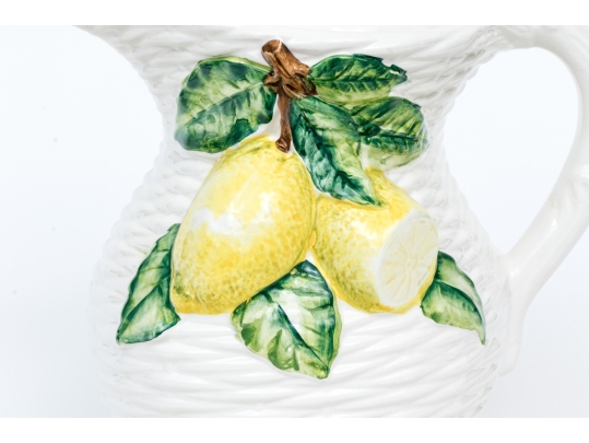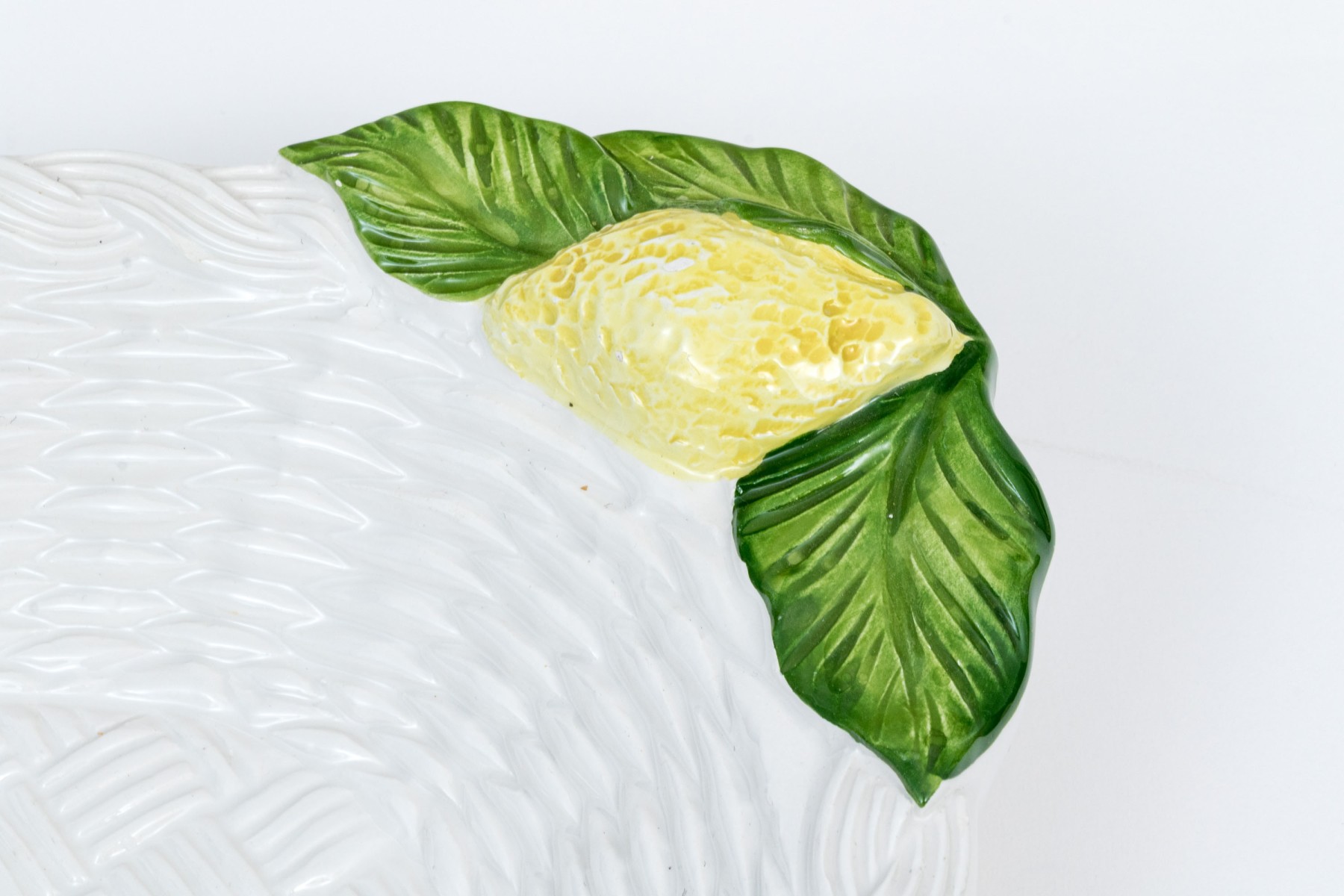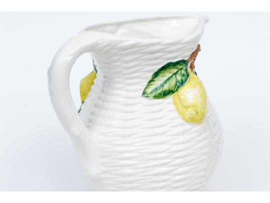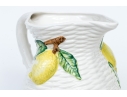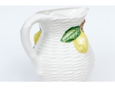 Basket weave ceramic pieces with lemon detail. Platter: 15” long x 10” wide, small nick to the lemon leaf on the top; Pitcher measures: 8” high